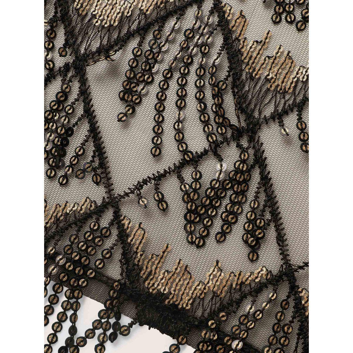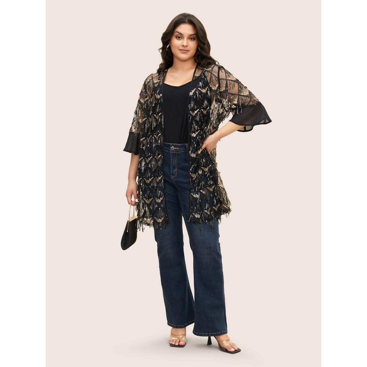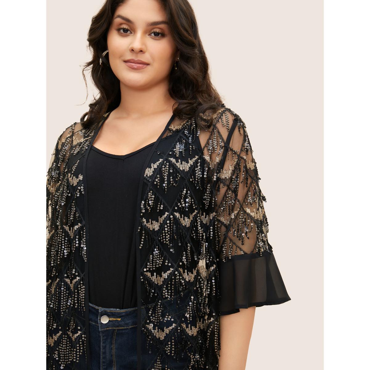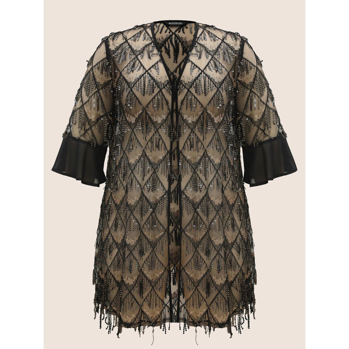 Plus Size Sequin Mesh Patchwork Tassel Trim Cover Up Black Women Vacation Resort Cover Ups Bloomchic 14-16/1X