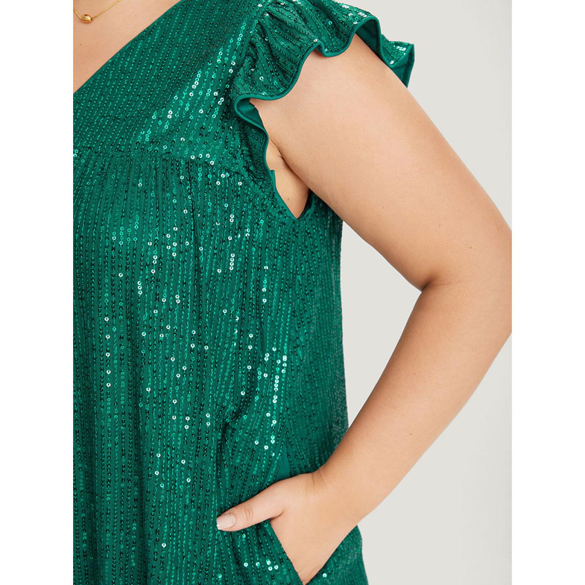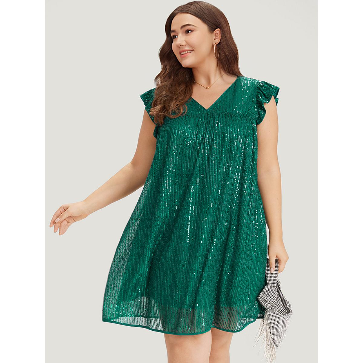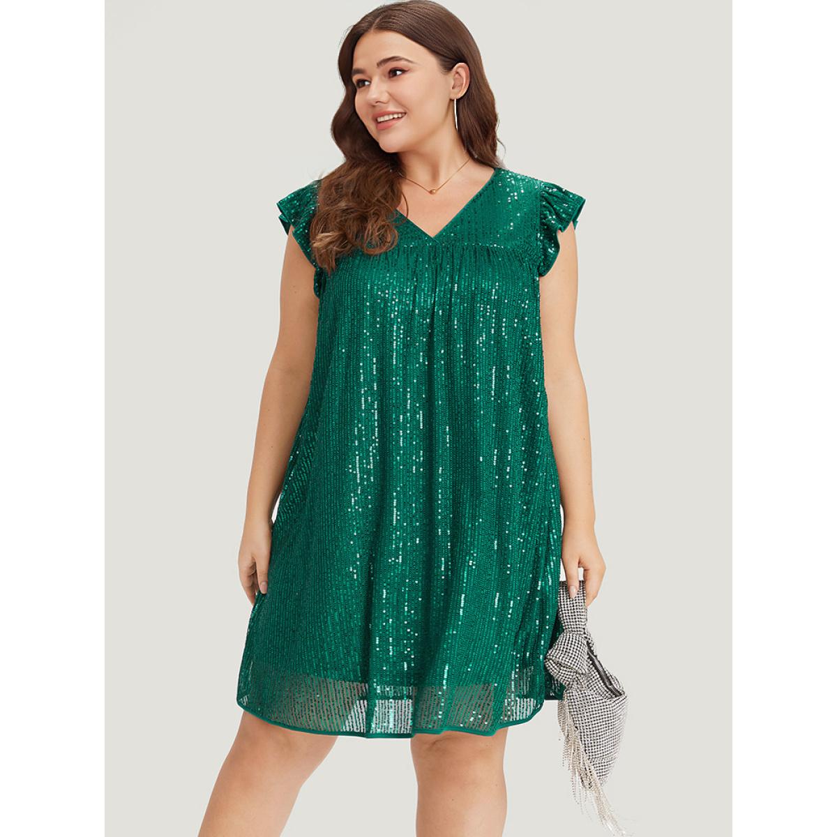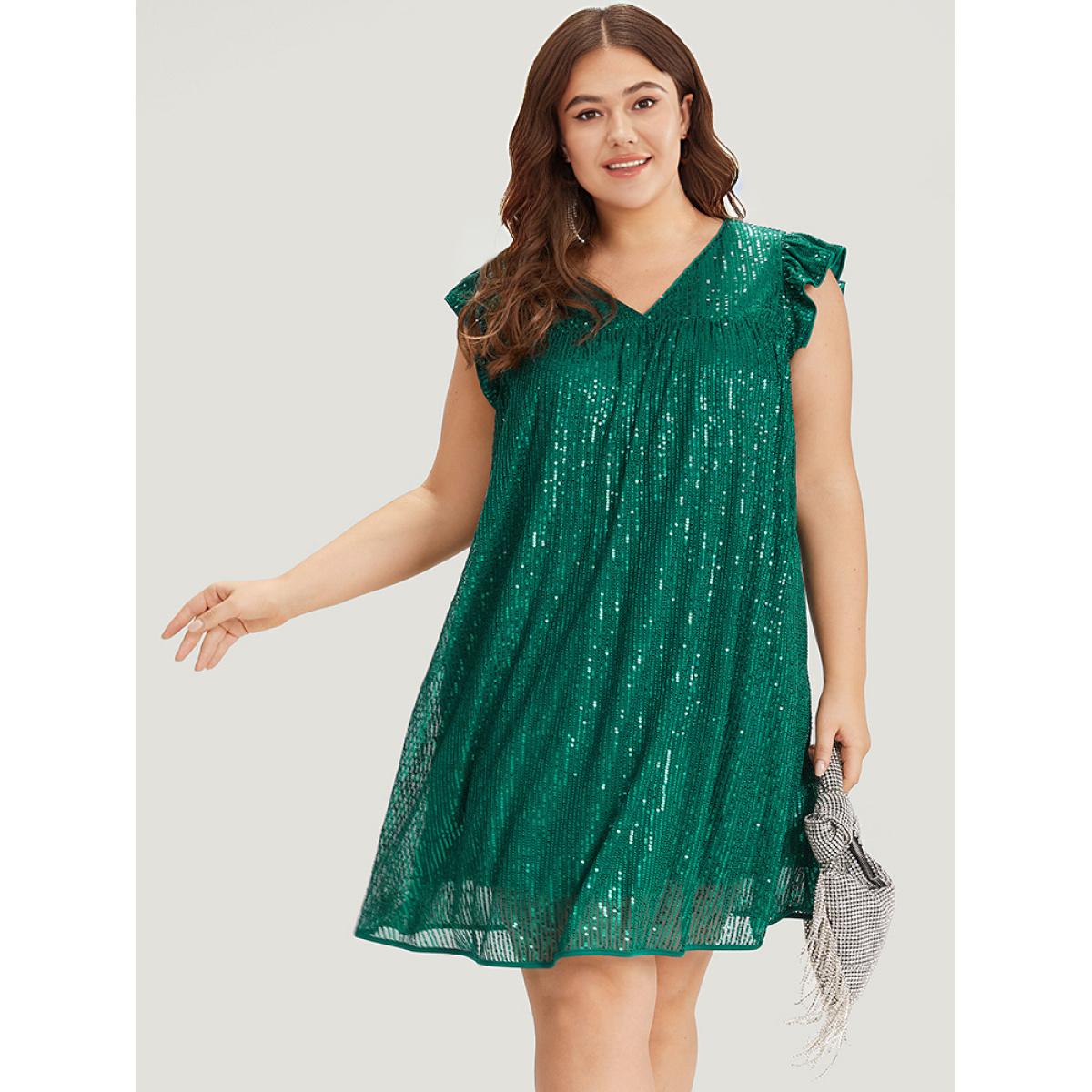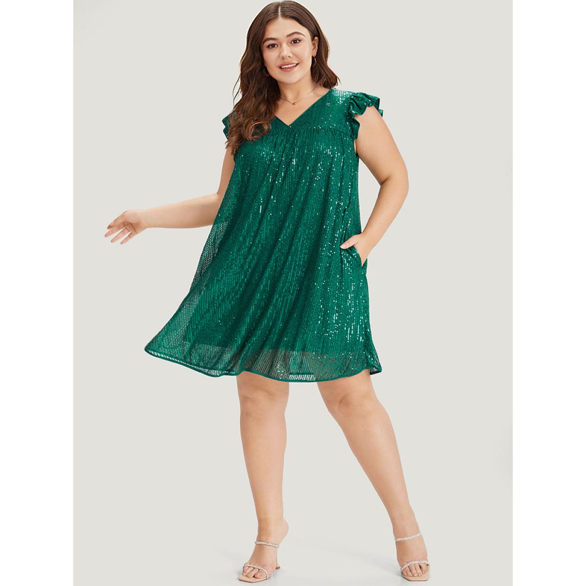 Plus Size Sequin Mesh Pocket Cap Sleeve Ruffle Trim Dress Emerald Women Party Plain V-neck Half Sleeve Curvy Knee Dress BloomChic 10/M