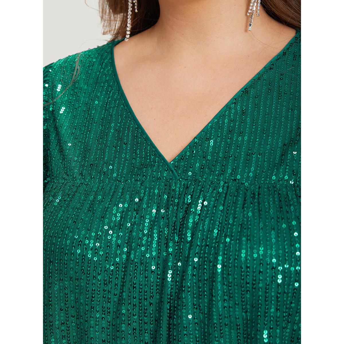 Plus Size Sequin Mesh Pocket Cap Sleeve Ruffle Trim Dress Emerald Women Party Plain V-neck Half Sleeve Curvy Knee Dress BloomChic 10/M Product Image