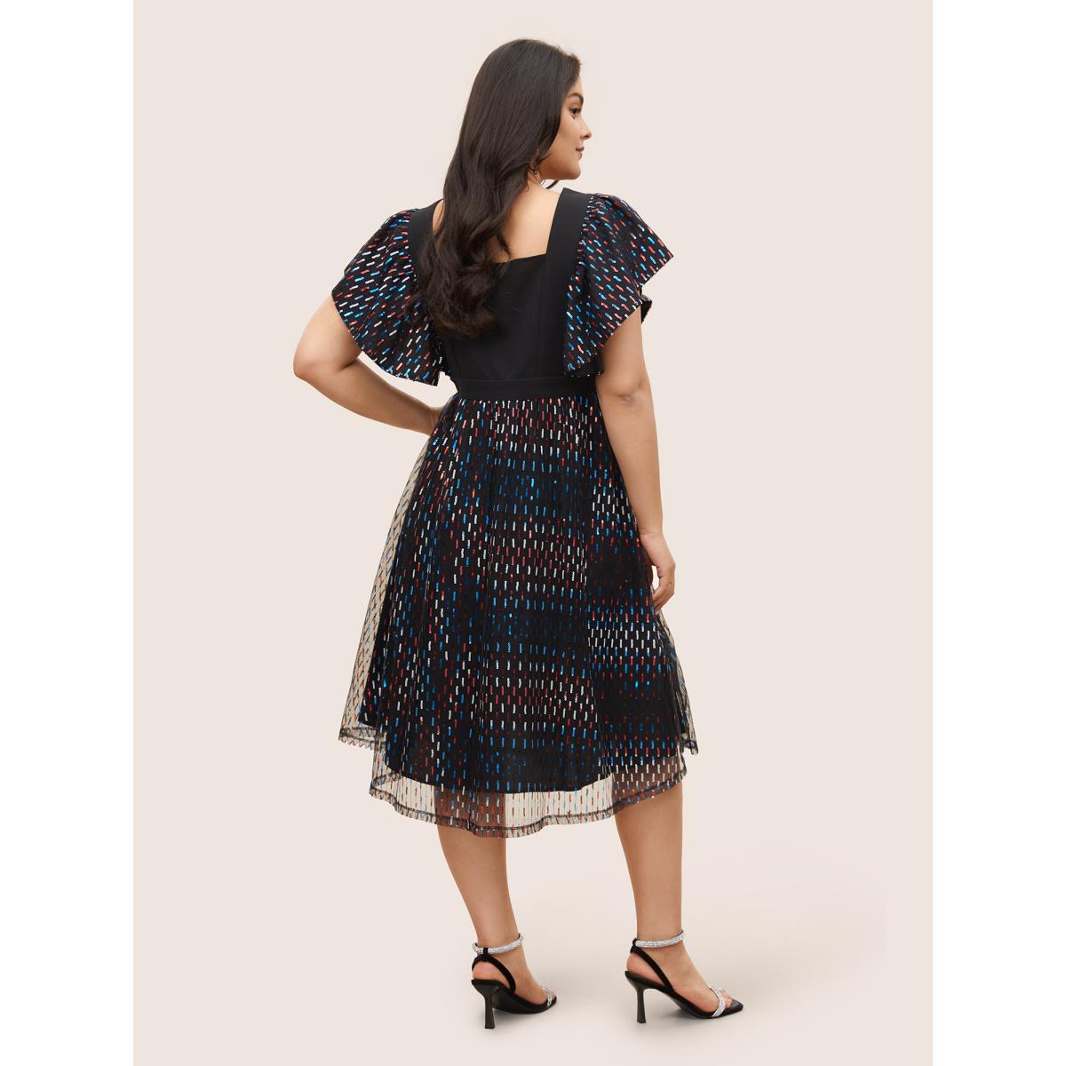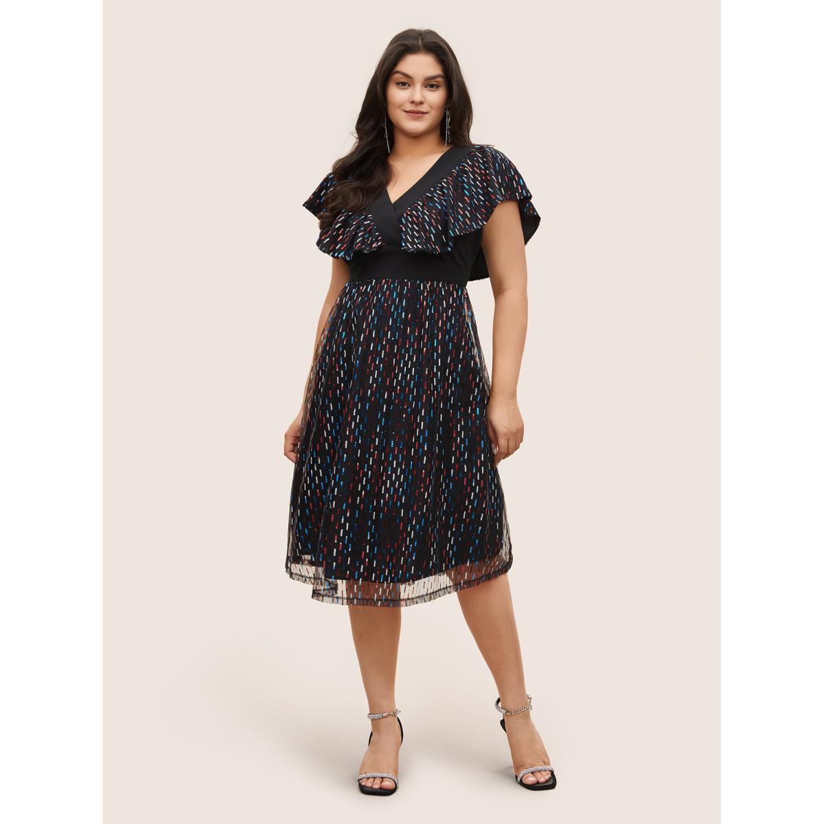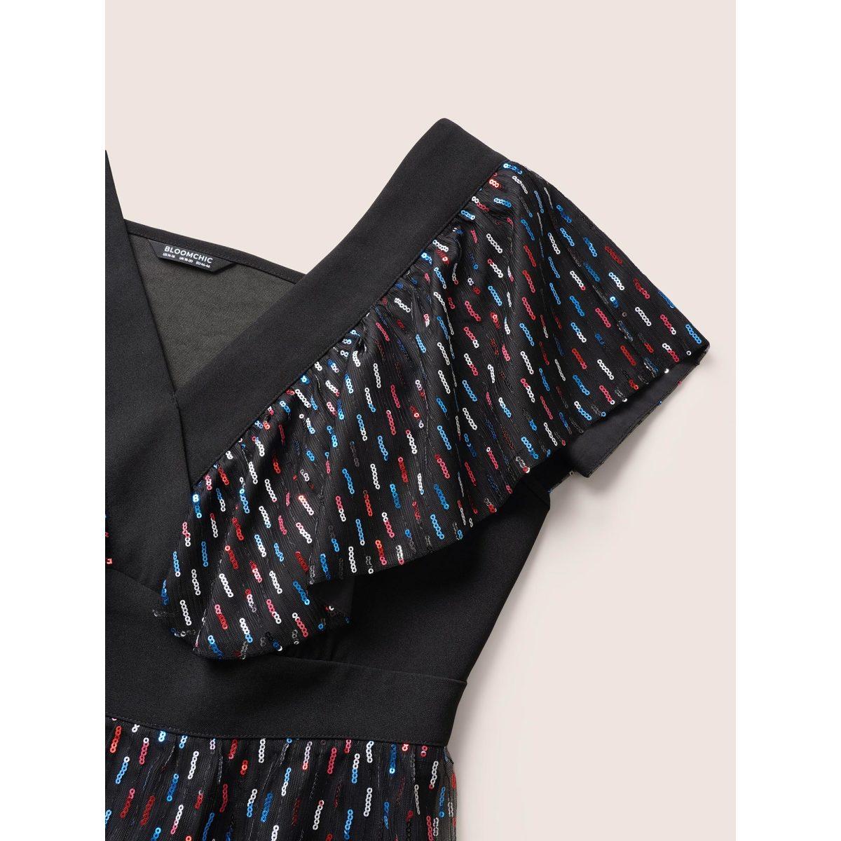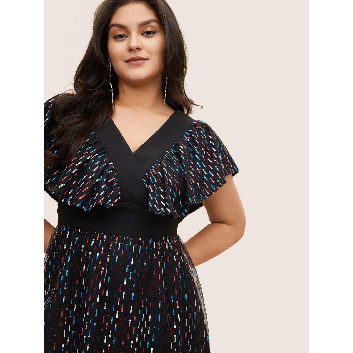 Plus Size Sequin Patchwork Pocket Flutter Cap Sleeve Dress Black Women Cocktail See through V-neck Cap Sleeve Curvy Midi Dress BloomChic 10/M