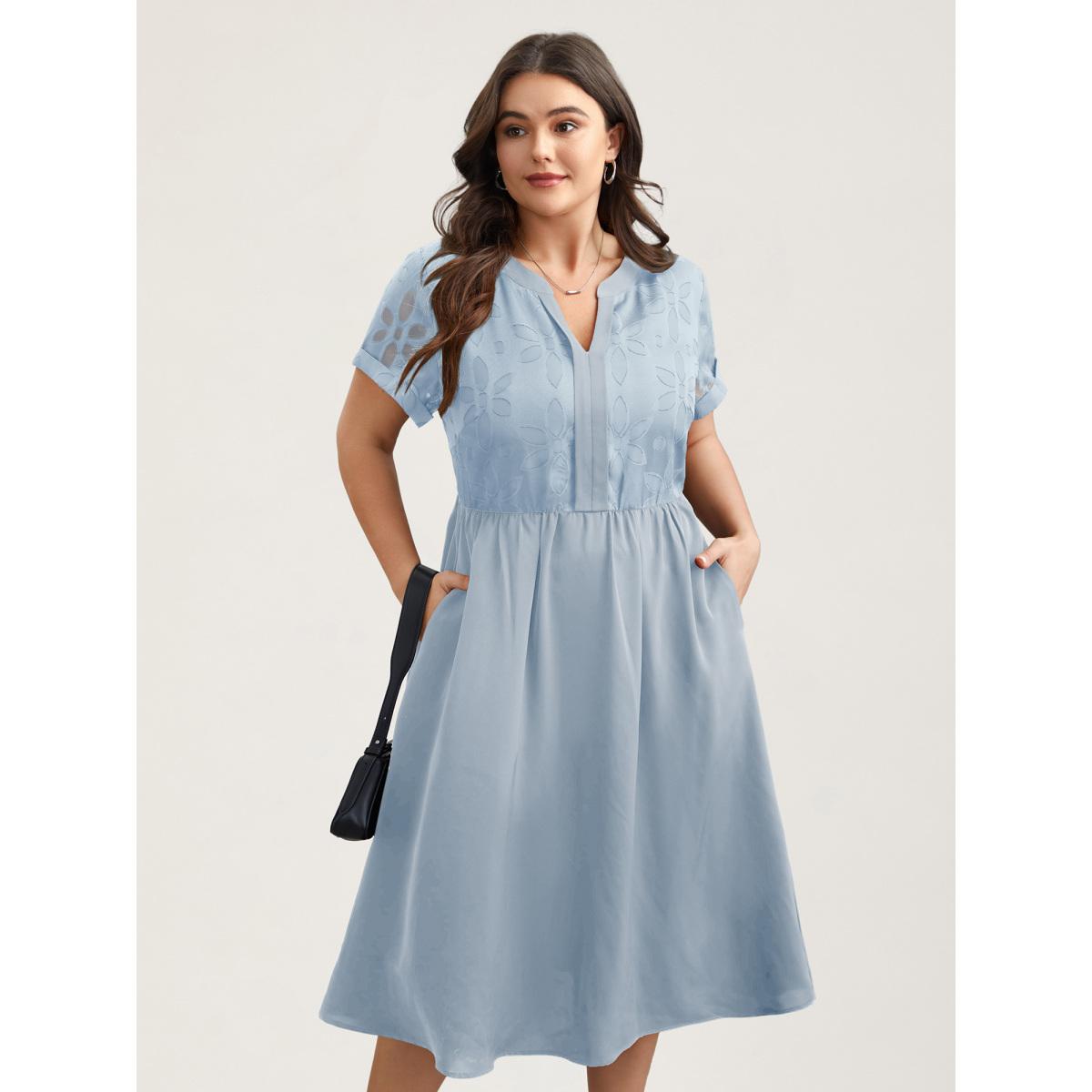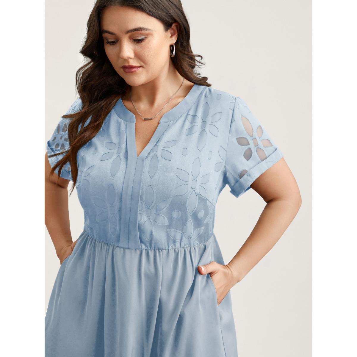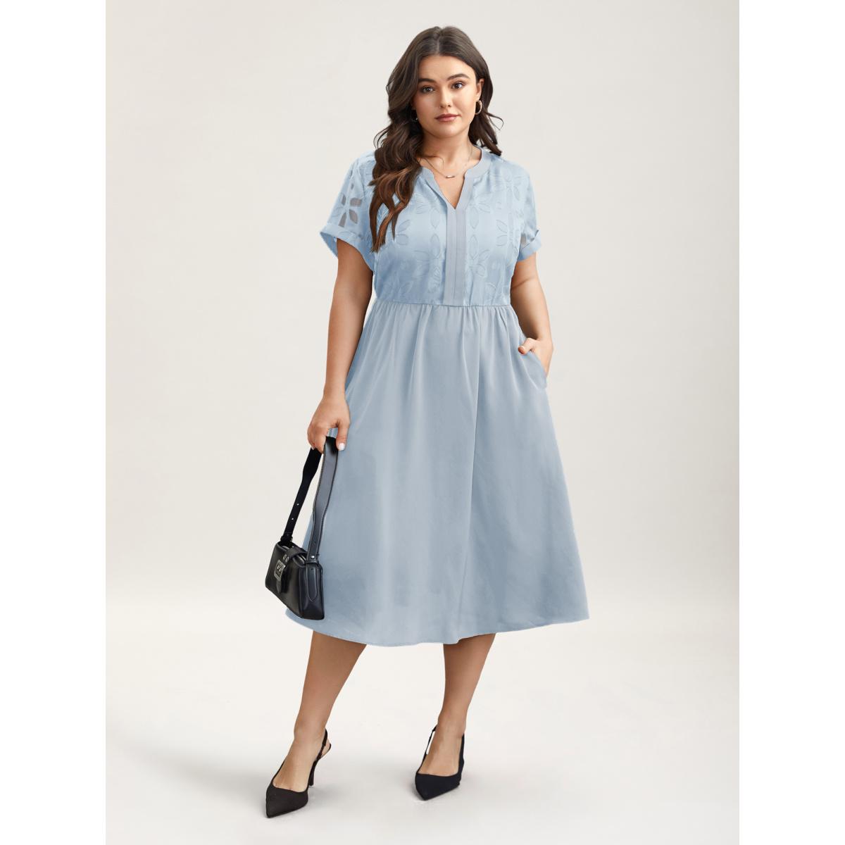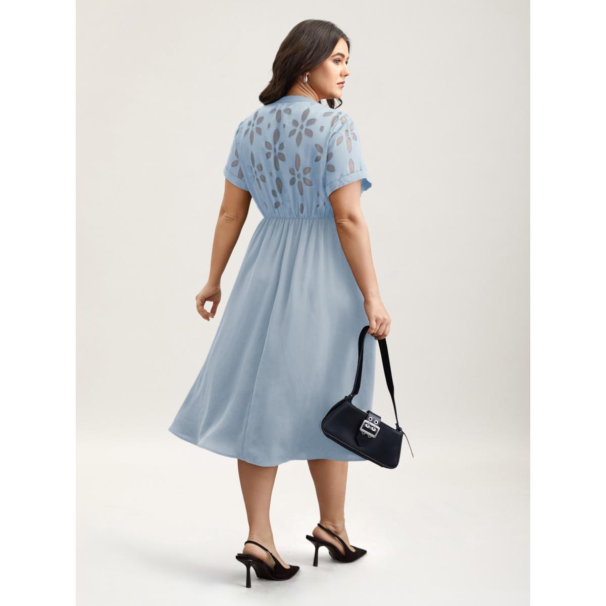 Plus Size Sheer Back Textured Cut-Out Midi Dress LightBlue Women Office Texture Notched collar Short sleeve Curvy BloomChic 28/5X Product Image