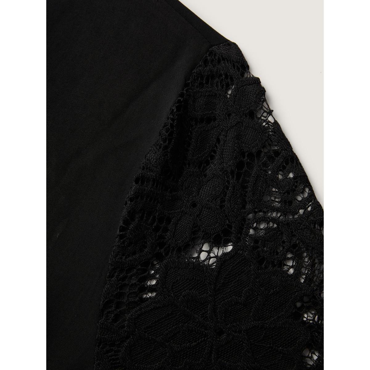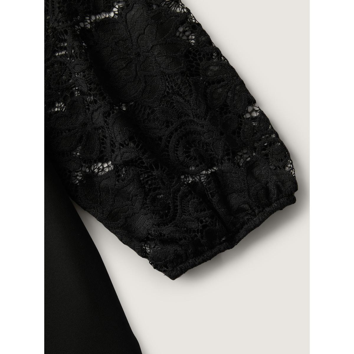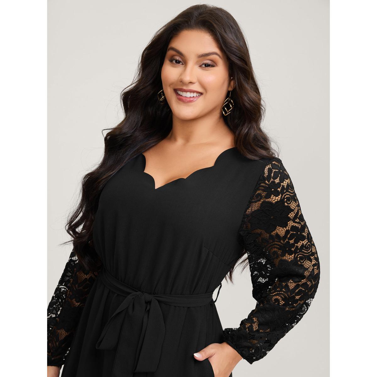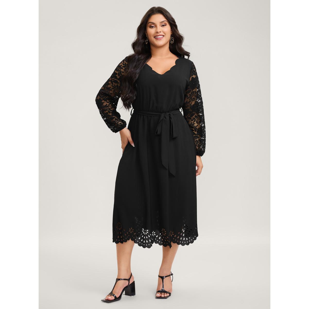Plus Size Sheer Floral Embroidered Scalloped Neck Midi Dress Black Women Romantic See through V-neck Extra Long Sleeve Curvy BloomChic 14-16/1X