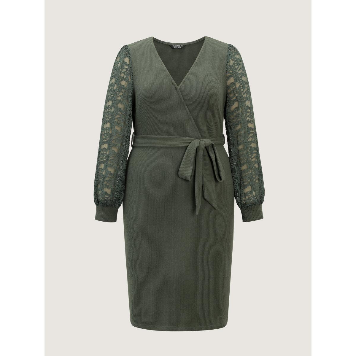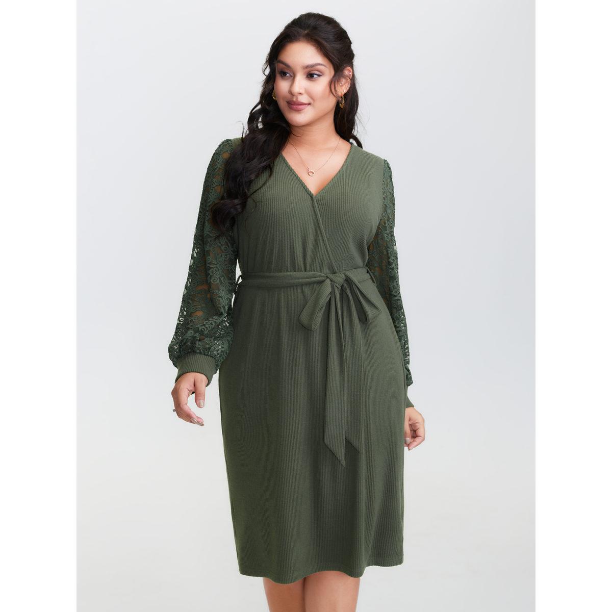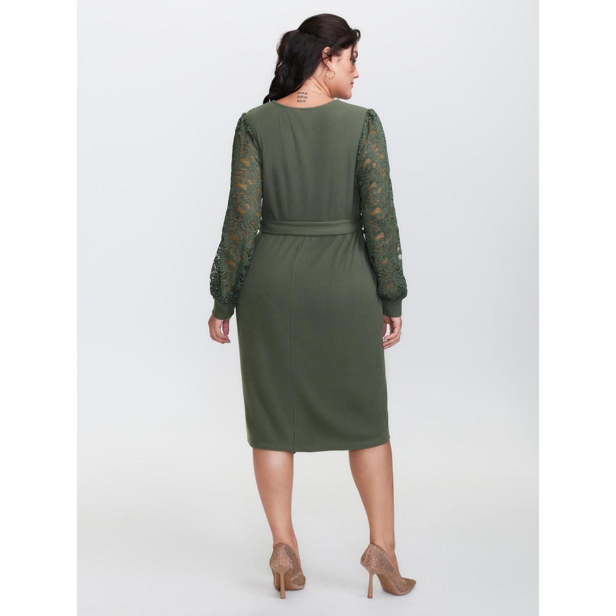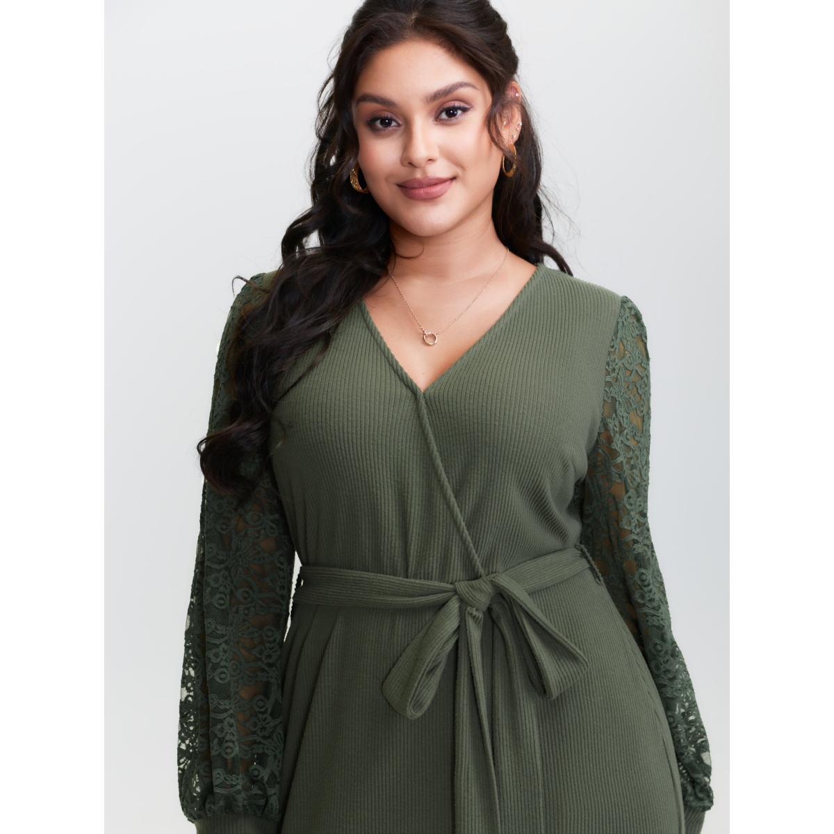 Plus Size Sheer Lace Cozy Belted Waist Midi Dress DarkGreen Women Romantic Overlap Collar Extra Long Sleeve Curvy BloomChic 10/M