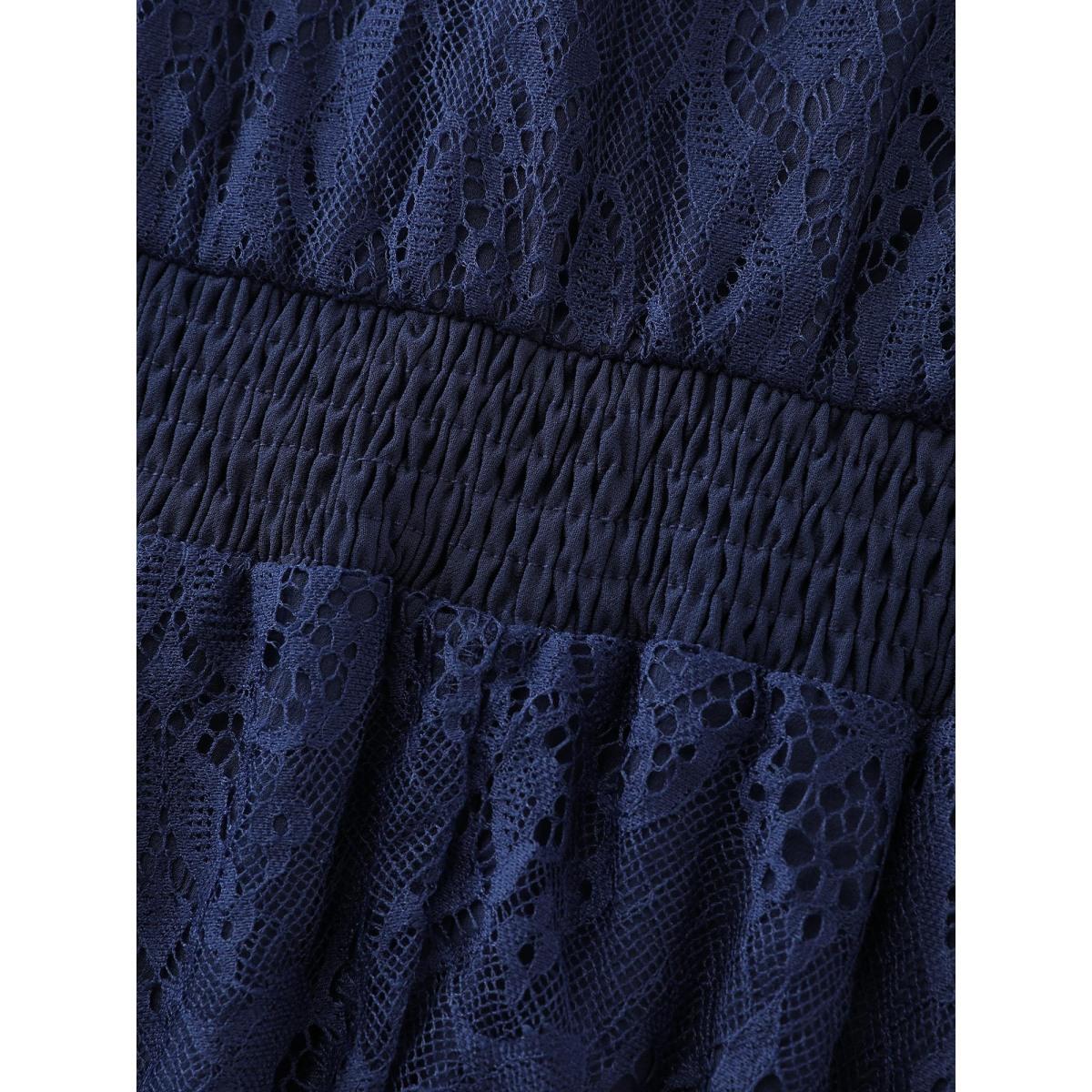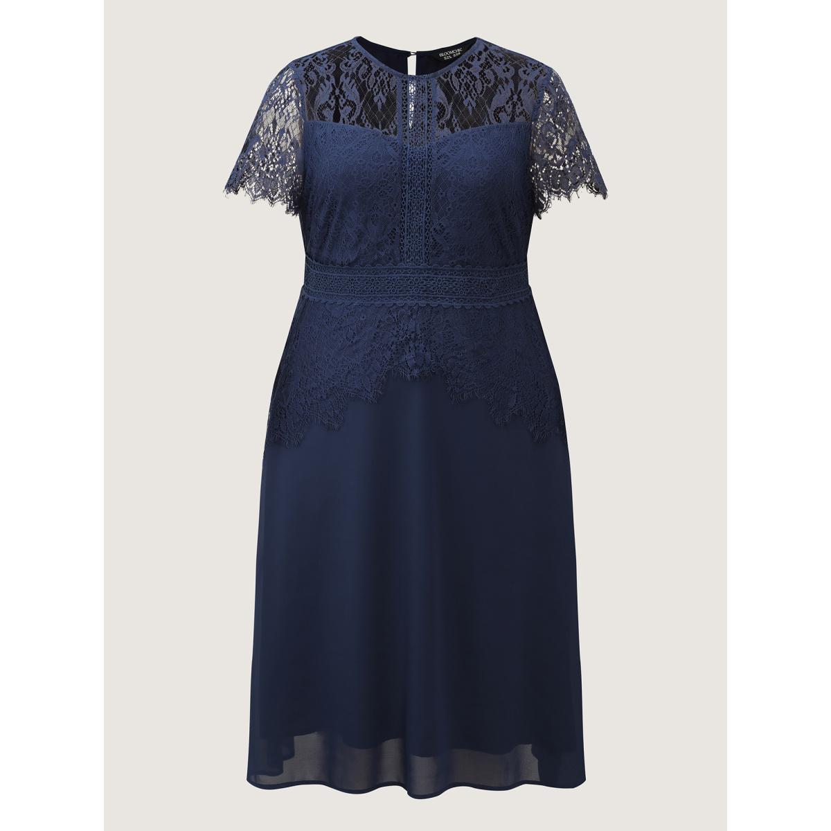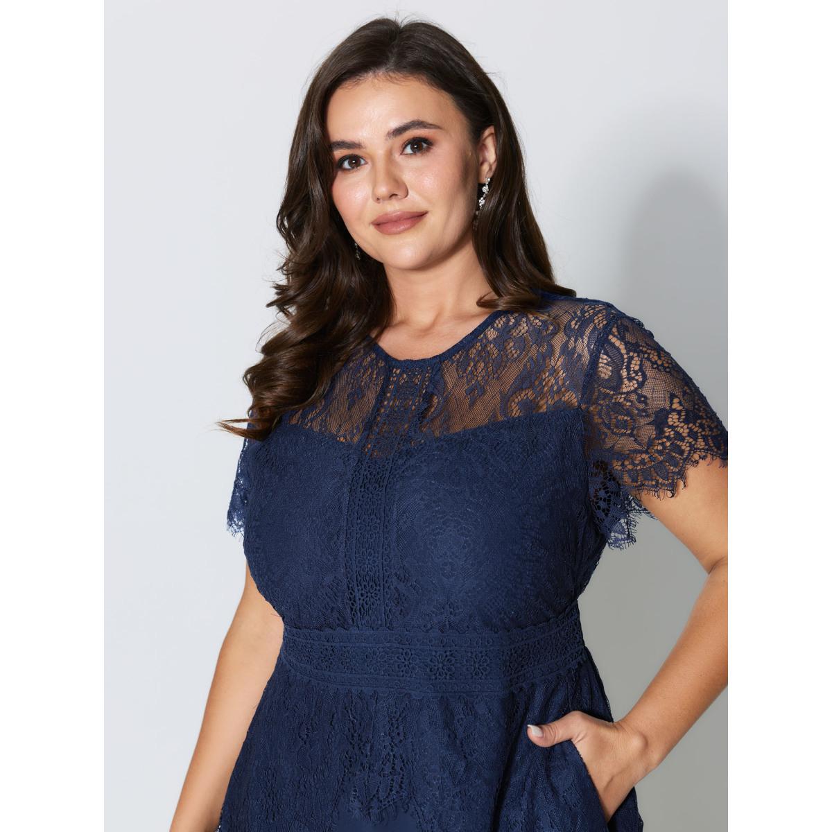 Plus Size Lace Patchwork Shirred Midi Pocket Dress DarkBlue Women Formal Lace Round Neck Elbow-length sleeve Curvy BloomChic 30/6X