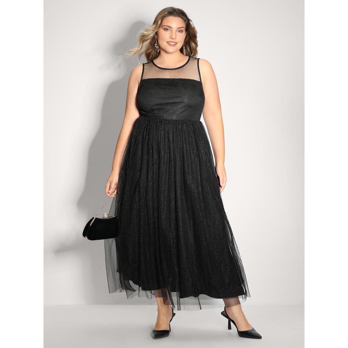 Plus Size Shimmery Sheer Neckline Flowy Maxi Dress Black Women Party&Cocktail Round Neck Sleeveless Curvy BloomChic 12/L