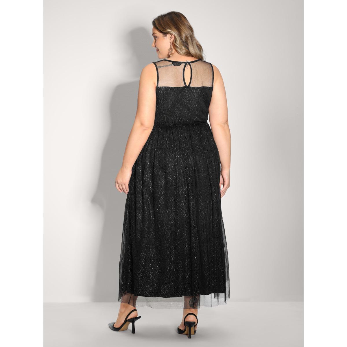 Plus Size Shimmery Sheer Neckline Flowy Maxi Dress Black Women Party&Cocktail Round Neck Sleeveless Curvy BloomChic 12/L Product Image