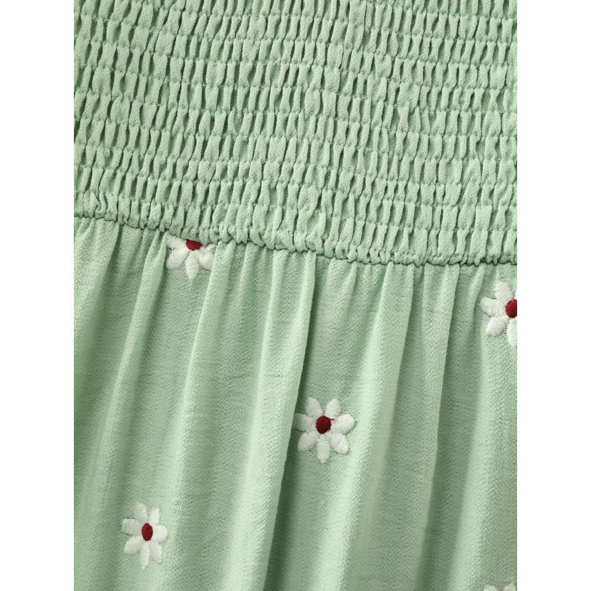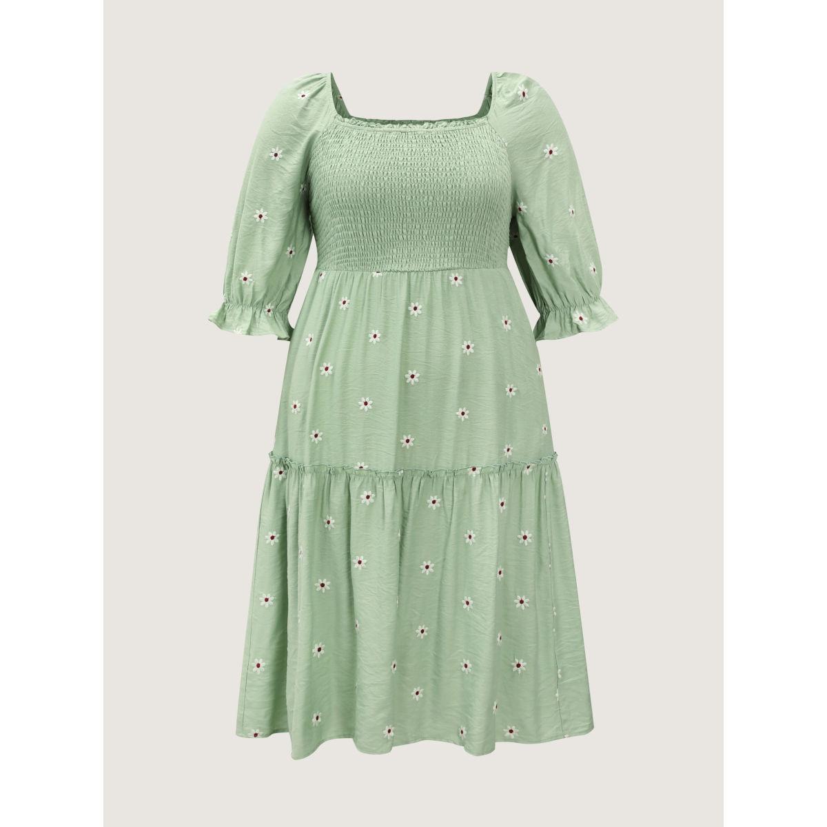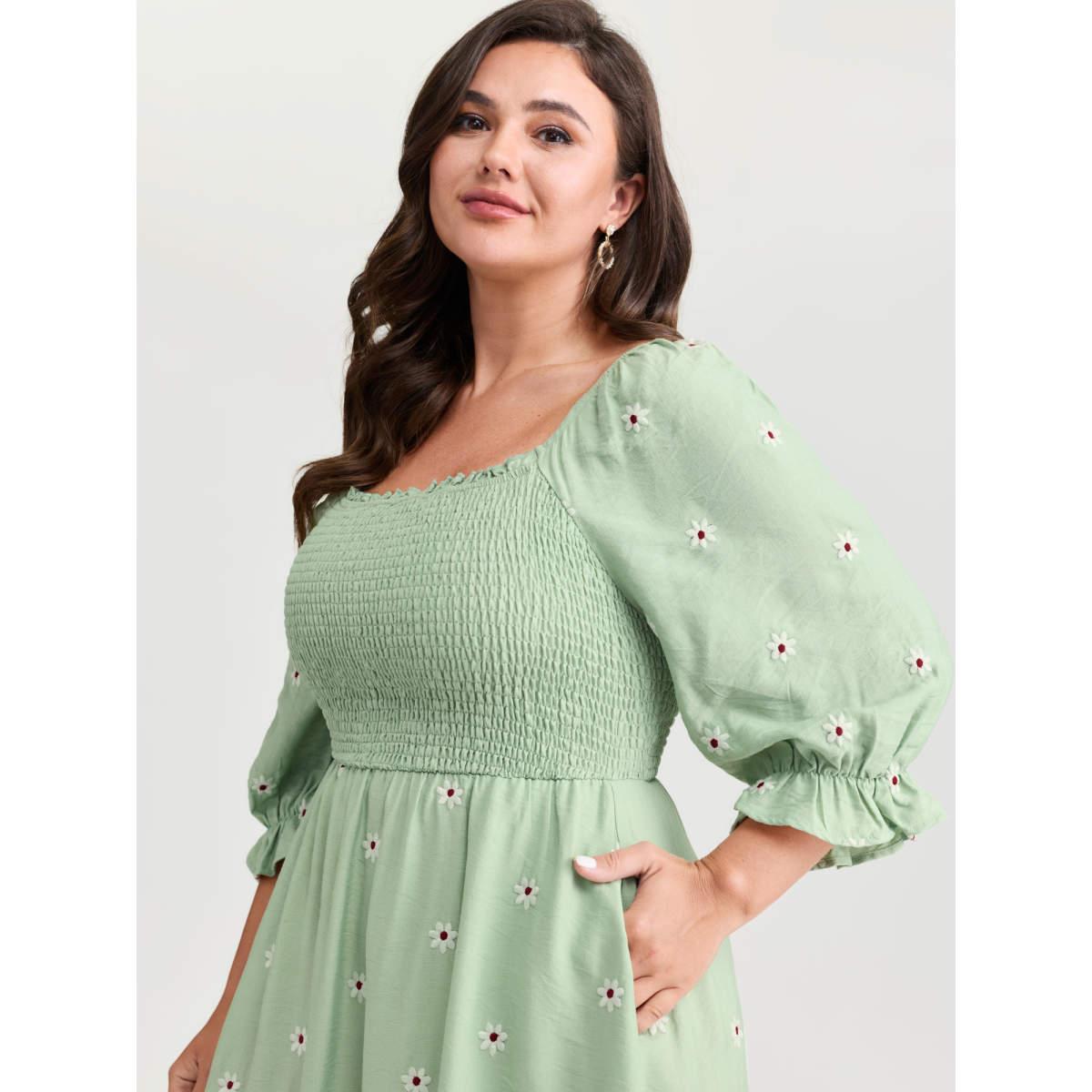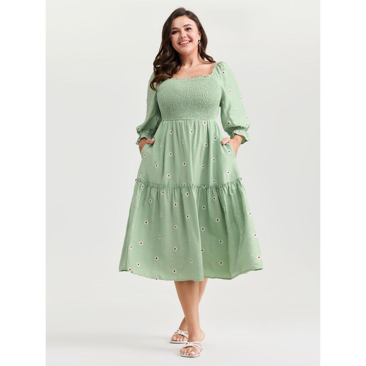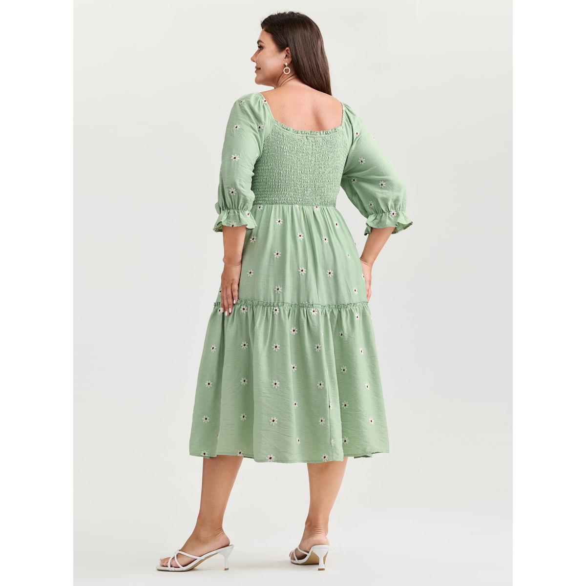 Plus Size Shirred Embroidered Square Neckline Tiered Midi Dress Greenbean Women Romantic Texture Square Neck Half Sleeve Curvy BloomChic 10/M