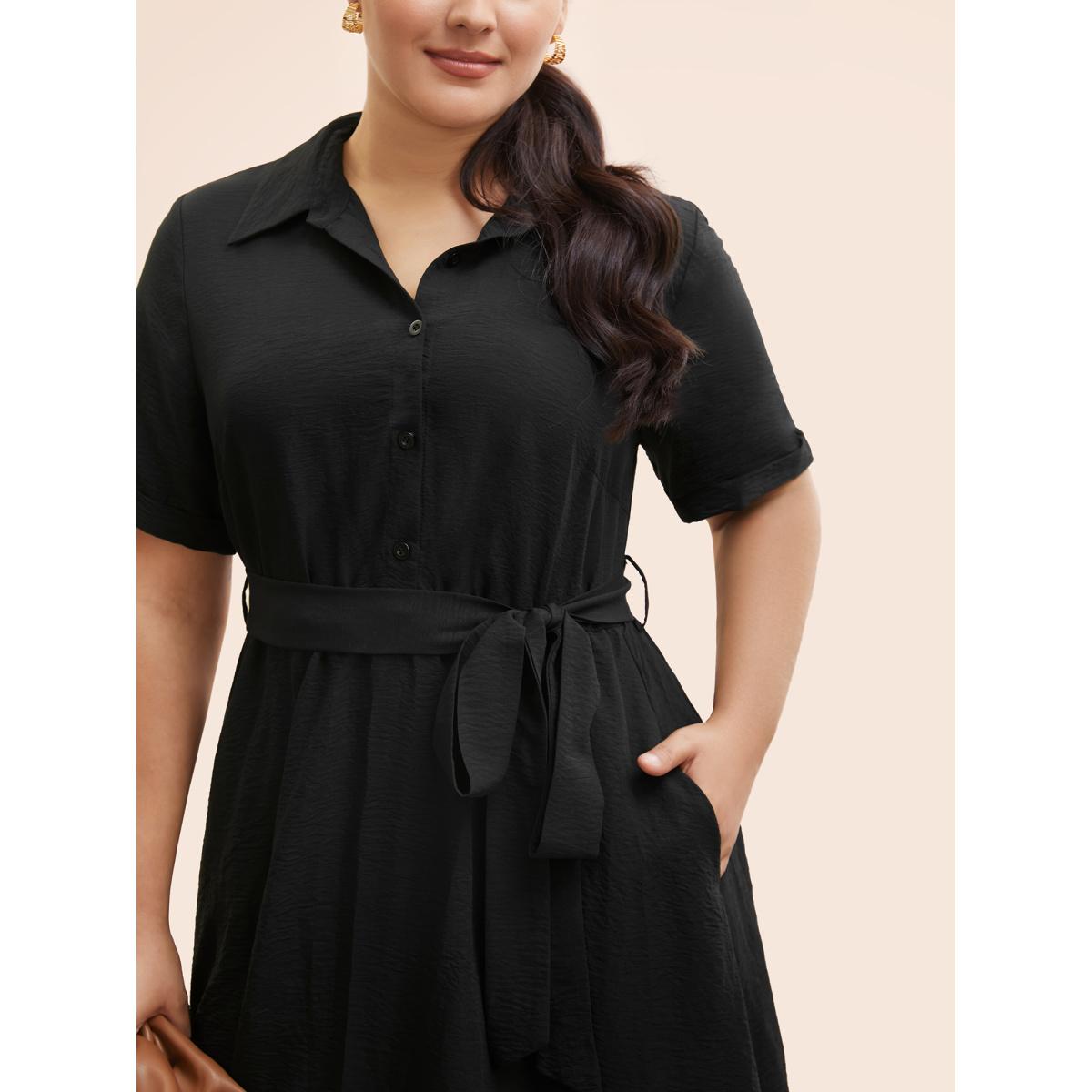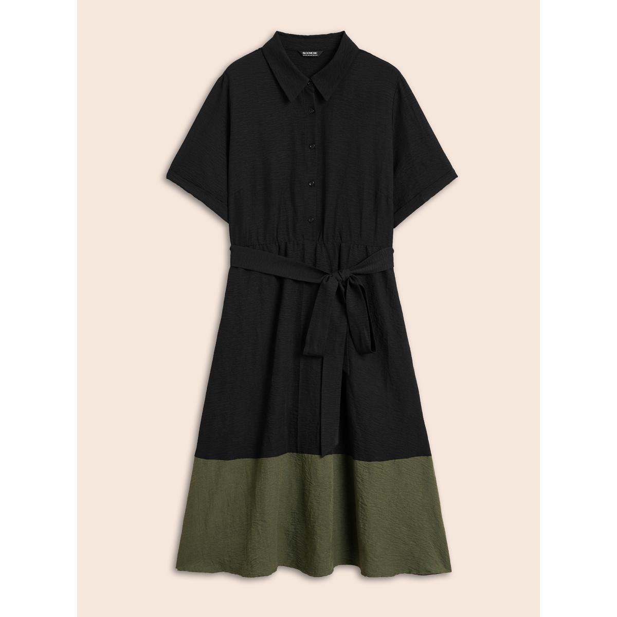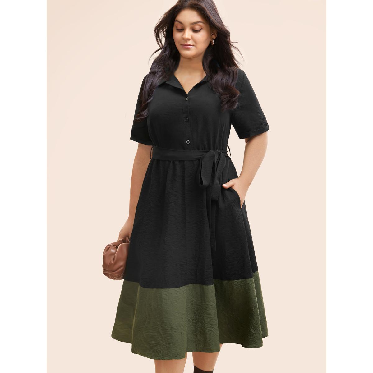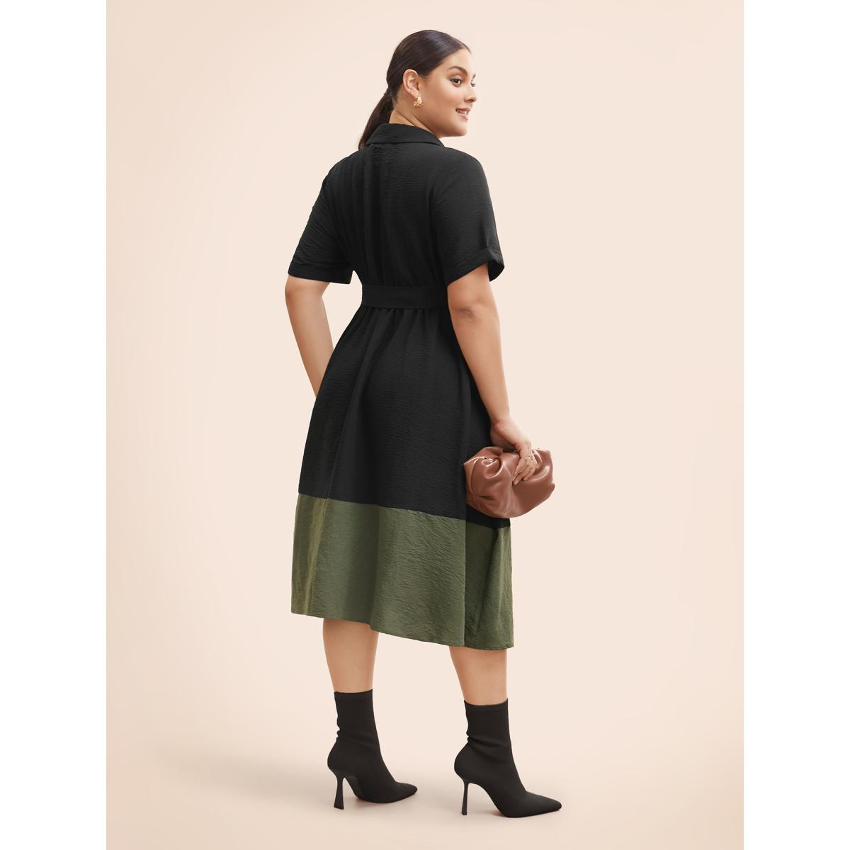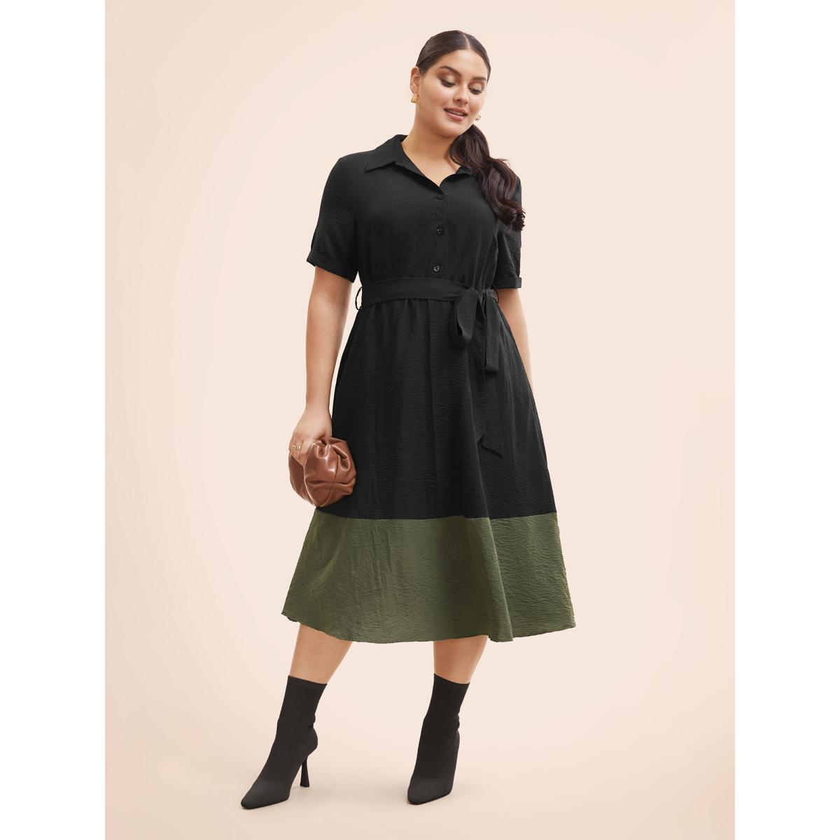 Plus Size Shirt Collar Contrast Patchwork Belted Midi Dress ArmyGreen Women At the Office Belted Shirt collar Half Sleeve Curvy BloomChic 28/5X