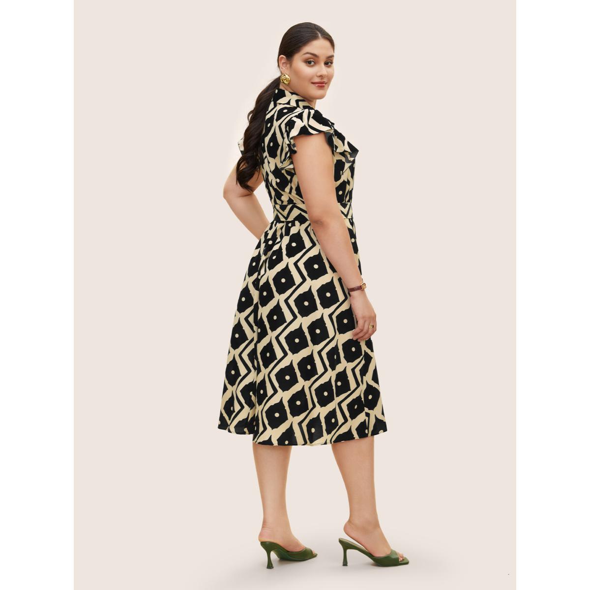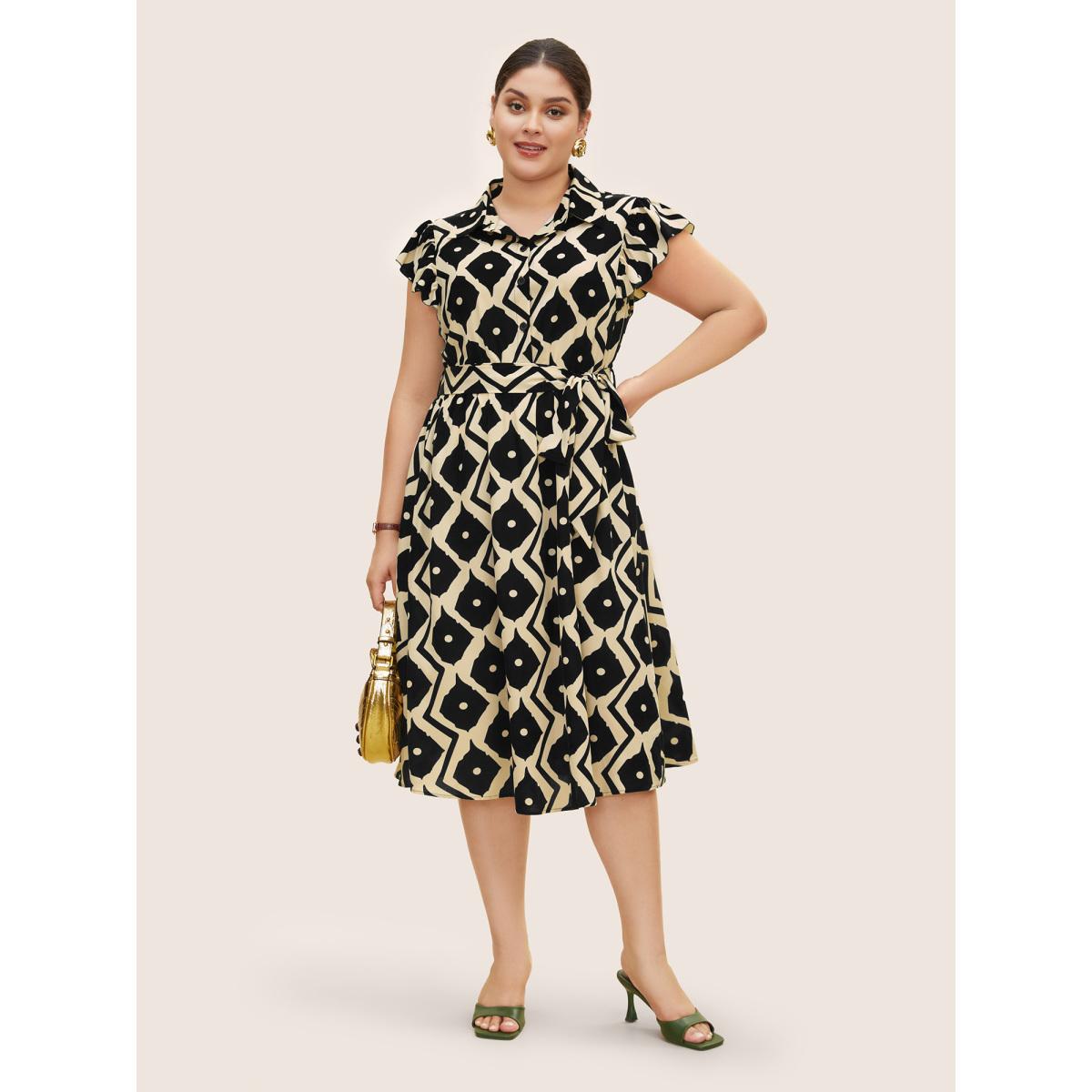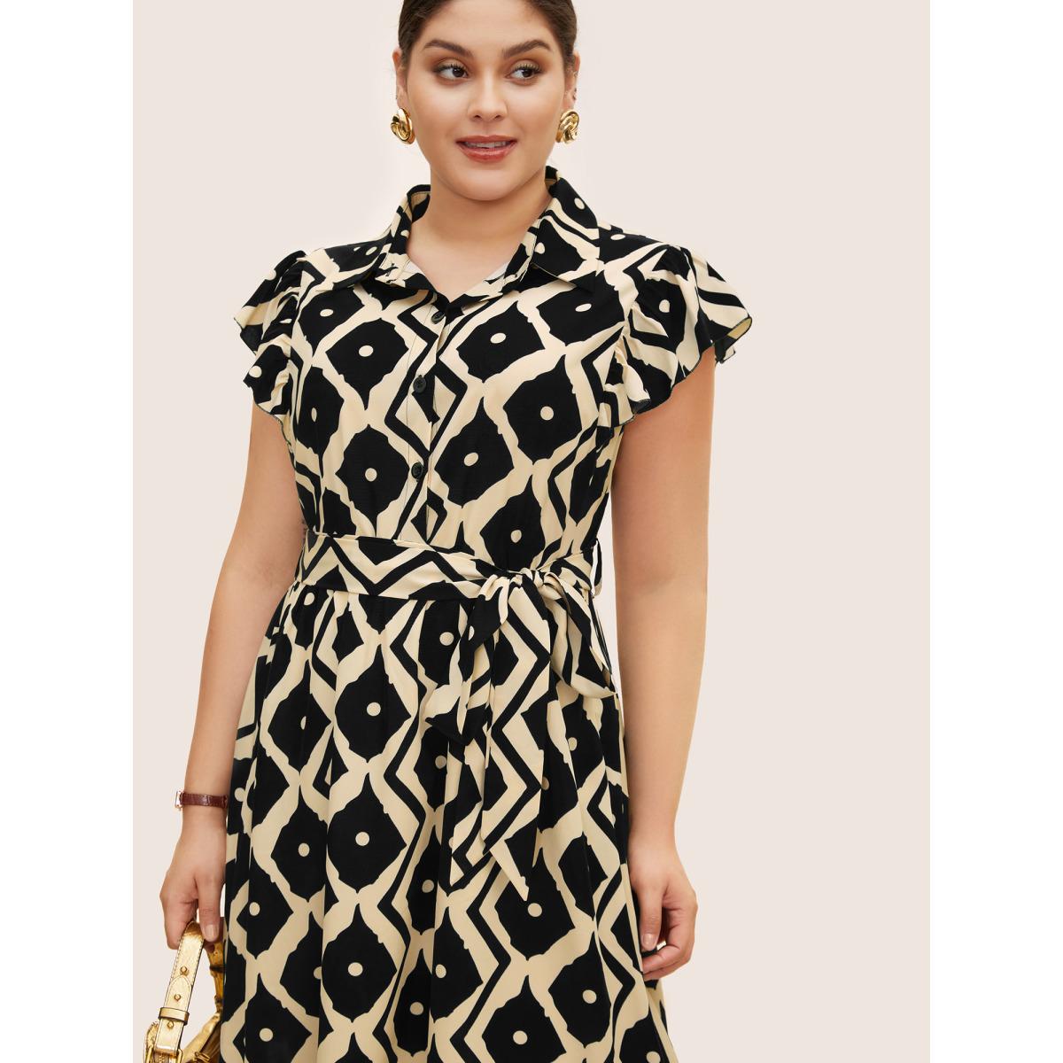 Plus Size Shirt Collar Geometric Ruffle Cap Sleeve Dress Black Women Office Belted Shirt collar Cap Sleeve Curvy BloomChic 10/M