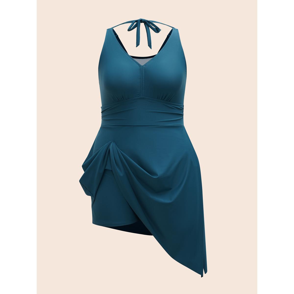 Plus Size Side-Tie Halter Neck Pockets Swim Dress Women's Swimwear Cyan Beach Bodycon V-neck High stretch Curve Swim Dresses BloomChic 18-20/2X