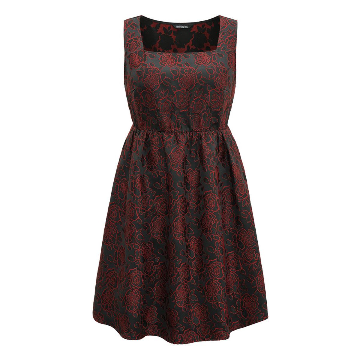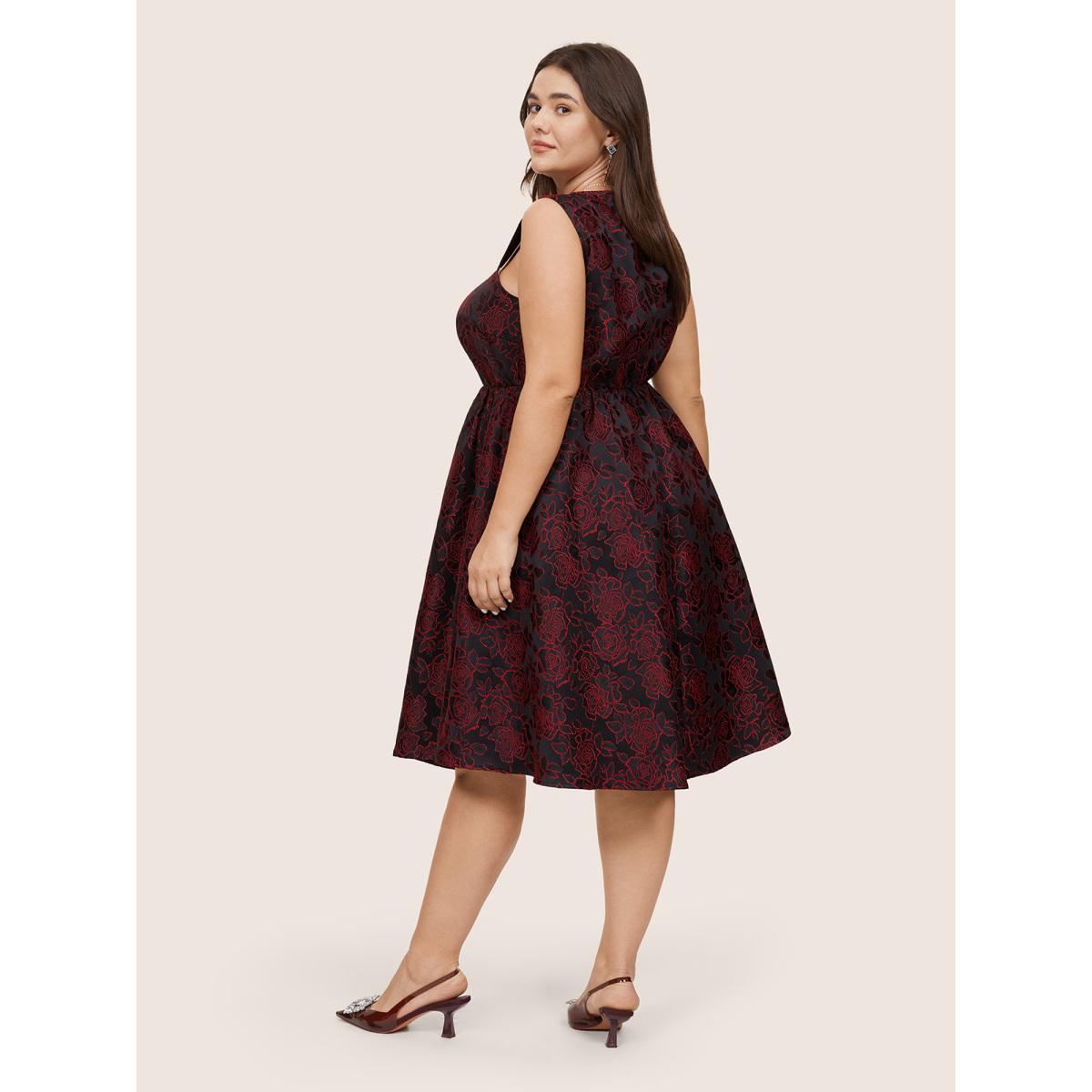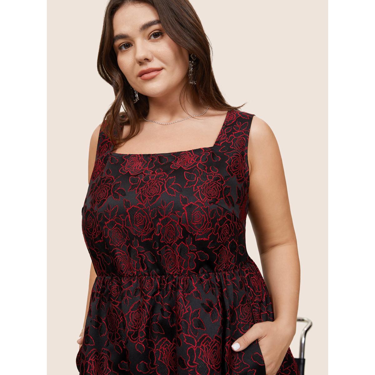 Plus Size Silhouette Floral Print Embroidered Elastic Waist Tank Dress Black Women Party Embroidered Spaghetti Strap Sleeveless Curvy Midi Dress BloomChic 22-24/3X