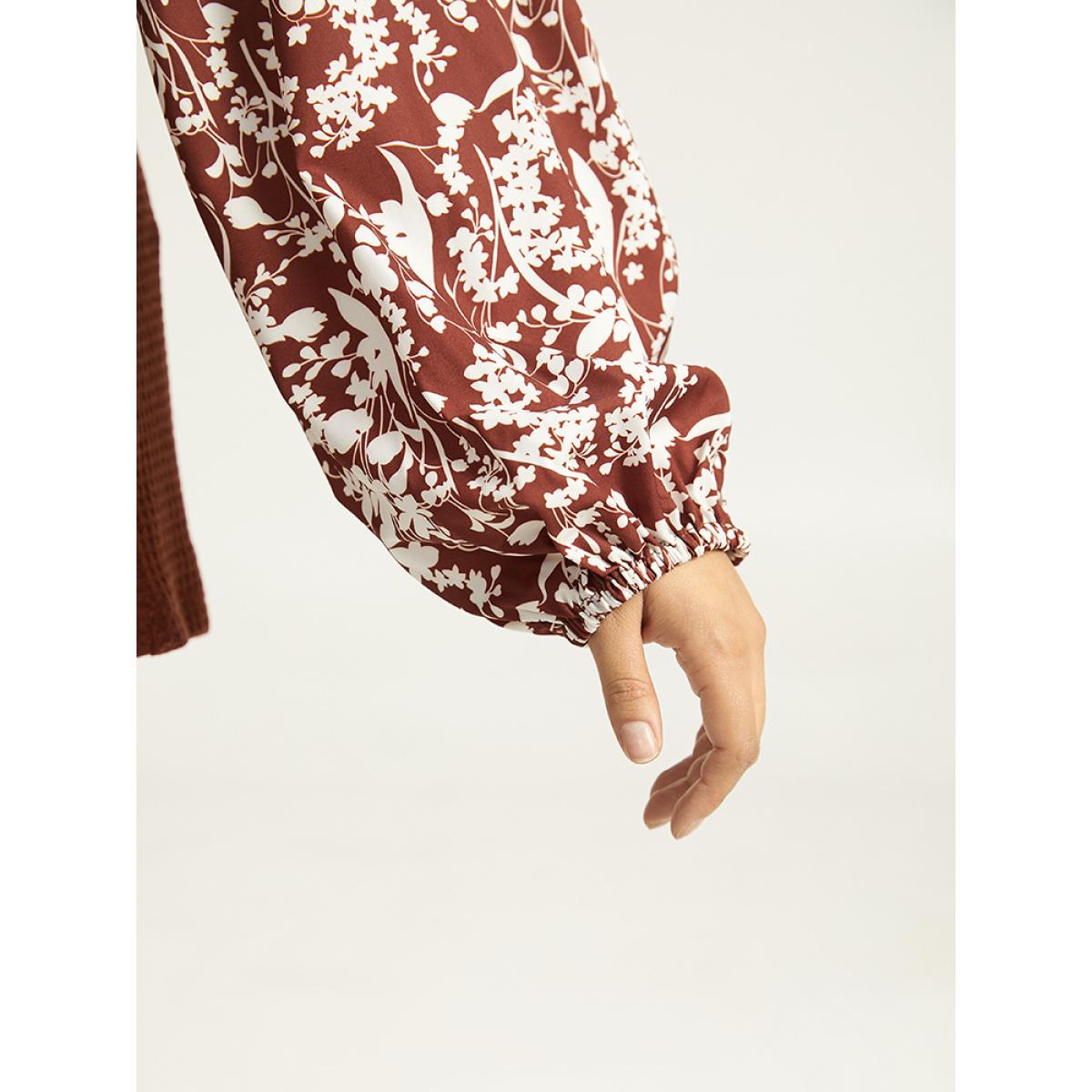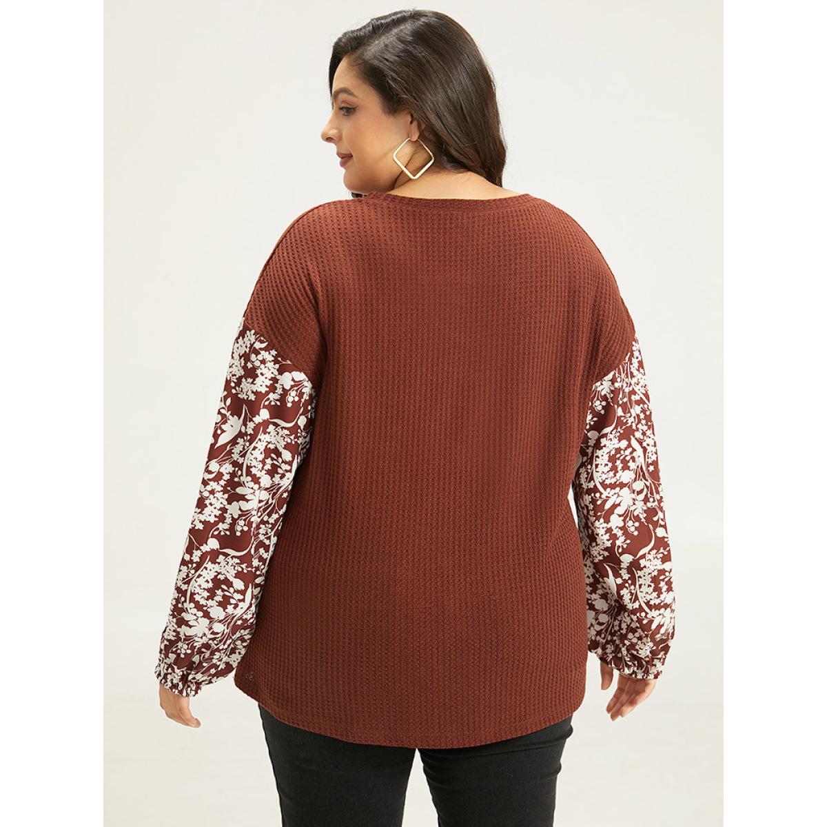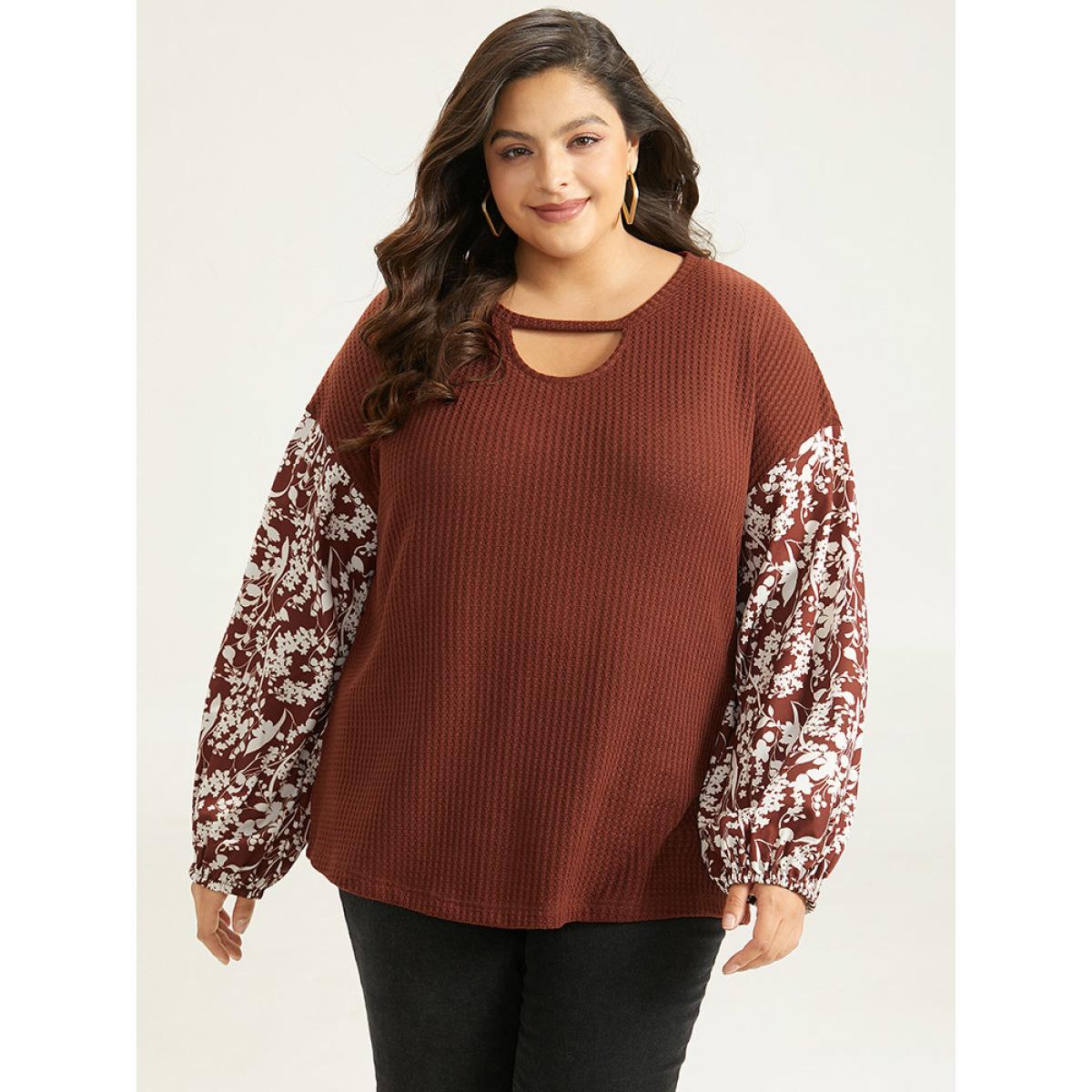 Plus Size Silhouette Floral Print Keyhole Lantern Sleeve Sweatshirt Maroon Women Elegant Elastic cuffs Silhouette Floral Print Keyhole Cut-Out Dailywear T-shirts BloomChic 14-16/1X