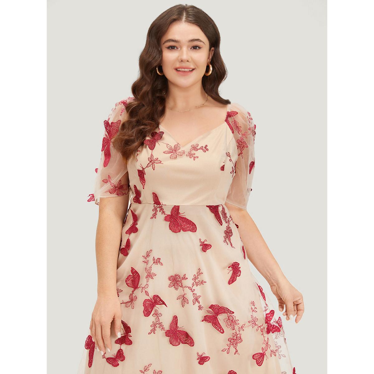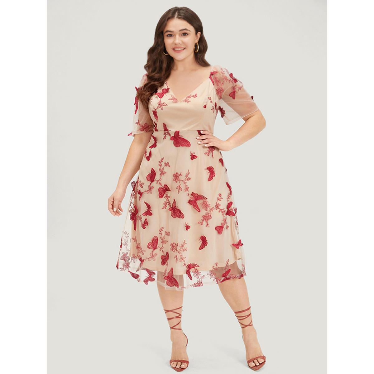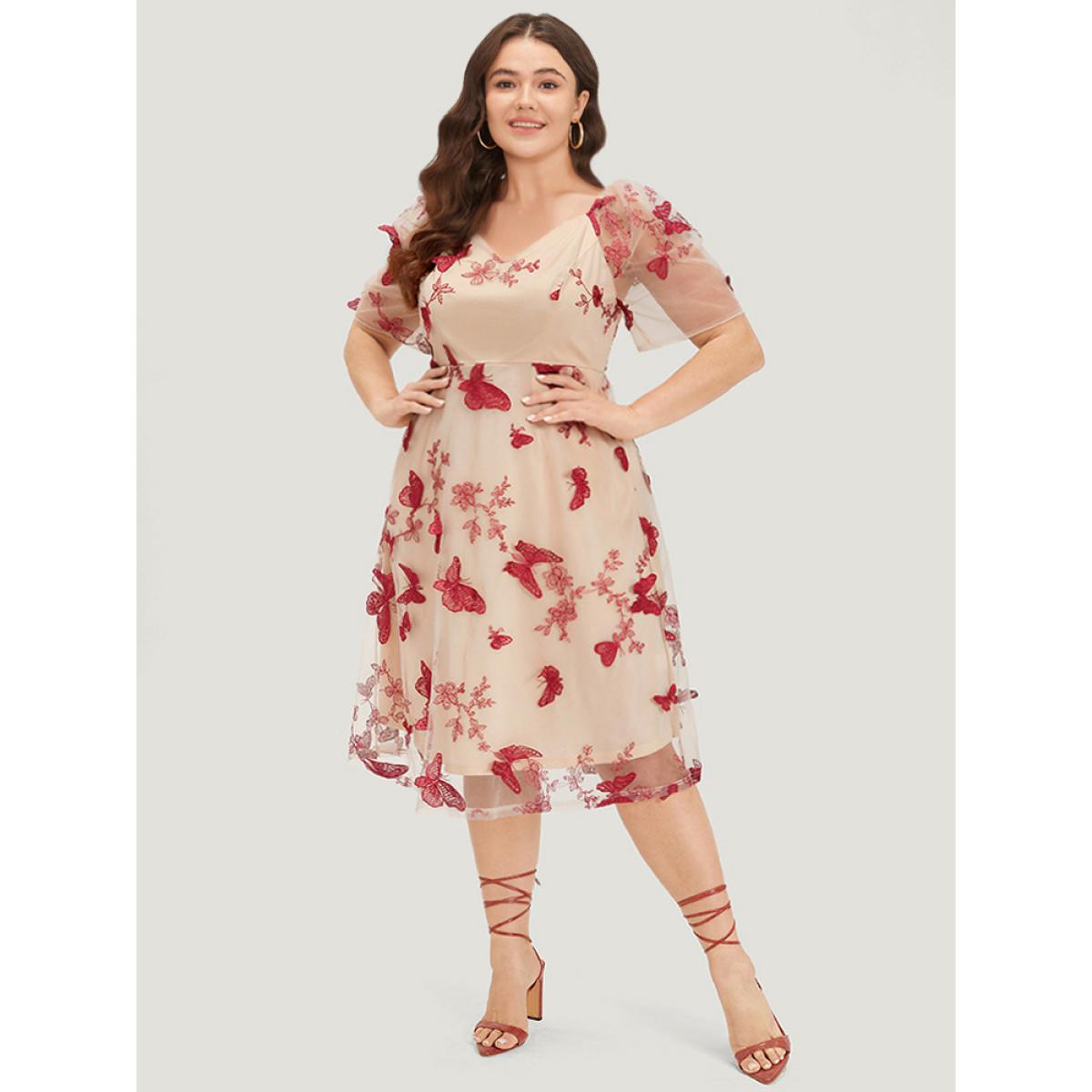 Plus Size Silhouette Floral Print Mesh Puff Sleeve Dress Beige Women Elegant Lined V-neck Half Sleeve Curvy Midi Dress BloomChic 18-20/2X