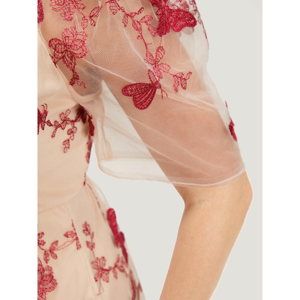 Plus Size Silhouette Floral Print Mesh Puff Sleeve Dress Beige Women Elegant Lined V-neck Half Sleeve Curvy Midi Dress BloomChic 18-20/2X Product Image