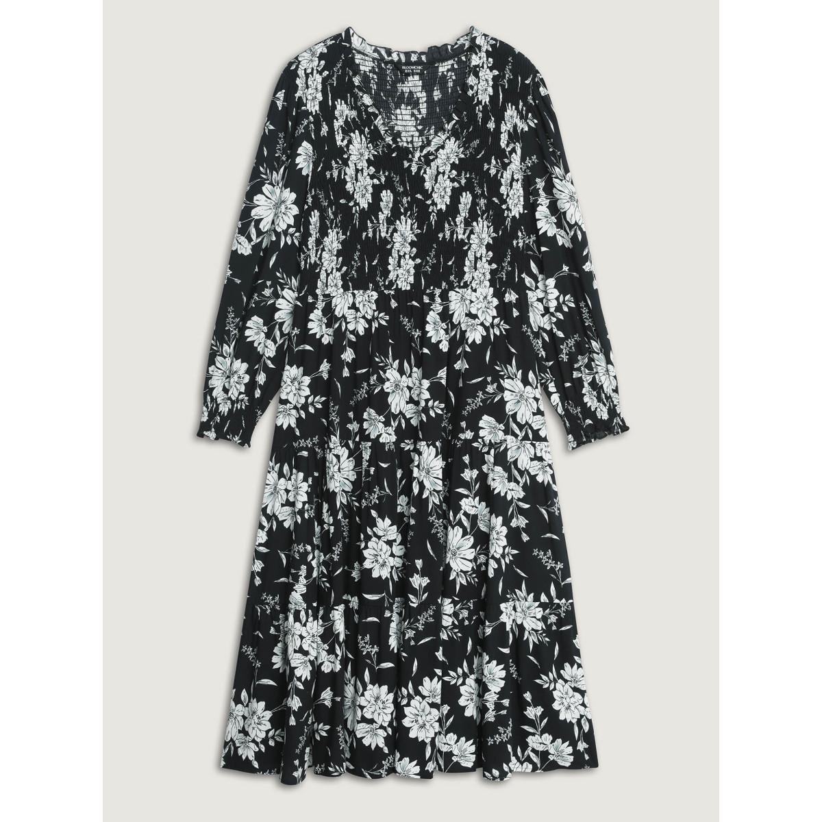 Plus Size Silhouette Floral Print Shirred Puff Sleeve Dress Black Women Elegant Gathered Square Neck Short sleeve Curvy Midi Dress BloomChic 12/L