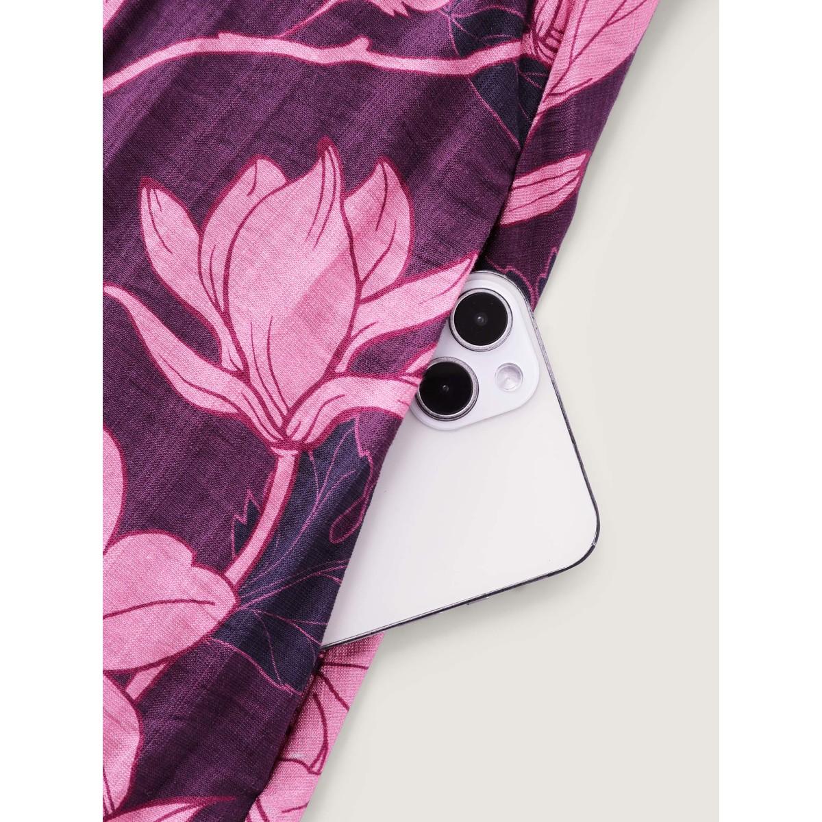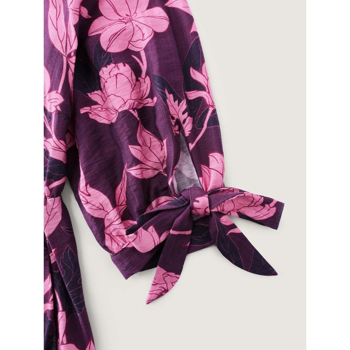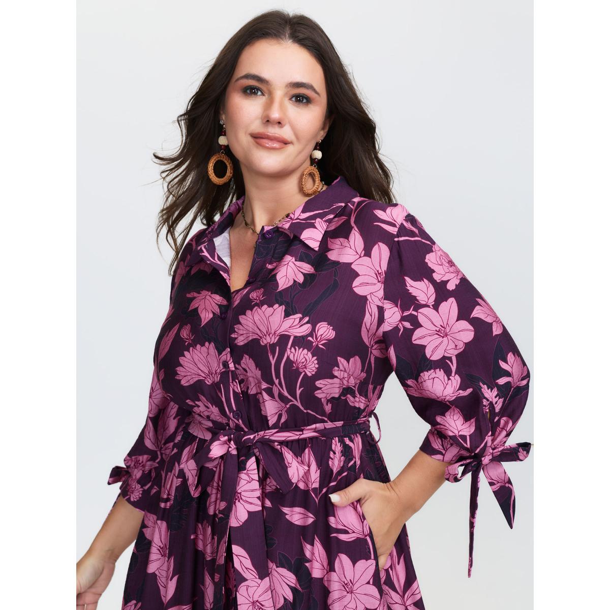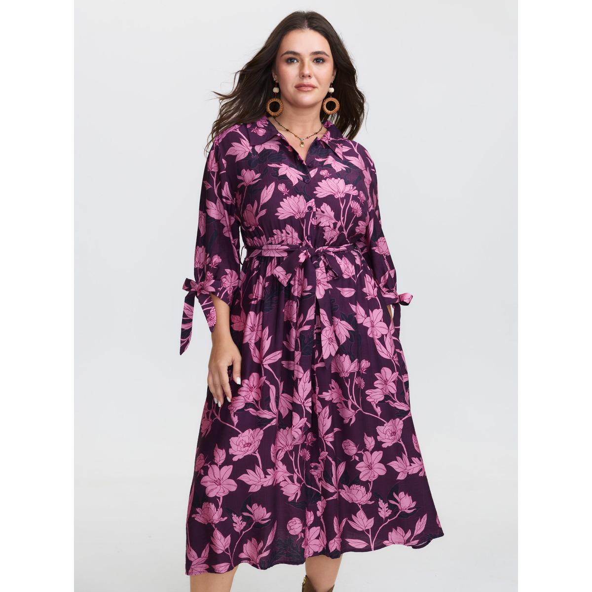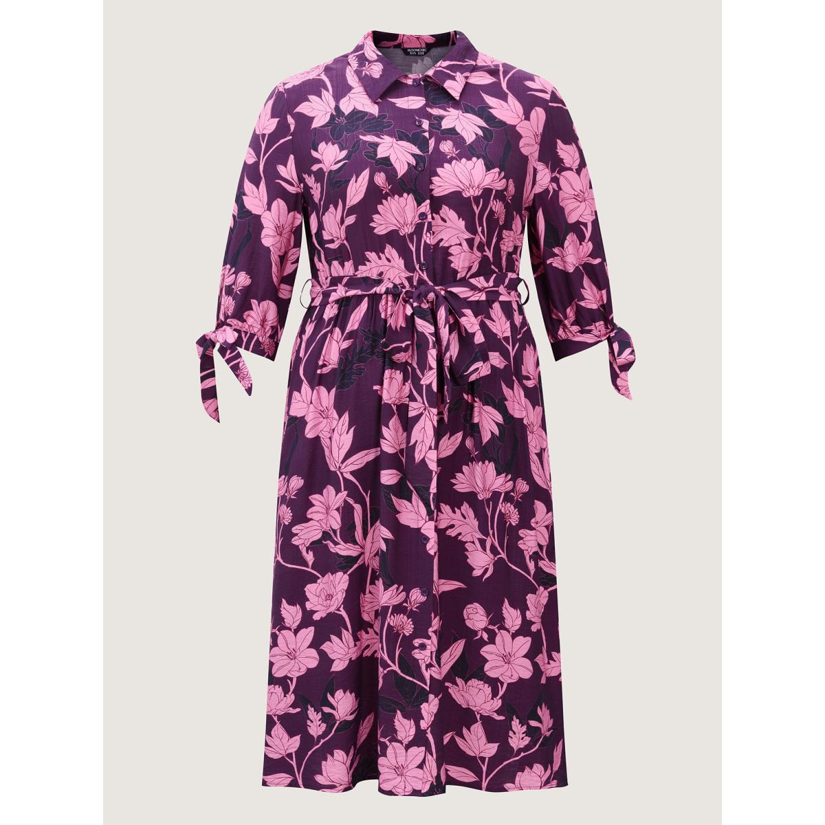 Plus Size Silhouette Flower Stretchy Waist Tie Midi Dress Deeppurplered Women Resort Shirt collar Elbow-length sleeve Curvy BloomChic 30/6X