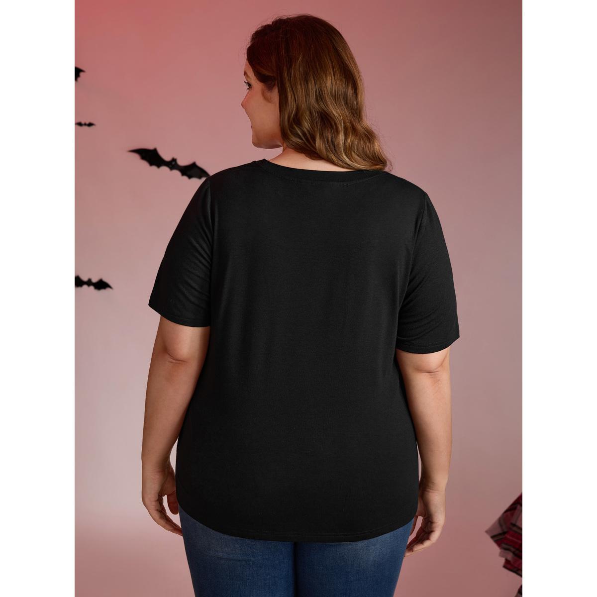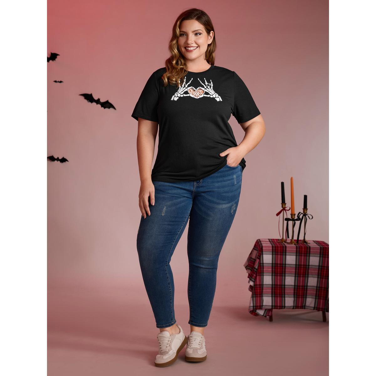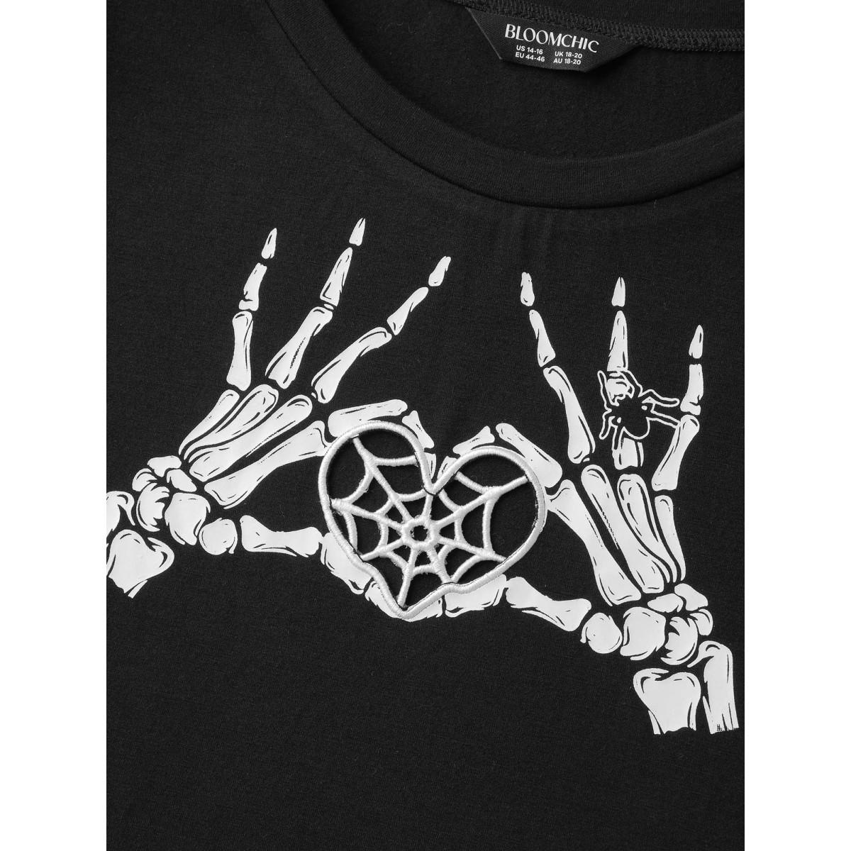 Plus Size Skeleton Heart Embroidered Cut-Out T-Shirt Black Women Playful Cut-Out Graphic-Halloween Round Neck Casual T-shirts BloomChic 28/5X