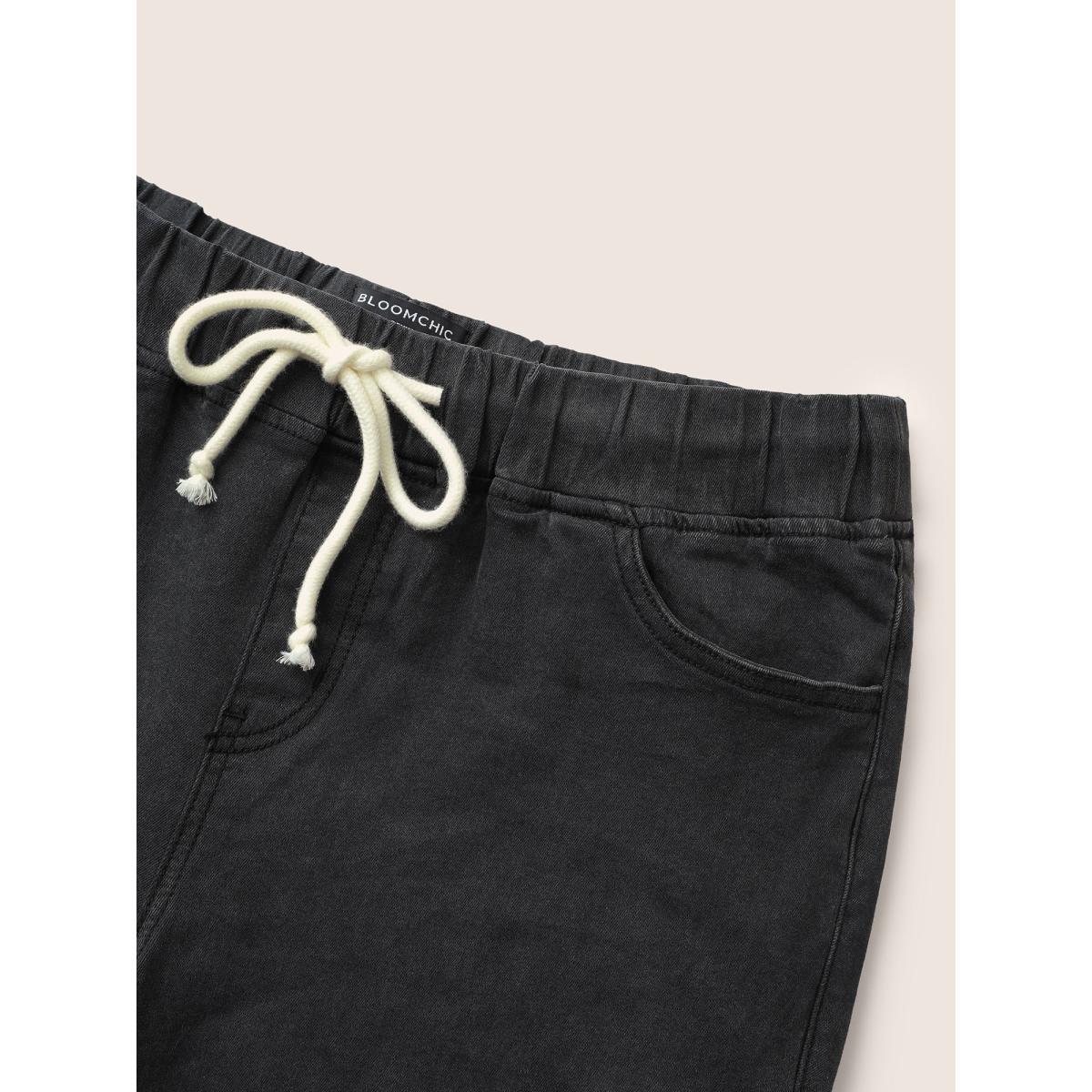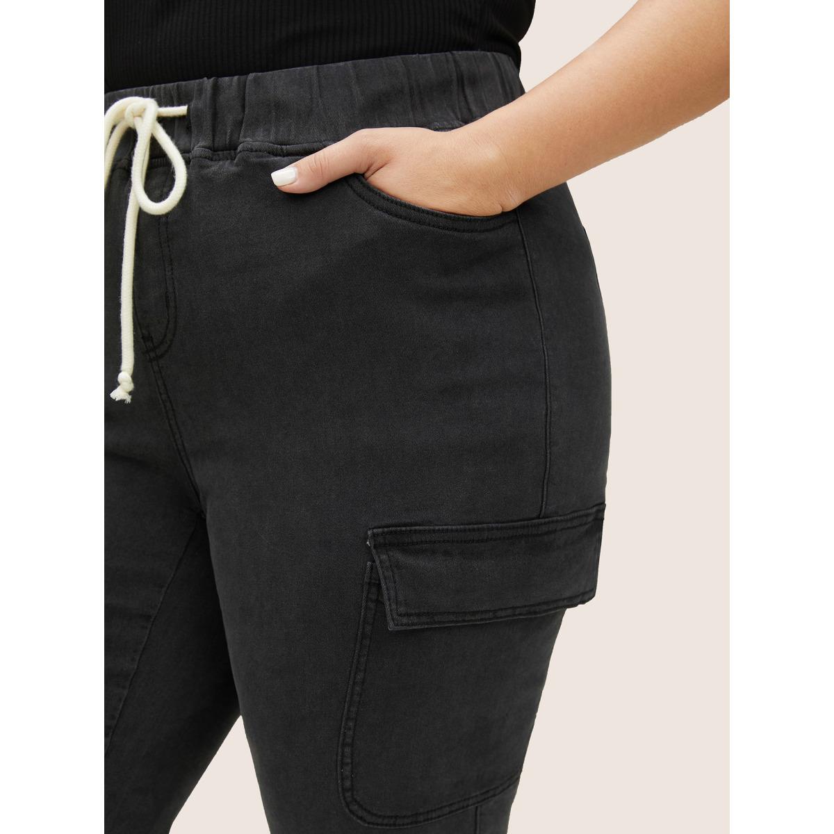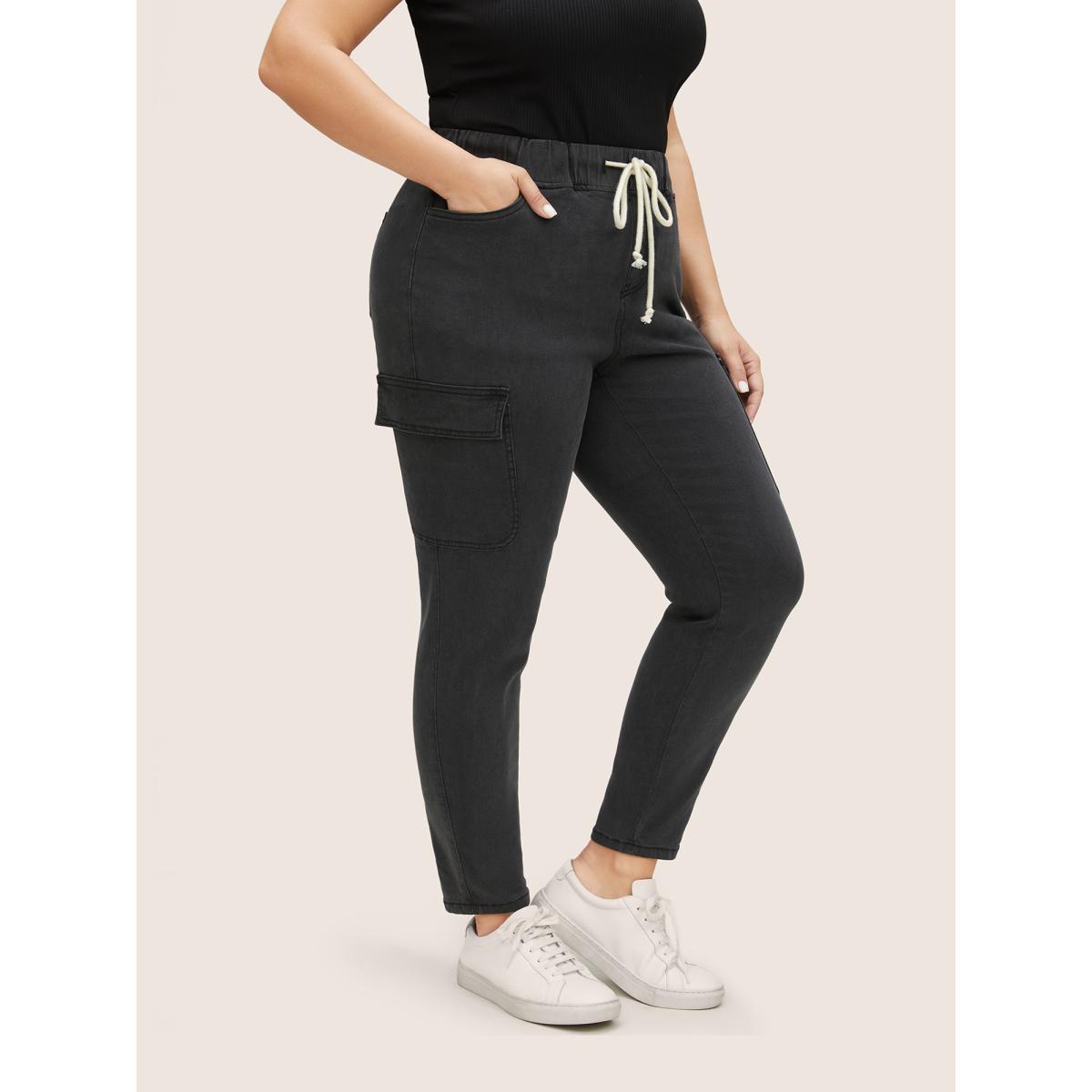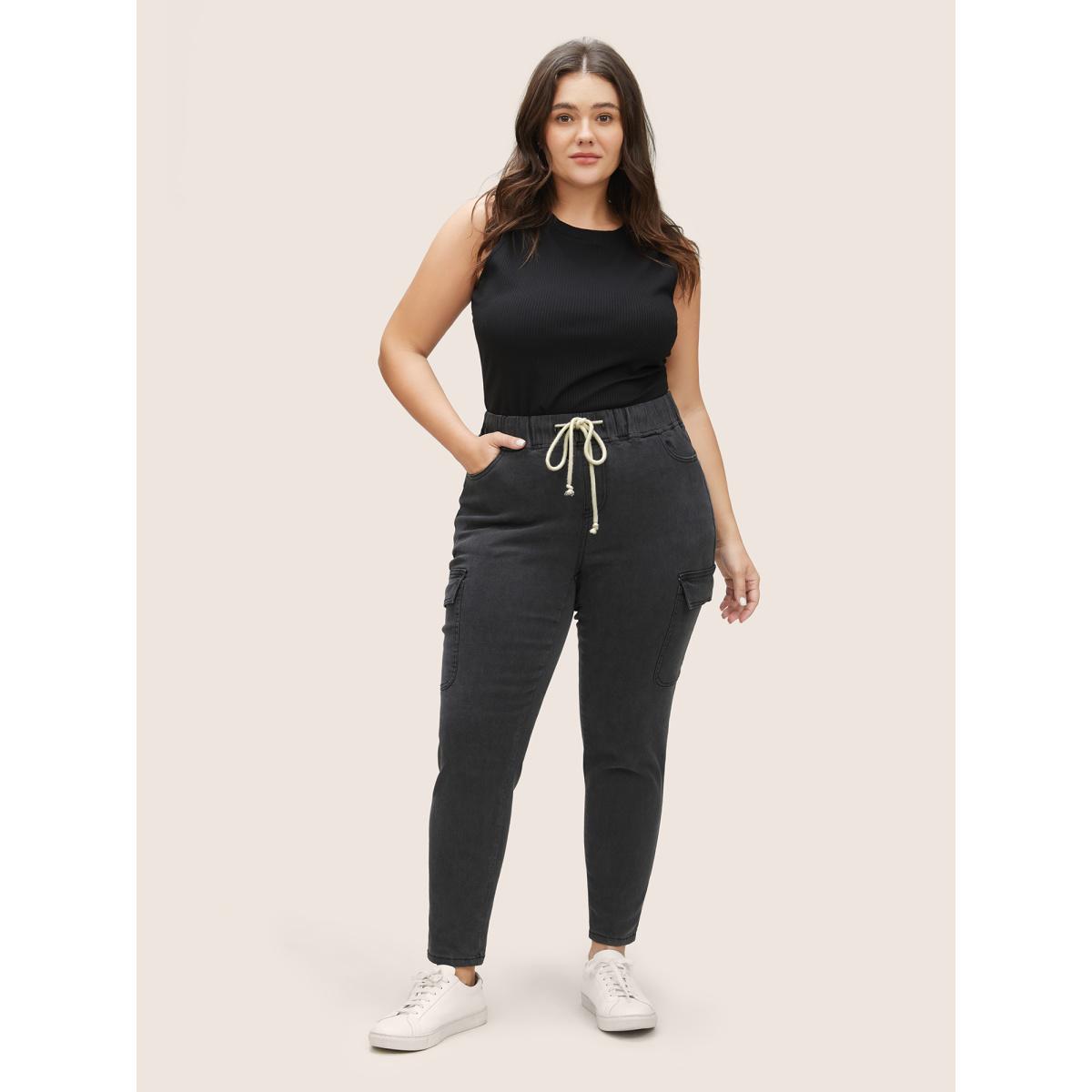 Plus Size Skinny Elastic Waist Drawstring Patched Pocket Jeans Women Gray Casual Plain Non High stretch Slanted pocket Jeans BloomChic 12/L