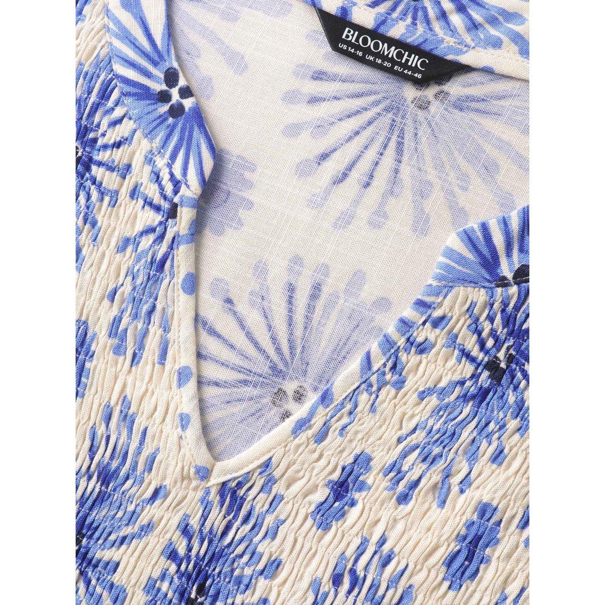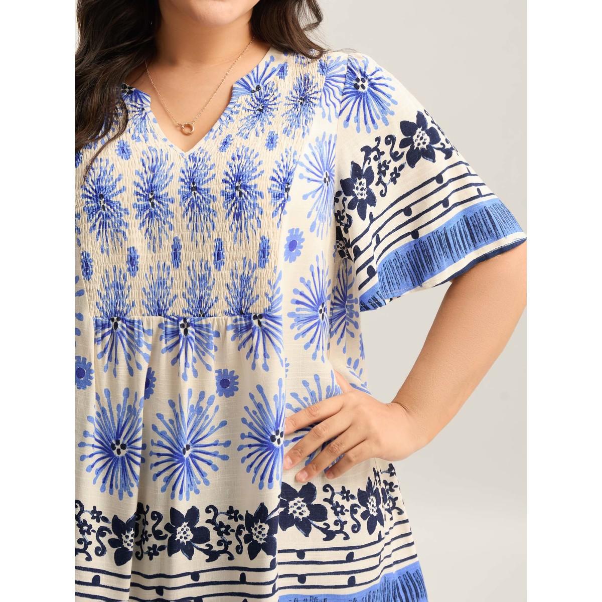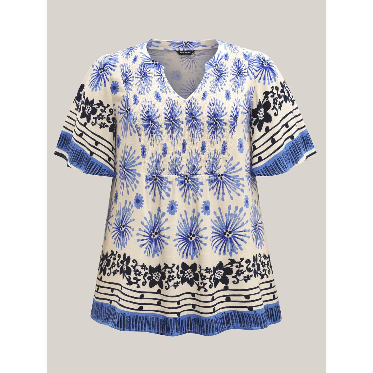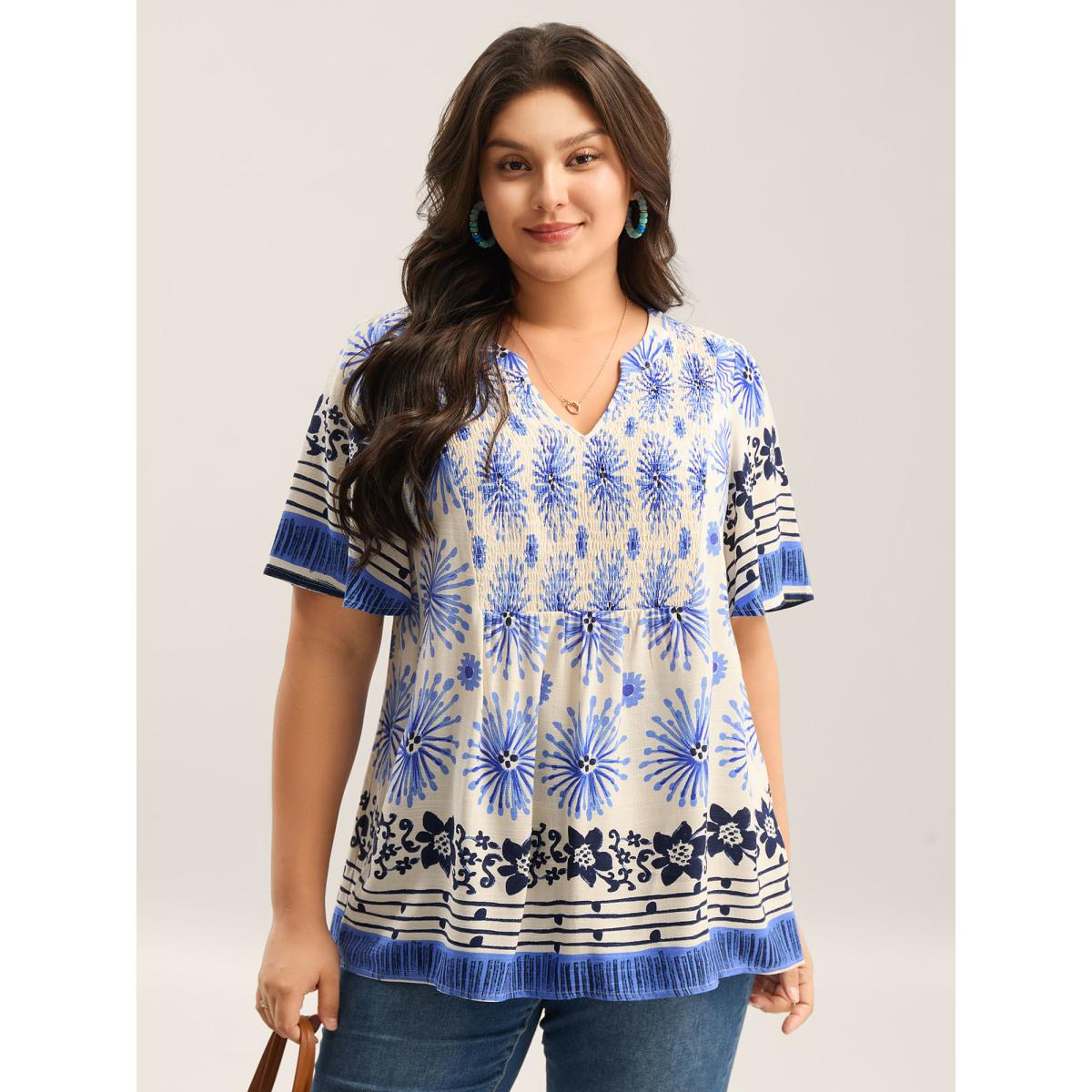 Plus Size Skyblue Floral Notched Collar Shirred Waist Blouse Women Short sleeve Flat collar Everyday-Elegant Blouses BloomChic 14-16/1X