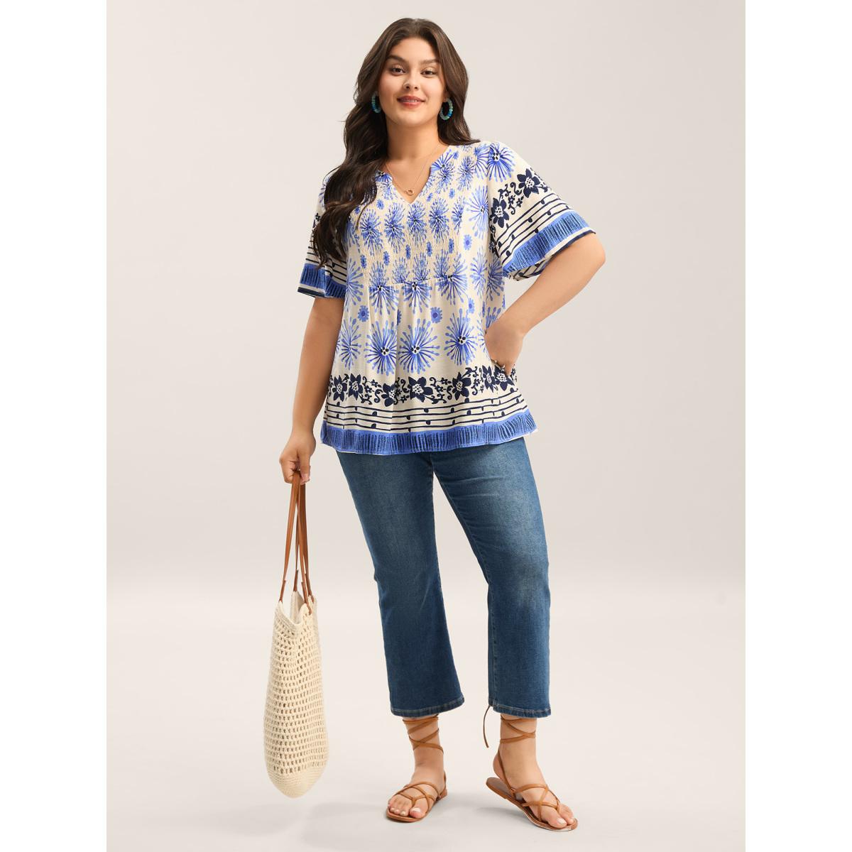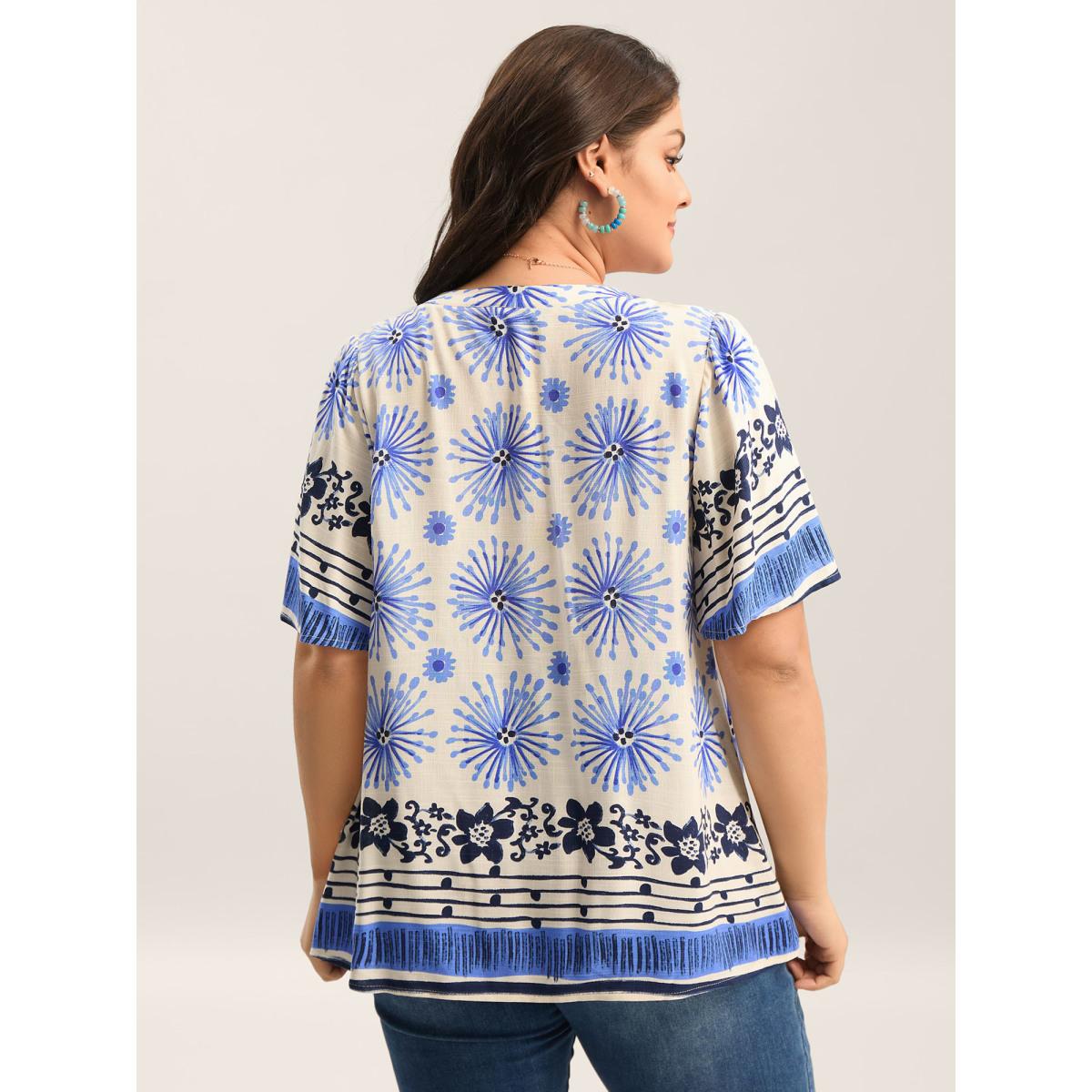 Plus Size Skyblue Asymmetrical Floral Print V-Neck Blouse Women Boho Short sleeve V-neck Vacation Blouses BloomChic 30/6X