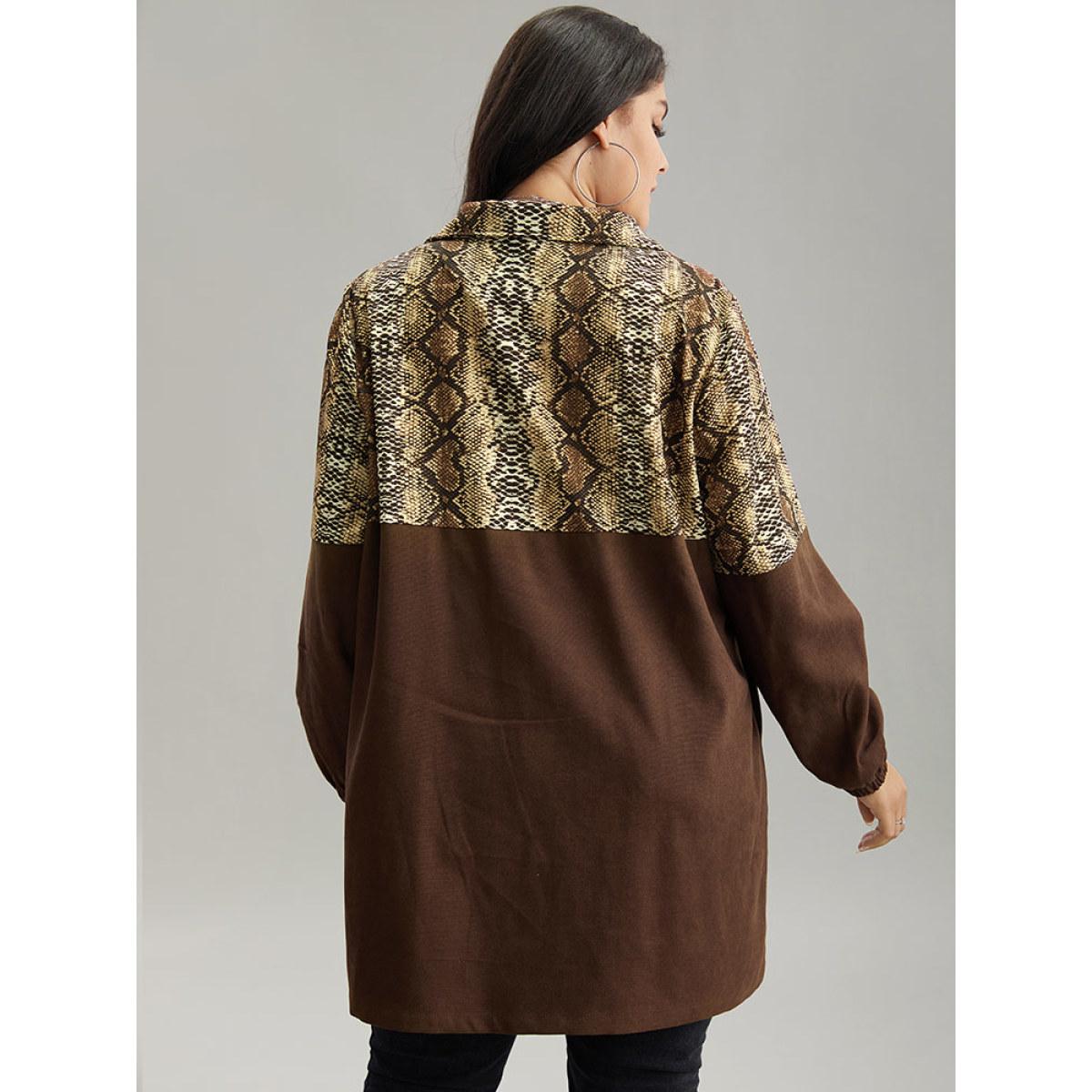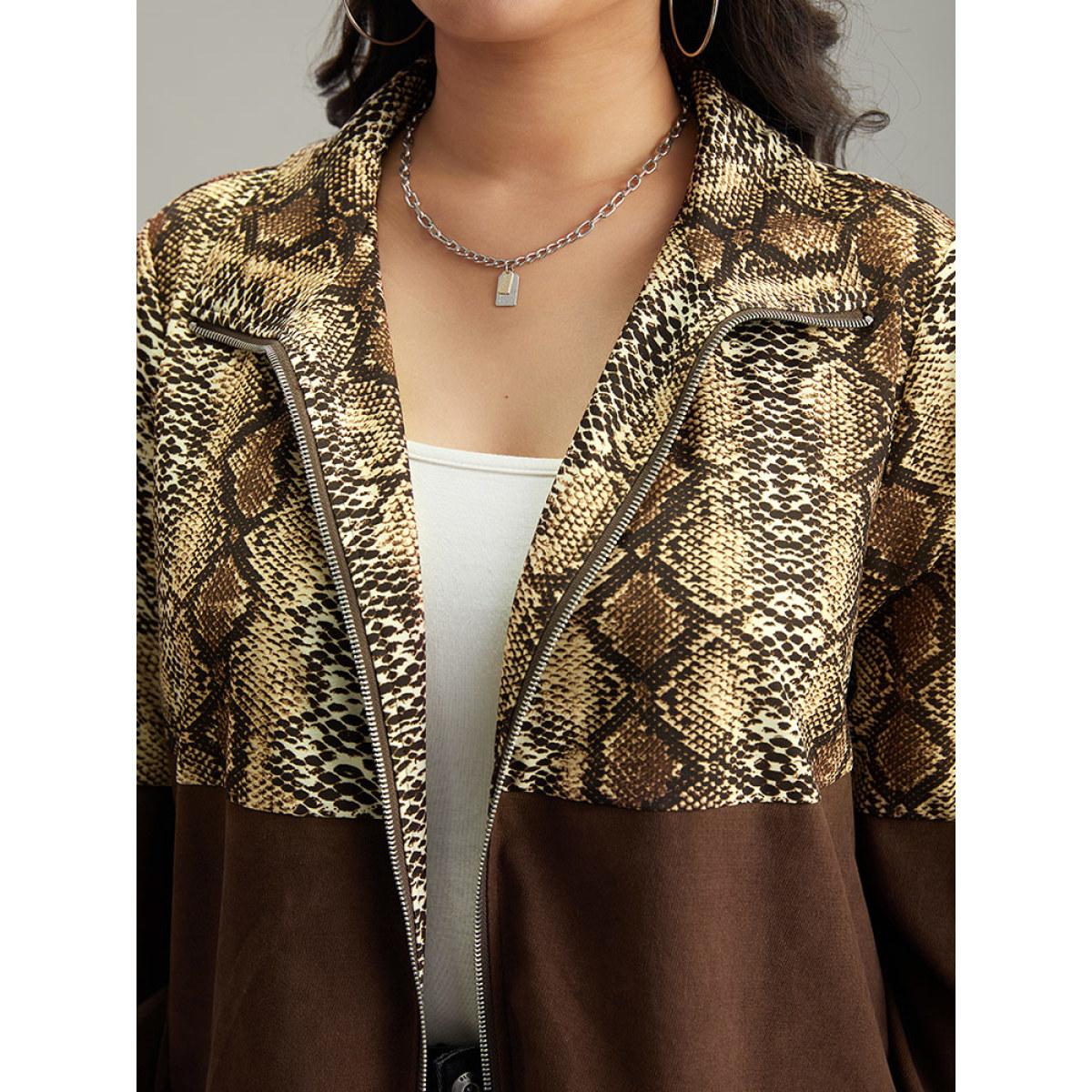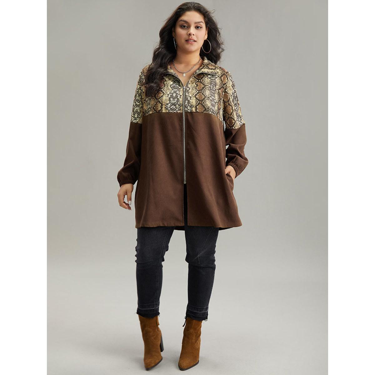 Plus Size Snakeskin Print Patchwork Contrast Zipper Windbreaker Women DarkBrown Casual Contrast Ladies Dailywear Winter Coats BloomChic 26/4X