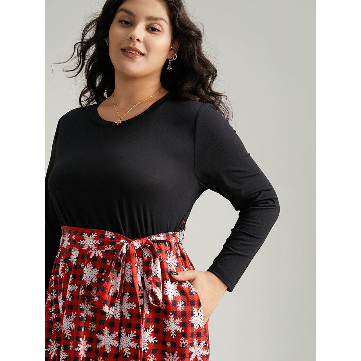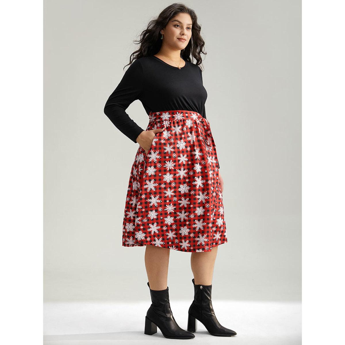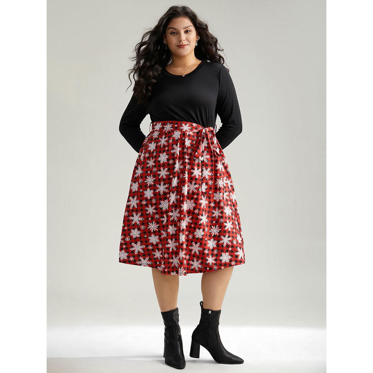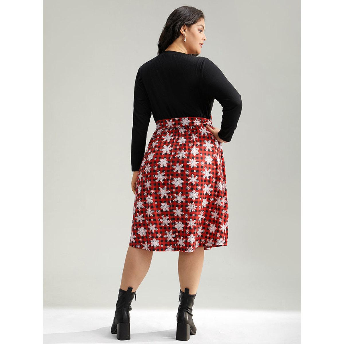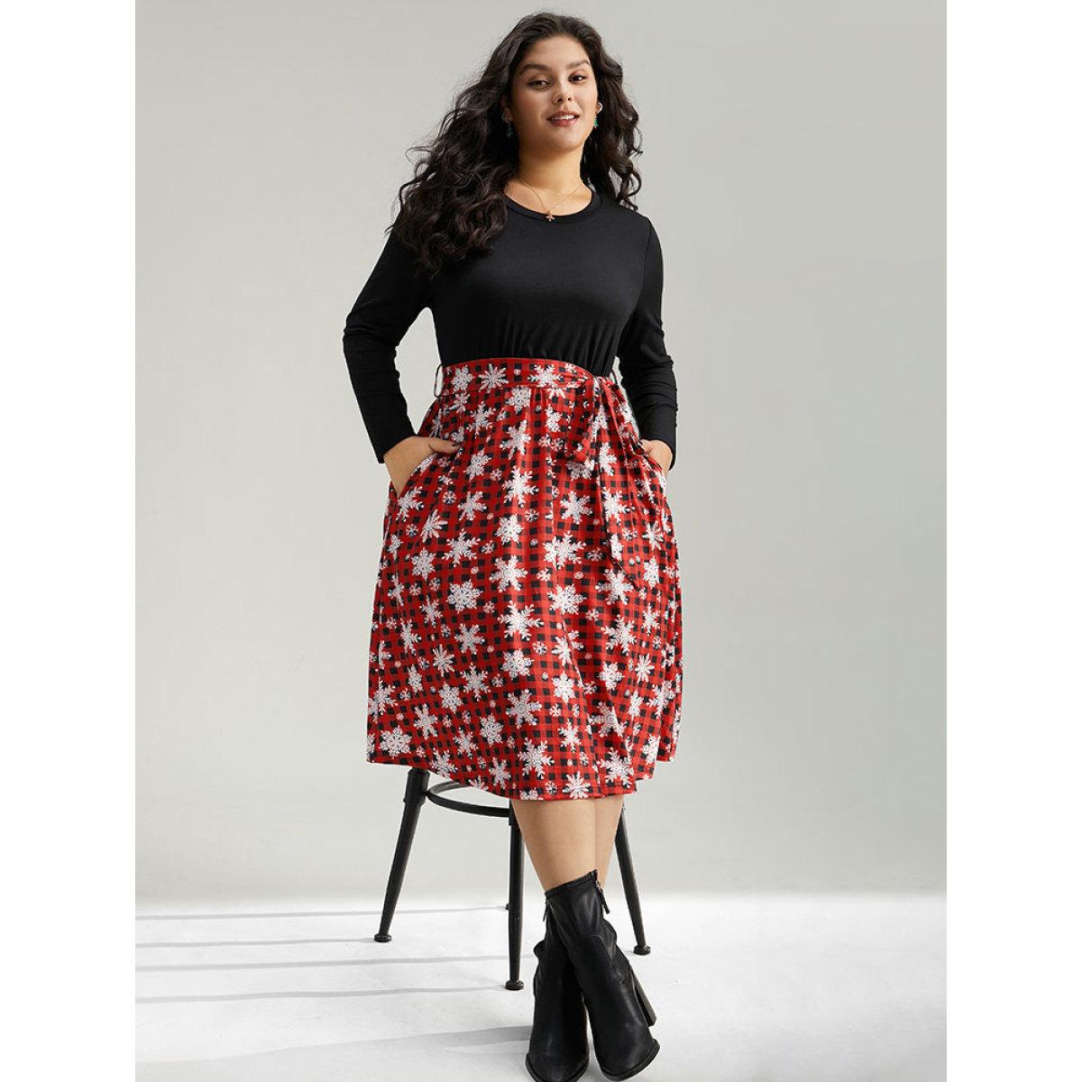 Plus Size Snowflake Print Contrast Belted Surplice Neck Dress Multicolor Women Elegant Wrap Overlap Collar Long Sleeve Curvy Midi Dress BloomChic 12/L