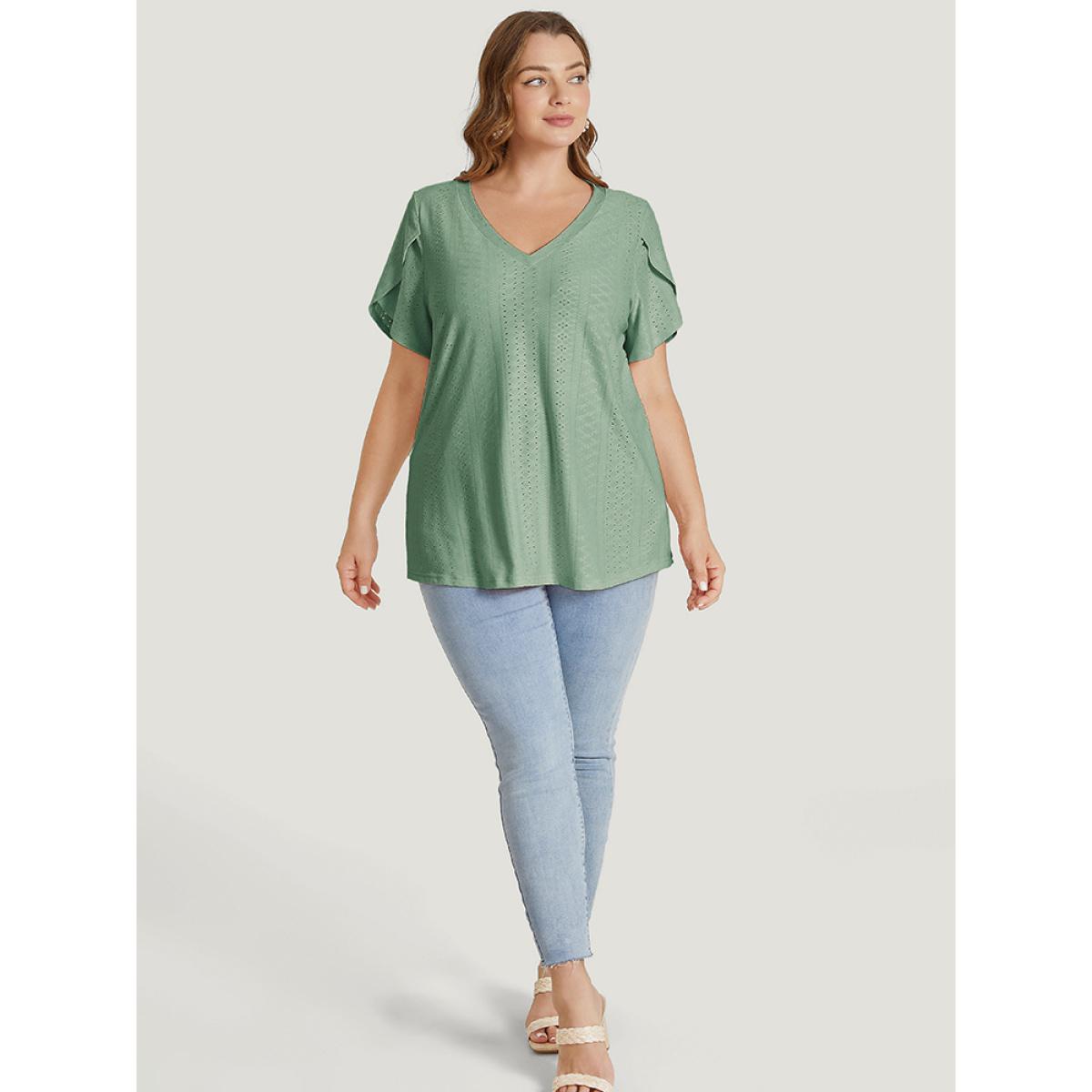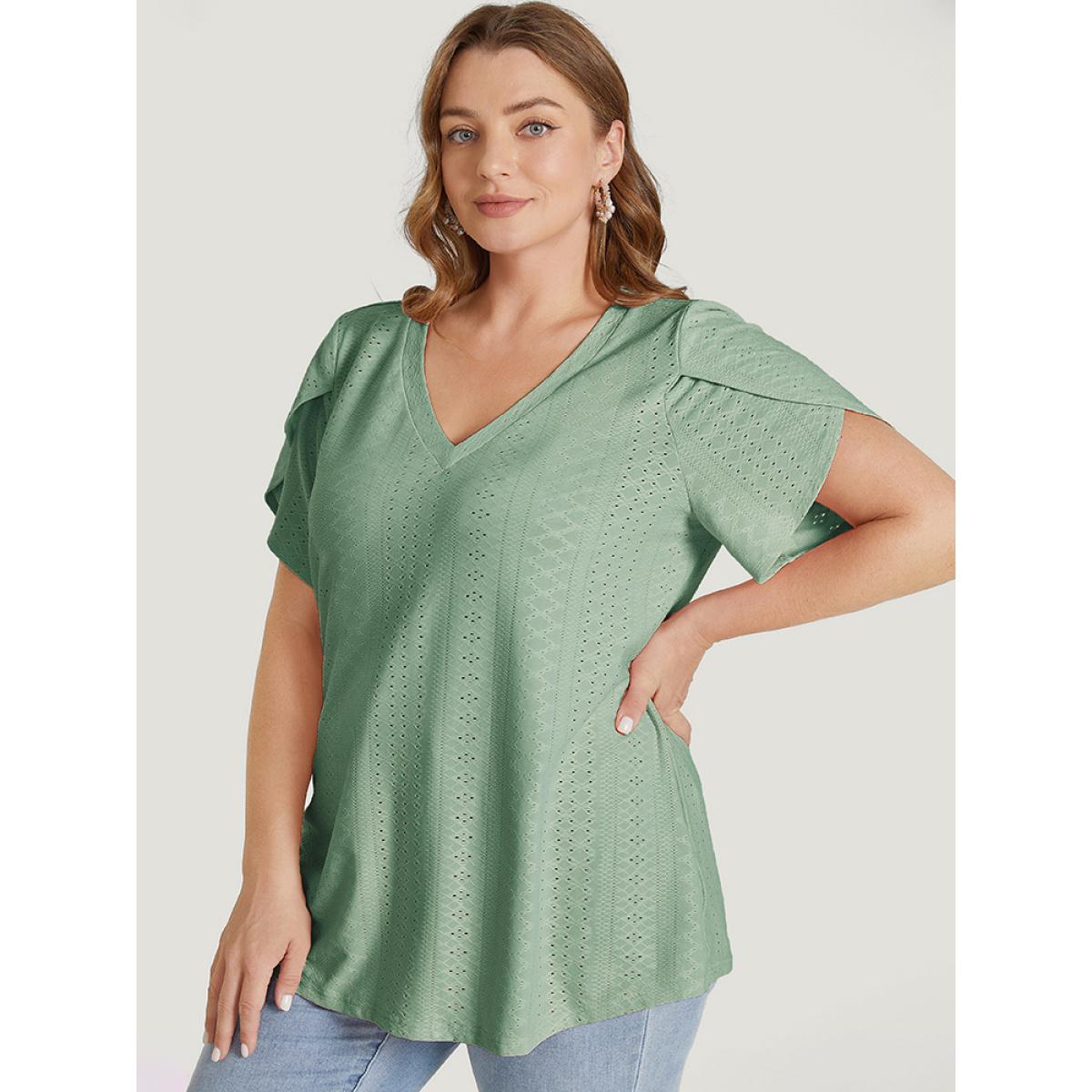 Plus Size Solid Broderie Anglaise Flounce Sleeve T-shirt Mint Women Elegant Broderie anglaise Plain V-neck Dailywear T-shirts BloomChic 12/L