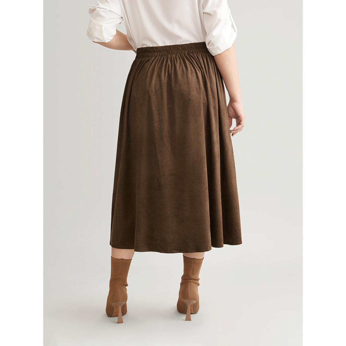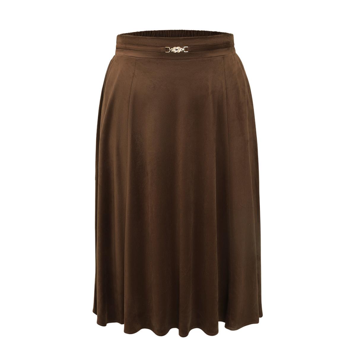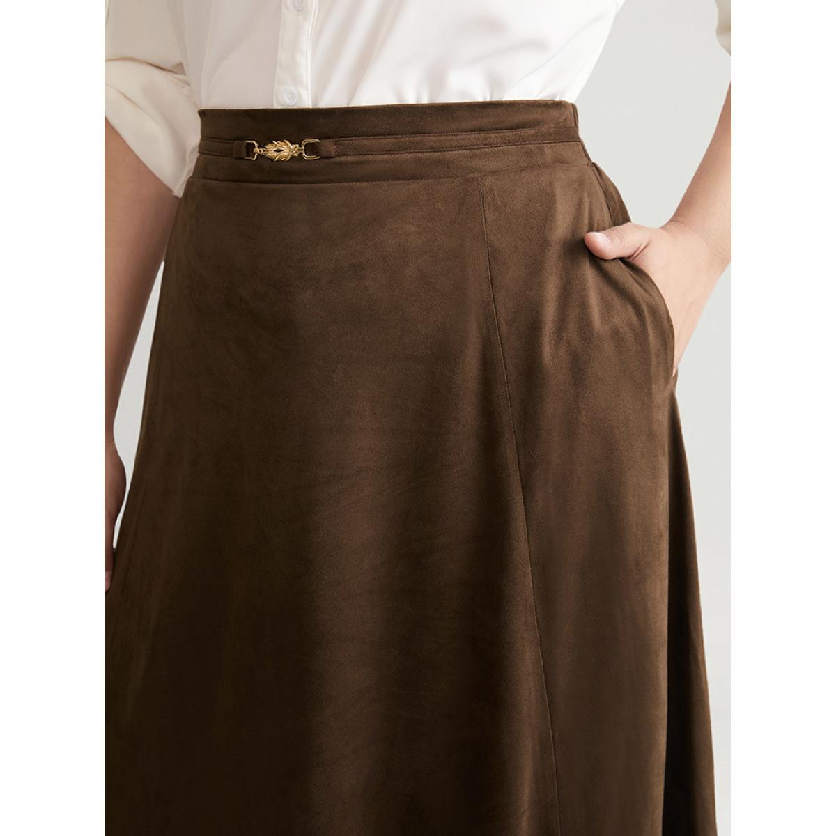 Plus Size Solid Buckle Detail Faux Suede A-line Skirt Women Bronze Office Style accents No stretch Pocket Work Skirts BloomChic 12/L