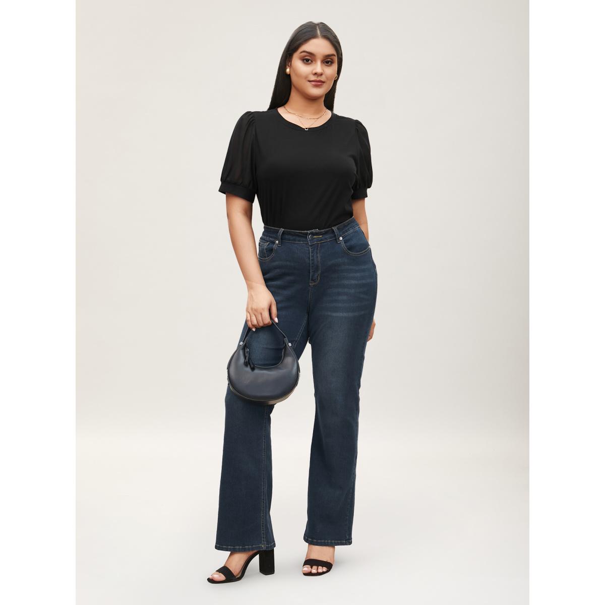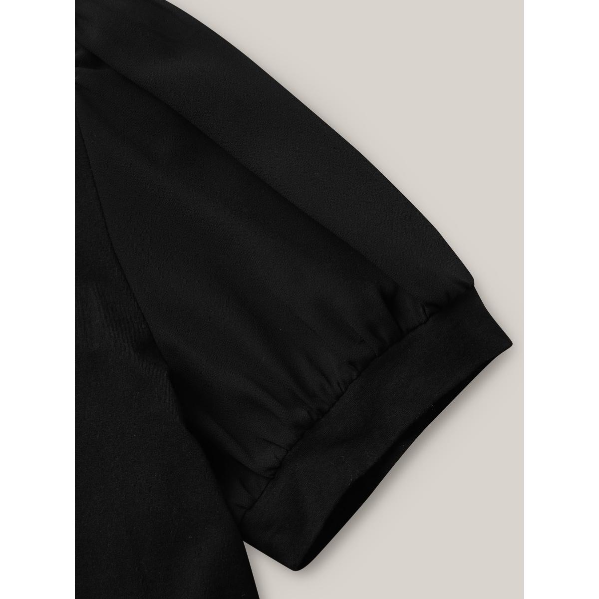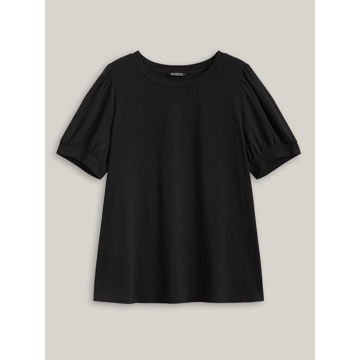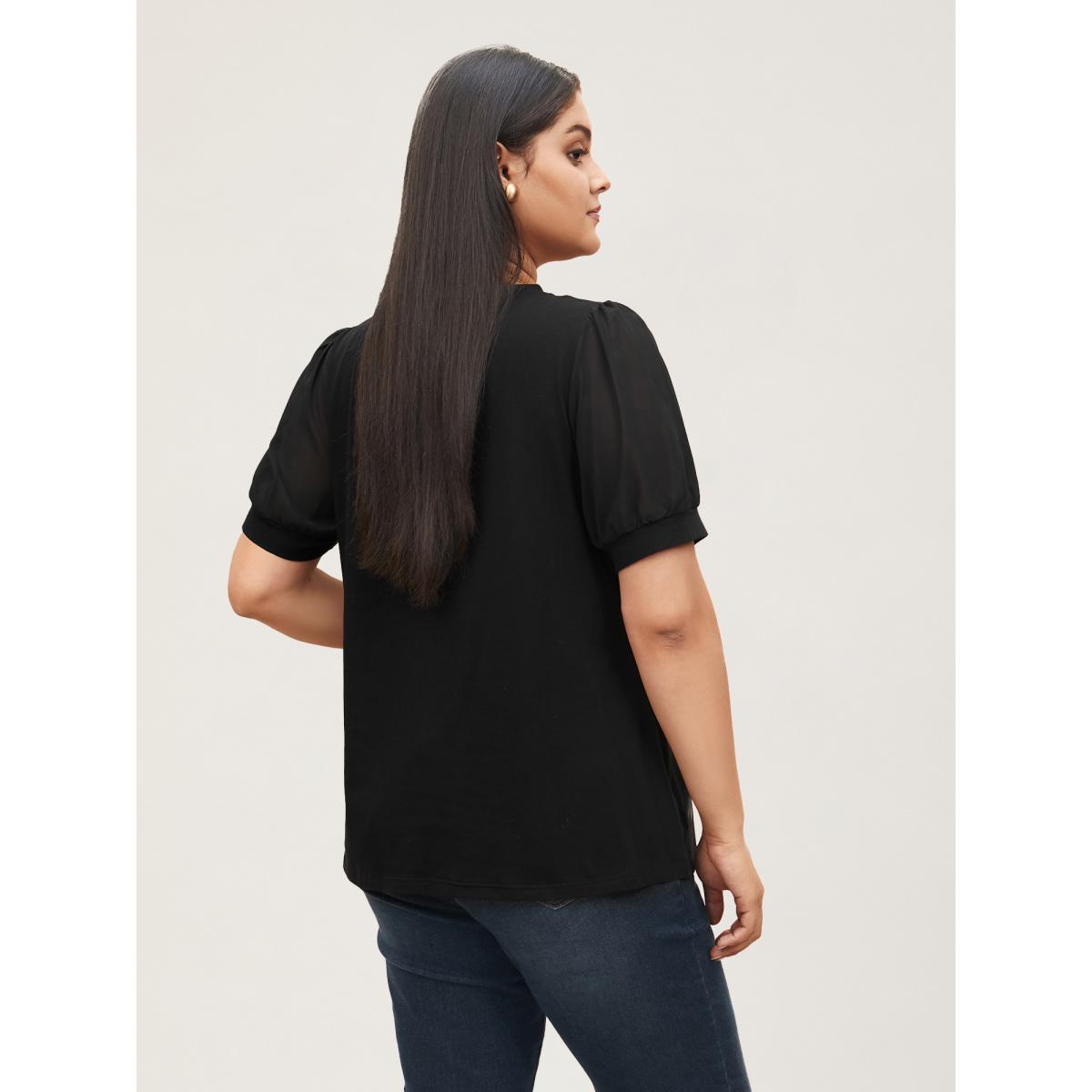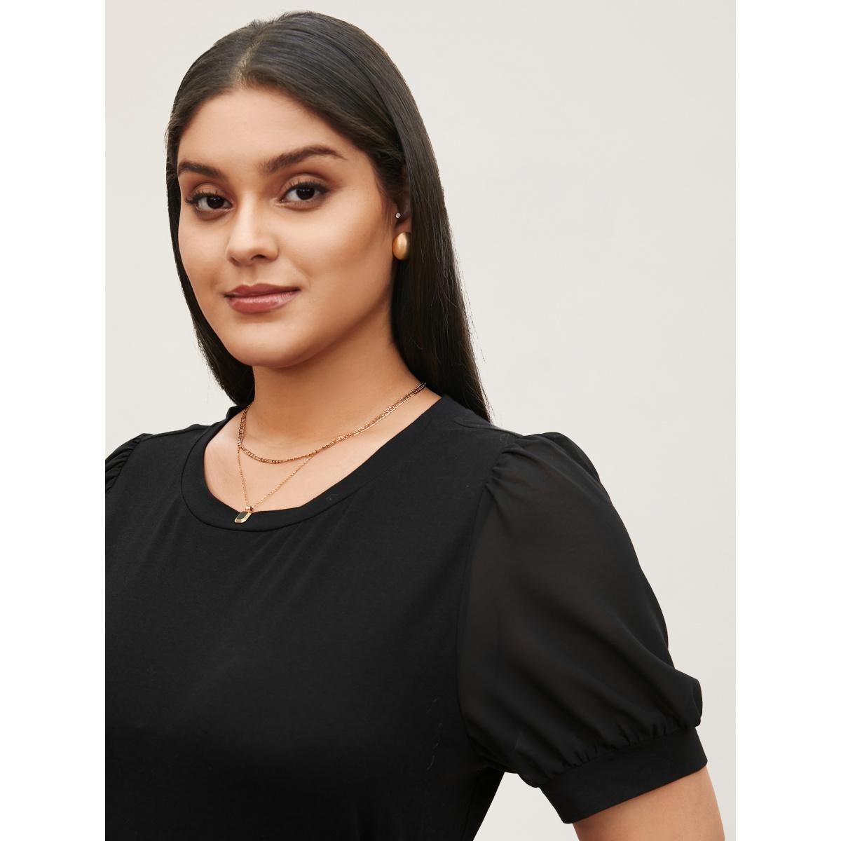 Plus Size Solid Chiffon Patchwork Puff Sleeve T-shirt Black Women Workwear Essentials Patchwork Round Neck Office T-shirts BloomChic 28/5X