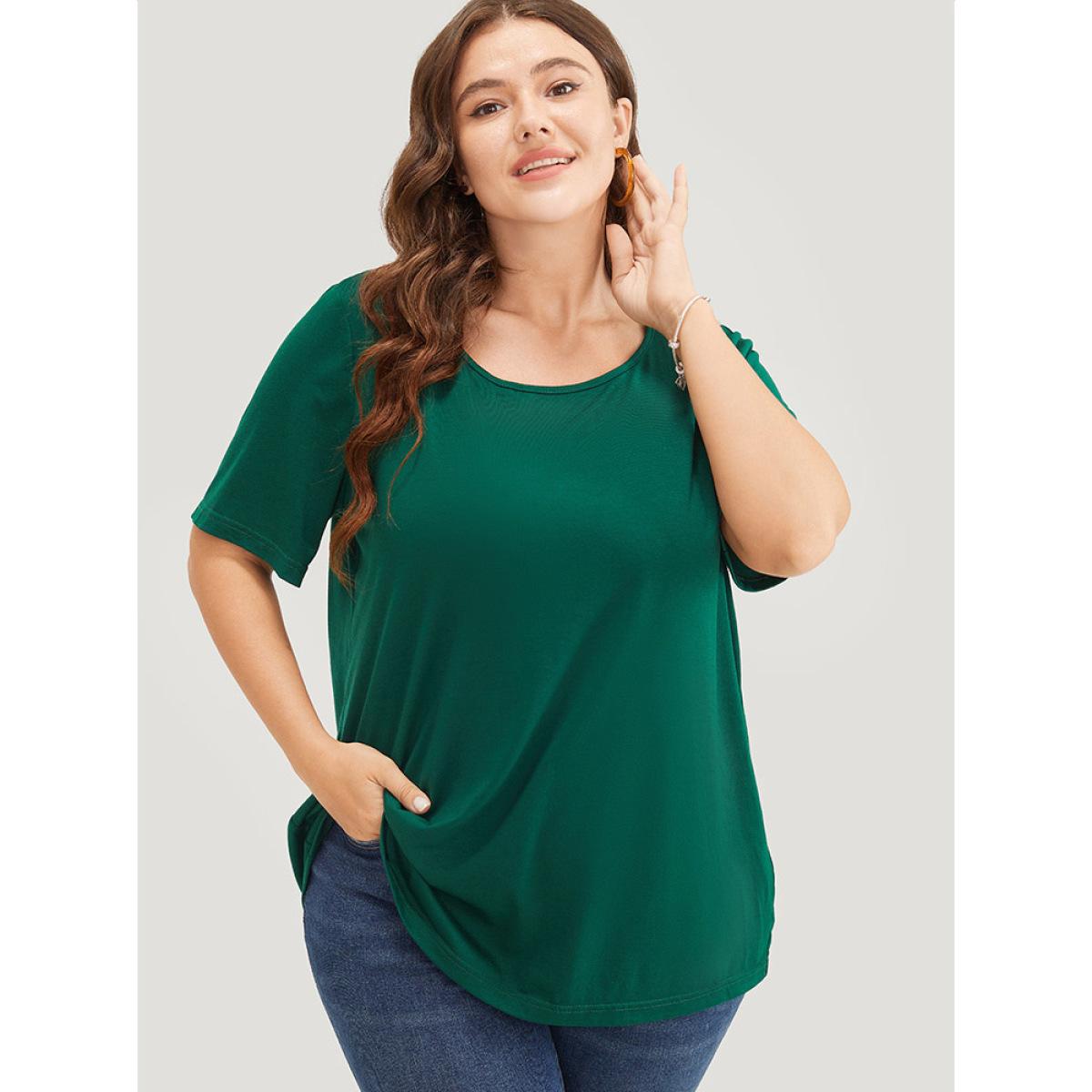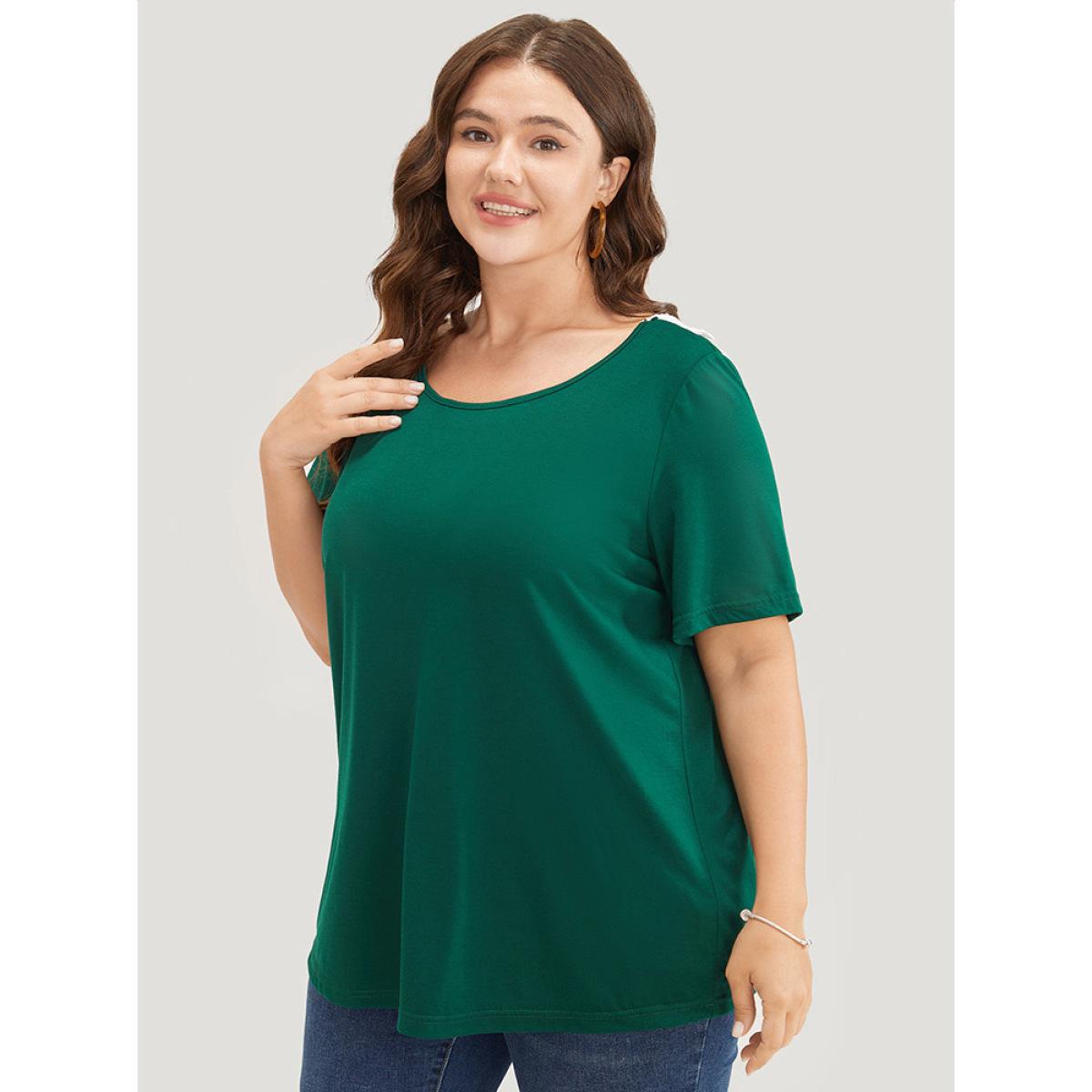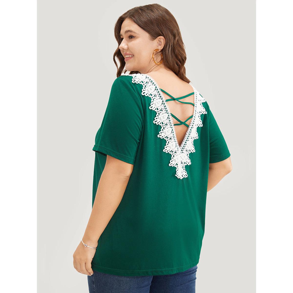 Plus Size Solid Contrast Lace Crisscross Back T-shirt DarkGreen Women Elegant Lace Plain Round Neck Dailywear T-shirts BloomChic 22-24/3X