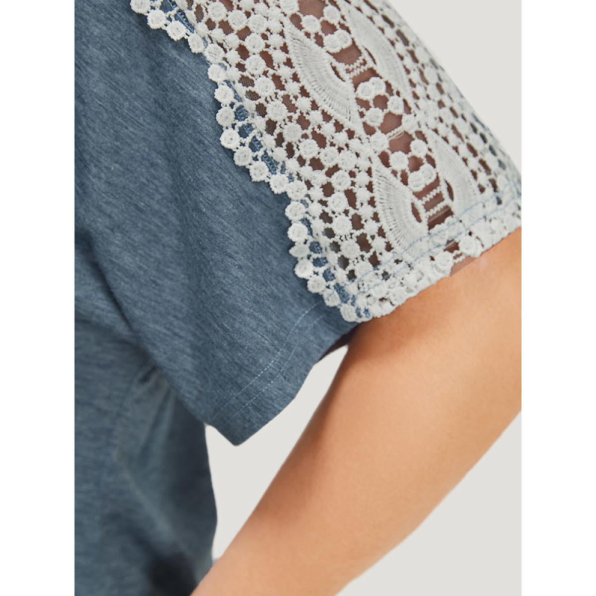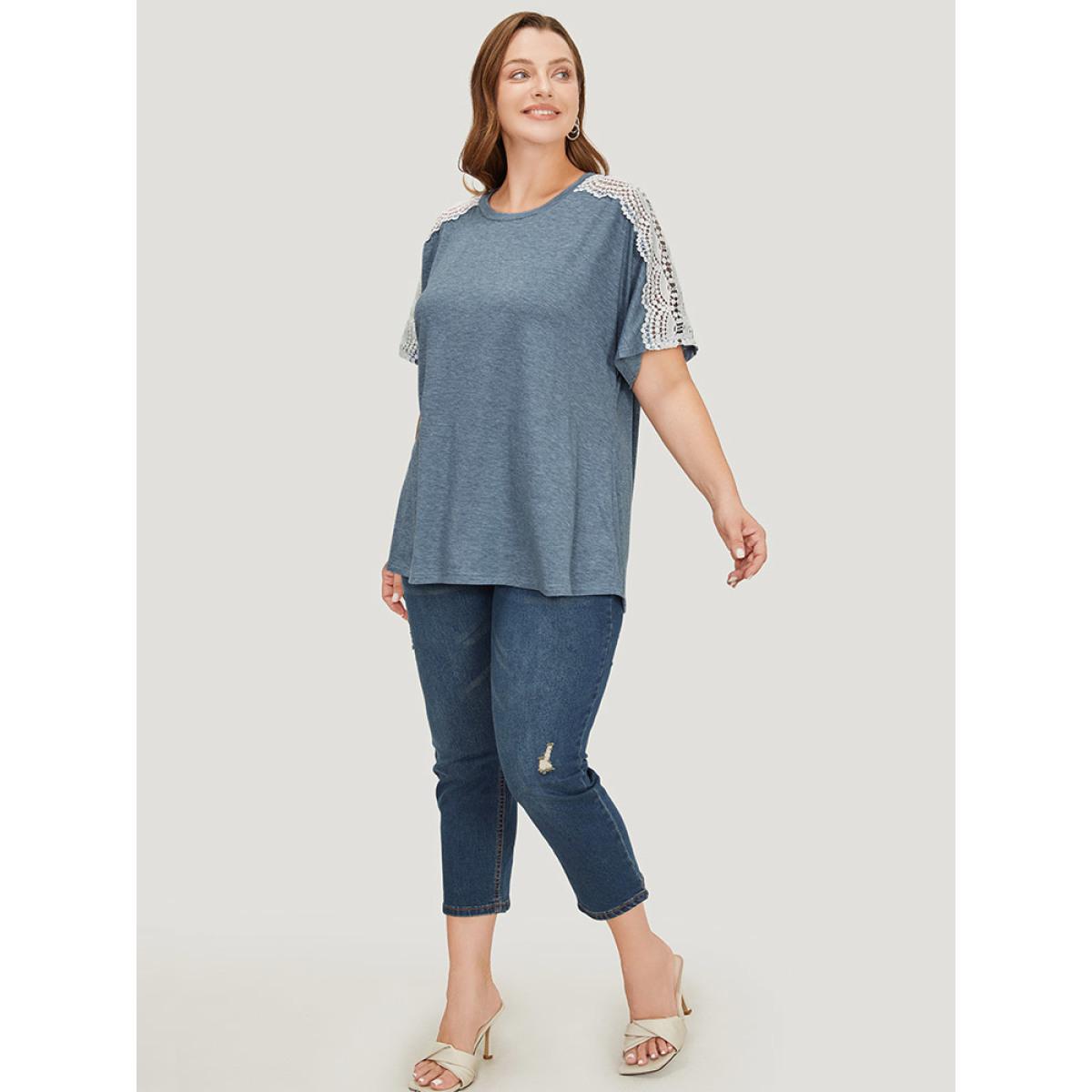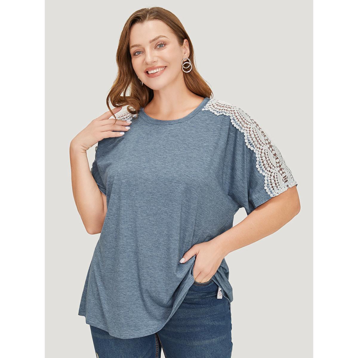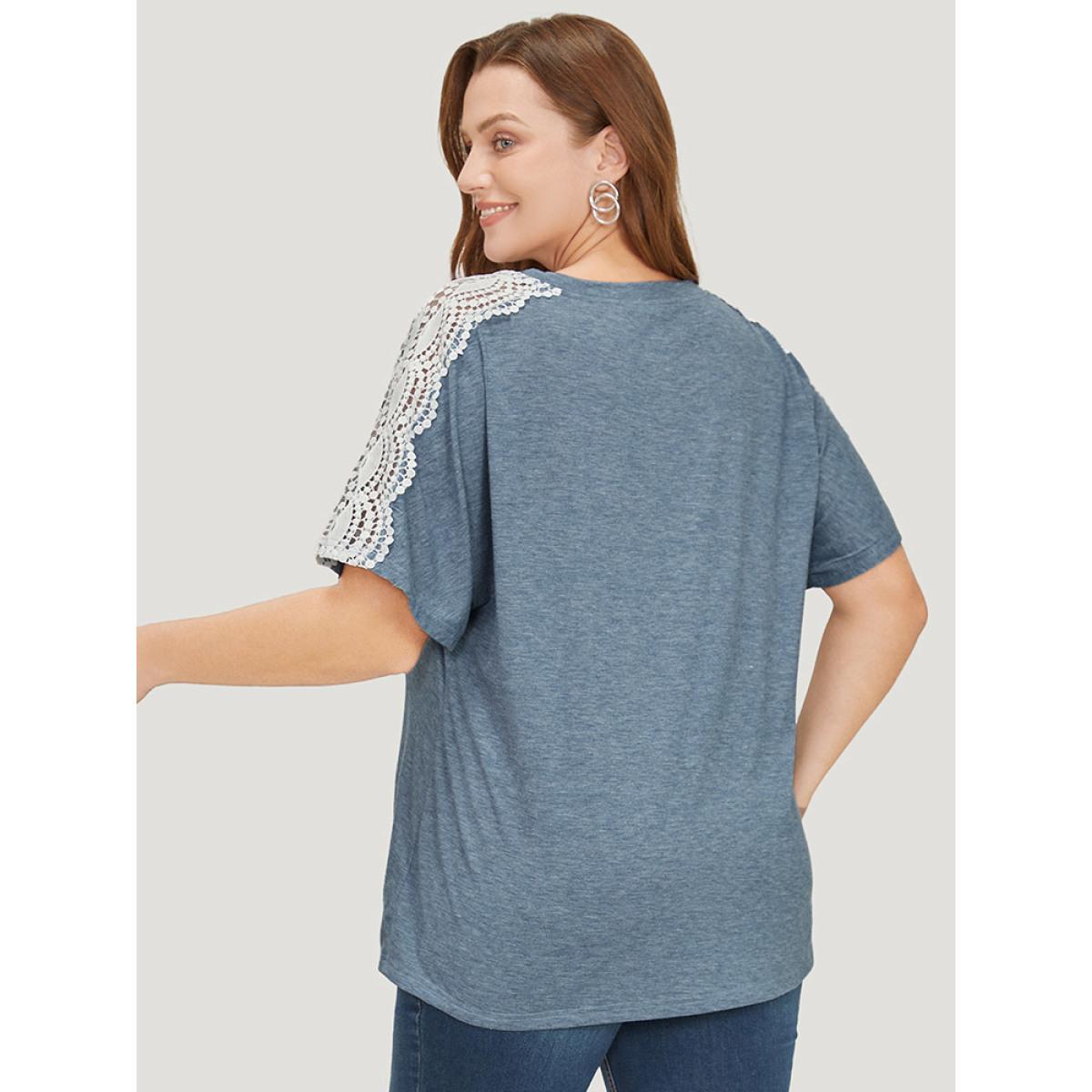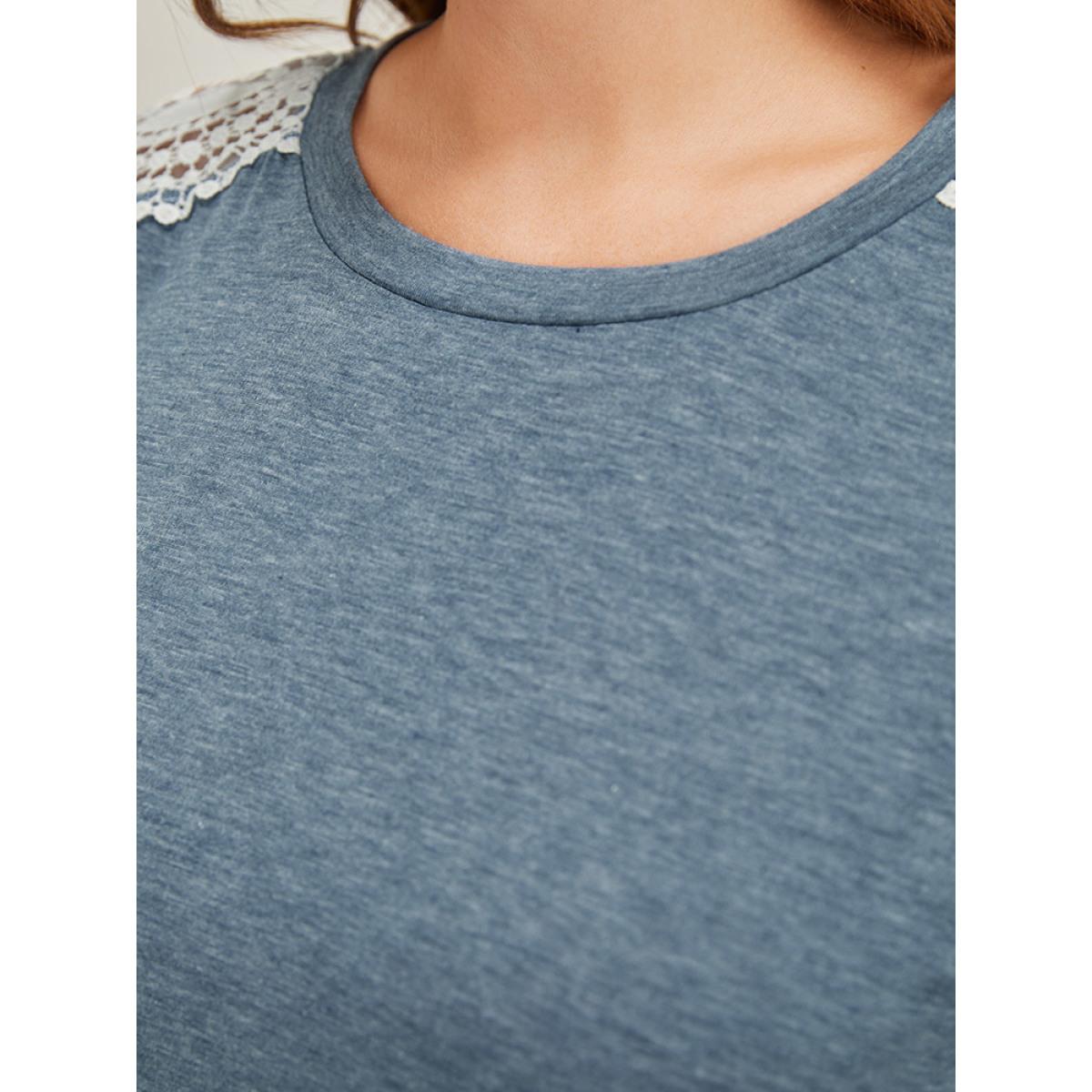 Plus Size Solid Contrast Lace Heather T-shirt Stone Women Elegant Heather Plain Round Neck Dailywear T-shirts BloomChic 14-16/1X