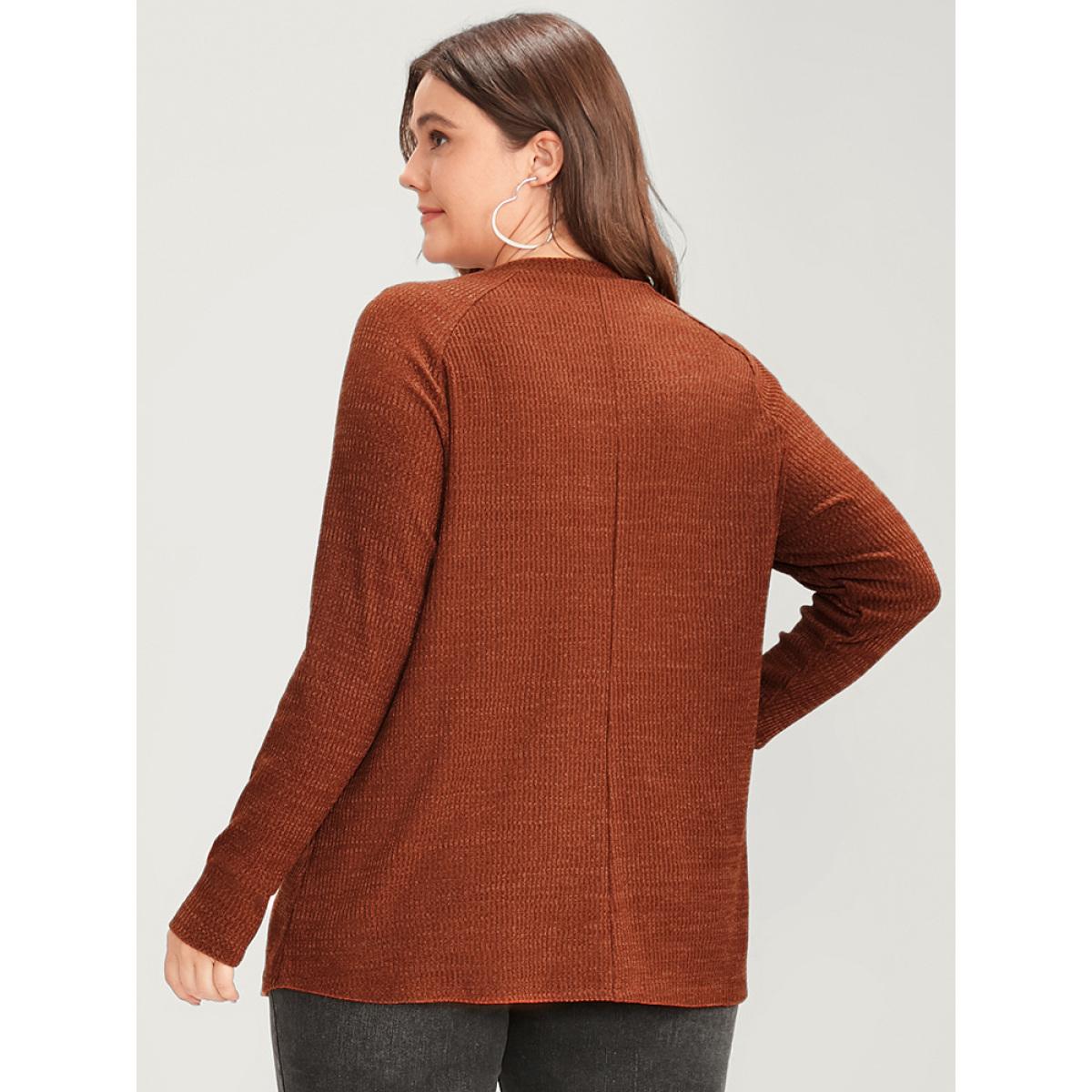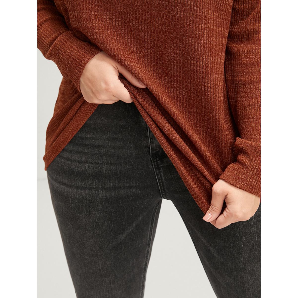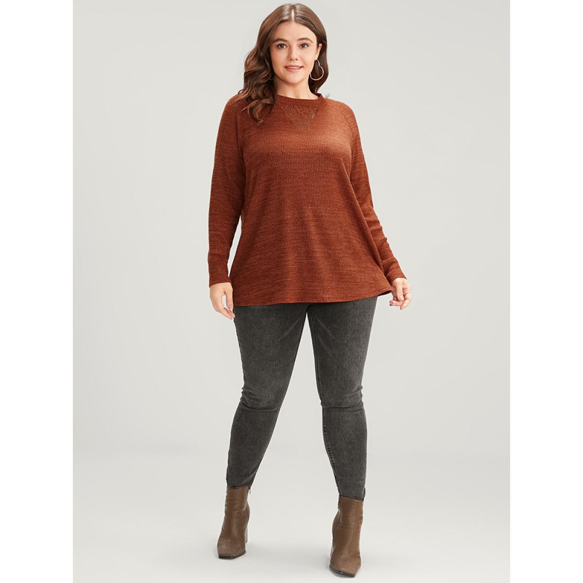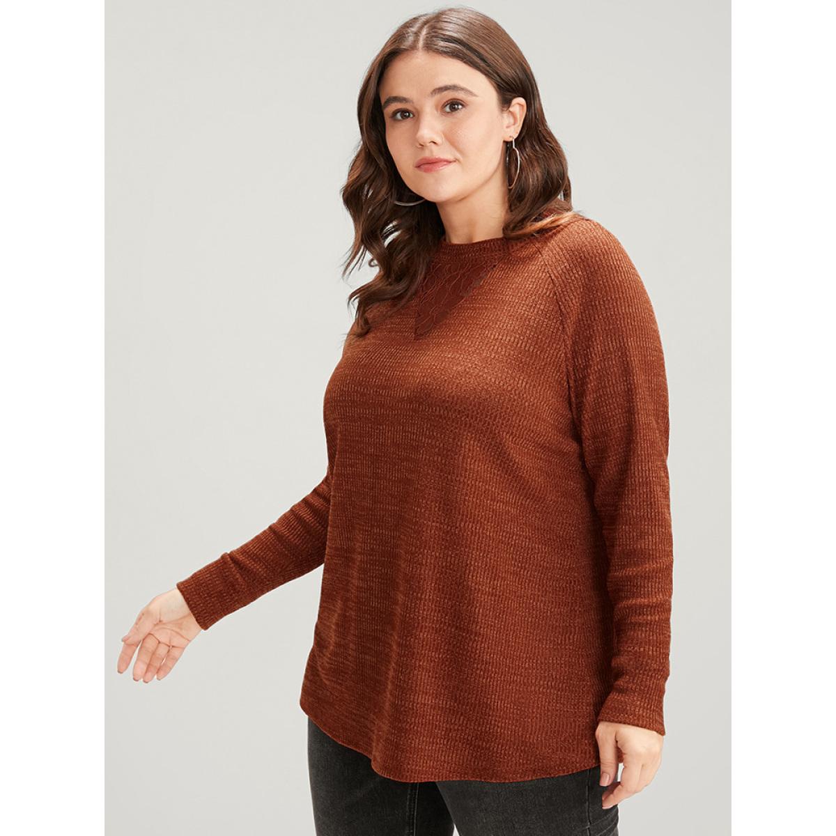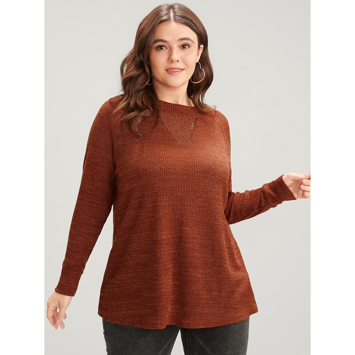 Plus Size Solid Contrast Lace Mock Neck Rib Knit Long Tee Russet Women Elegant Patchwork Plain Mock Neck Dailywear T-shirts BloomChic 14-16/1X