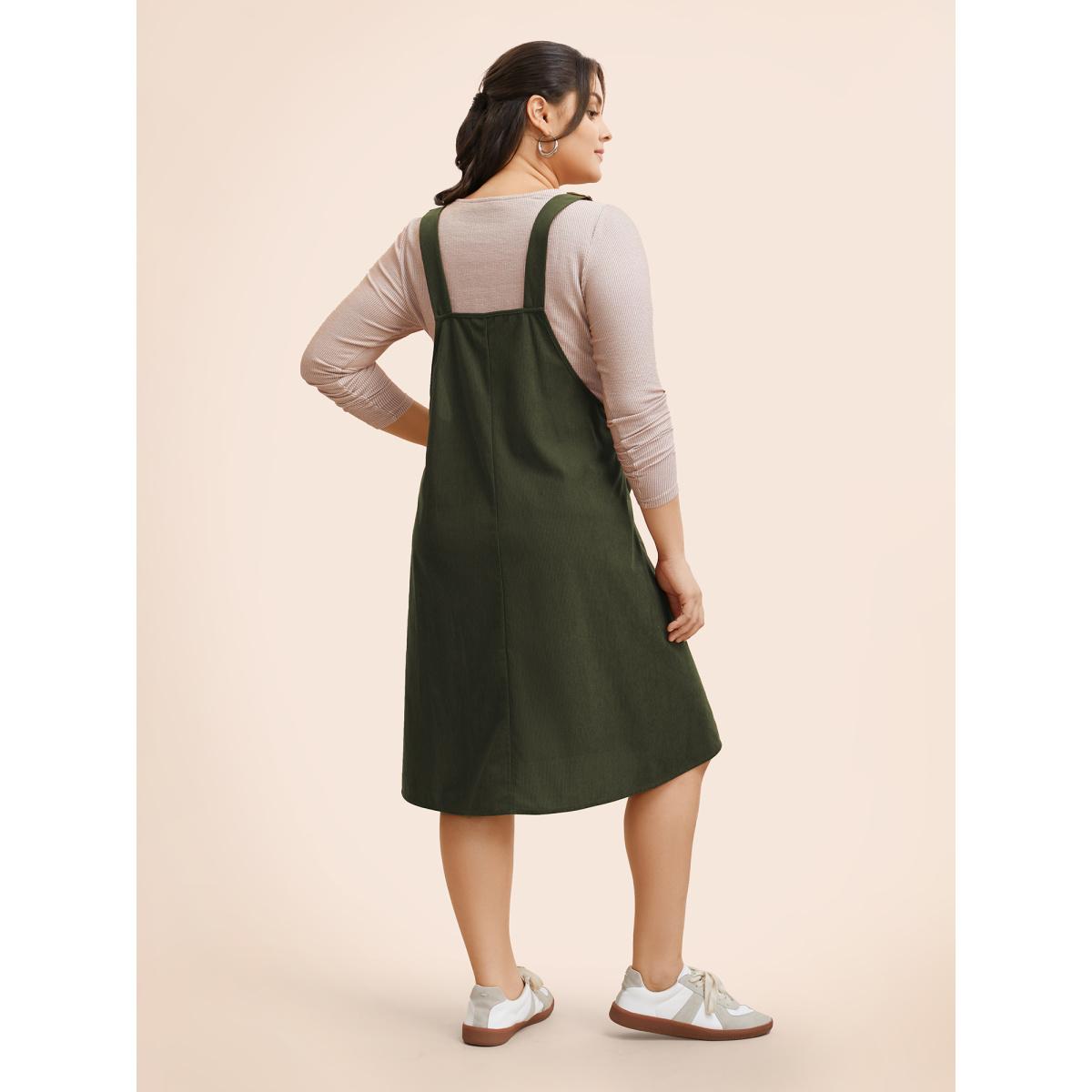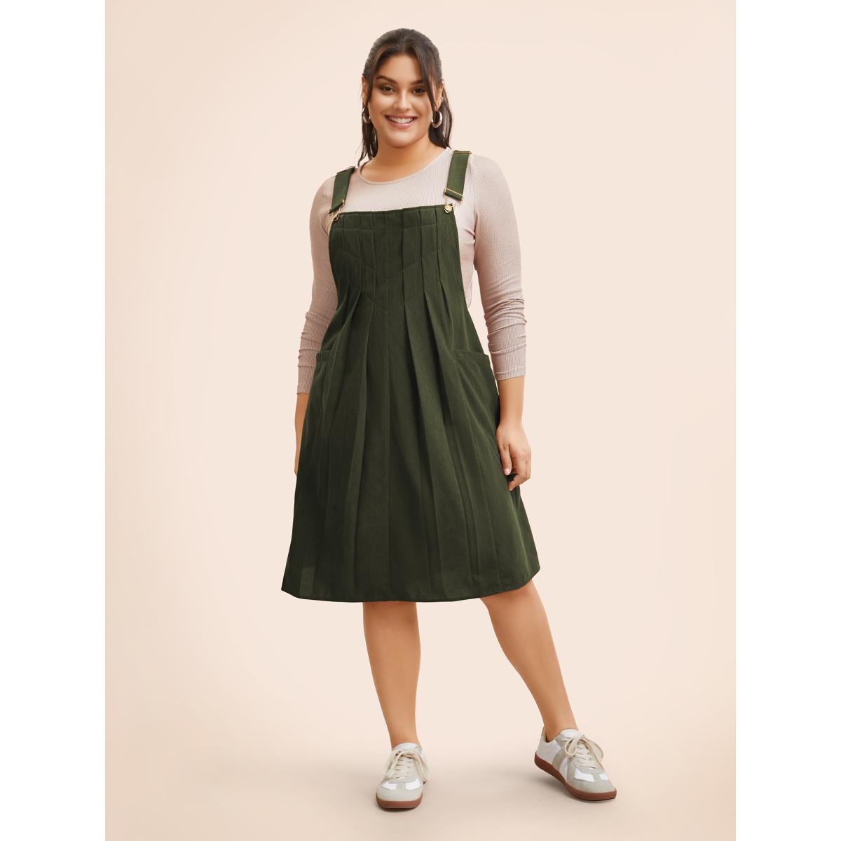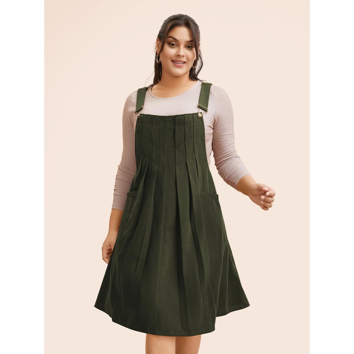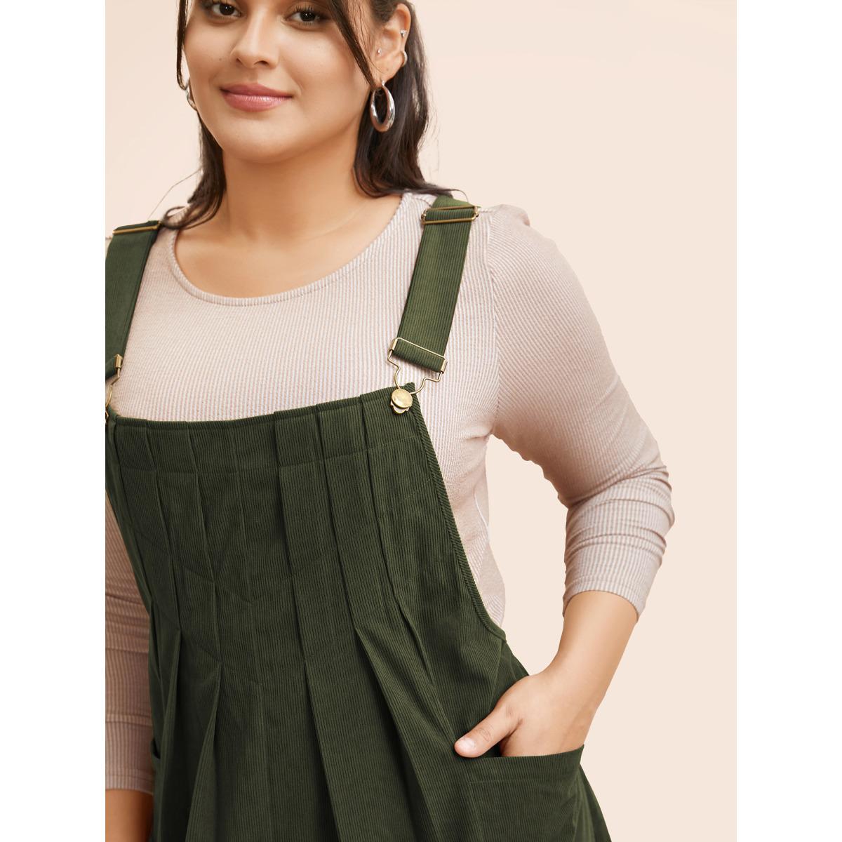 Plus Size Solid Corduroy Pleated Overall Dress ArmyGreen Women Casual Texture Non Sleeveless Curvy BloomChic 26/4X