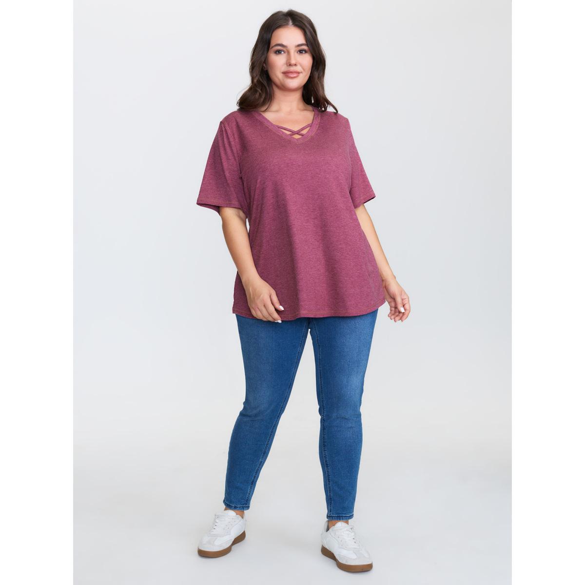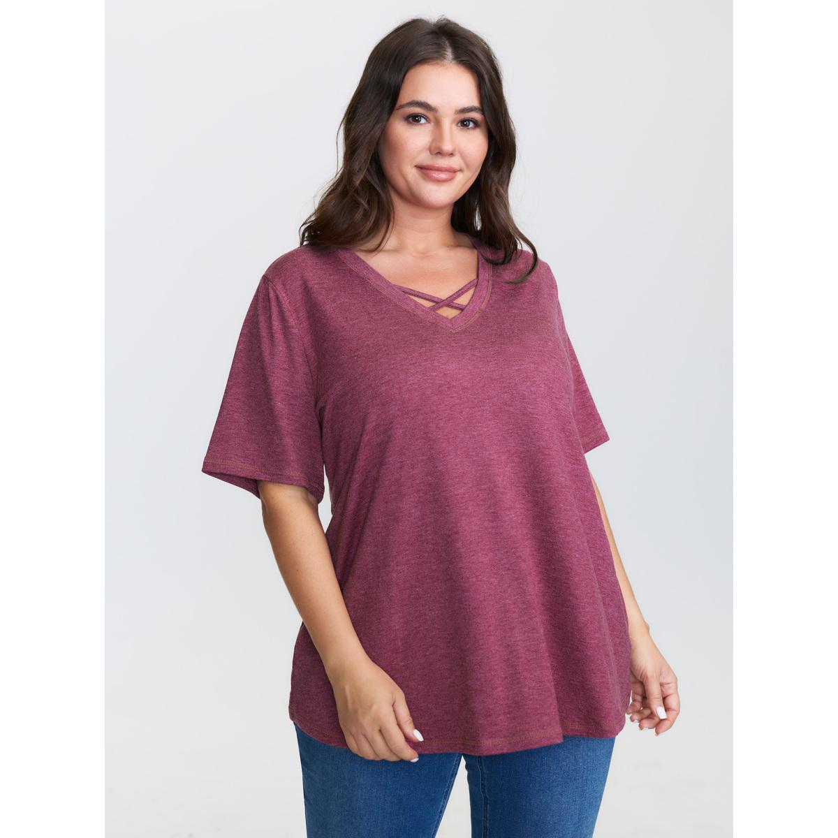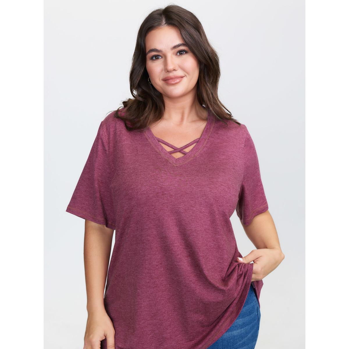 Plus Size Solid Crisscross Neck Contrast Stitch T-shirt RedViolet Women Leisure Heather Plain V-neck Casual T-shirts BloomChic 22-24/3X
