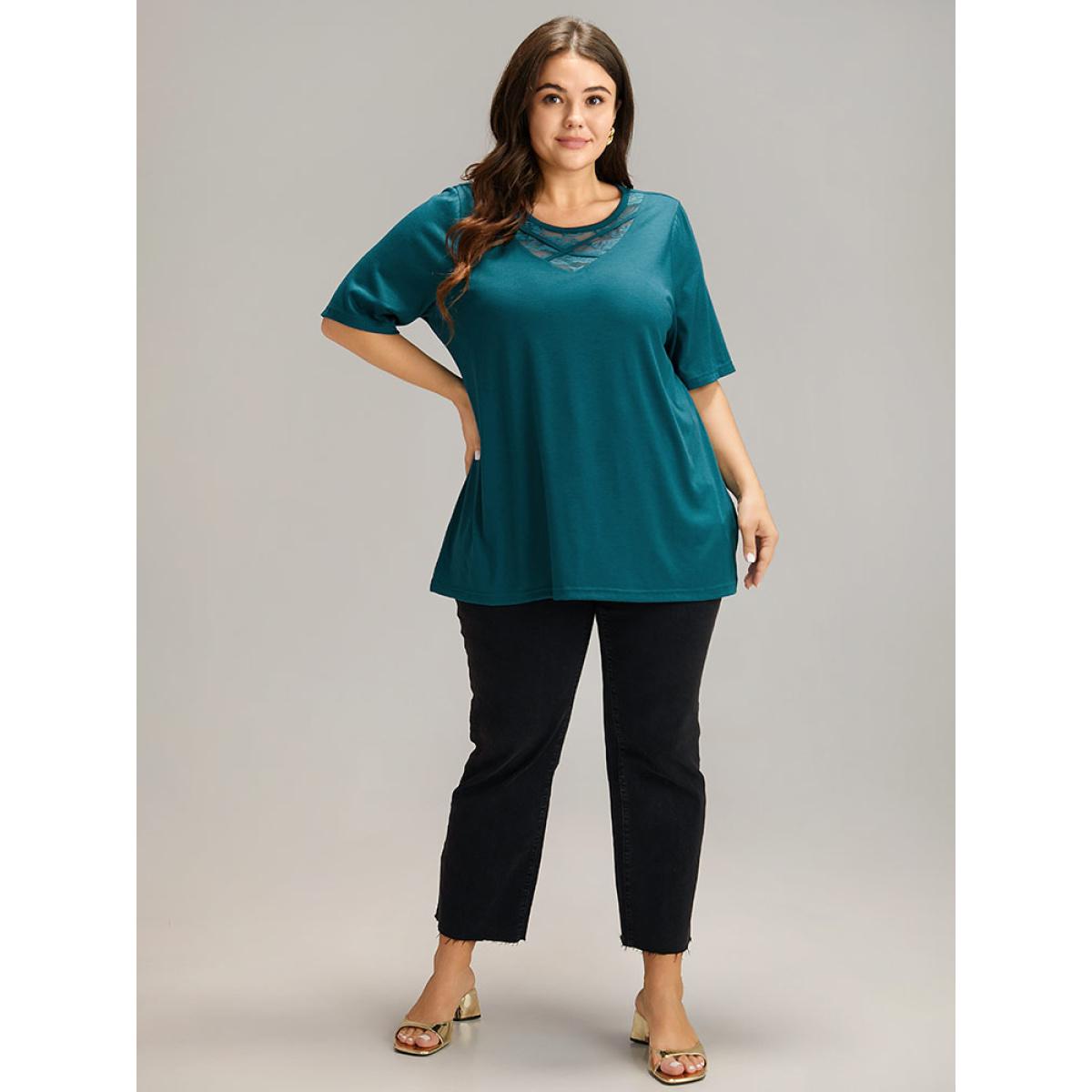 Plus Size Lace Sleeve V-Neck T-Shirt Cyan Women Casual See through V-neck Everyday T-shirts BloomChic 22-24/3X