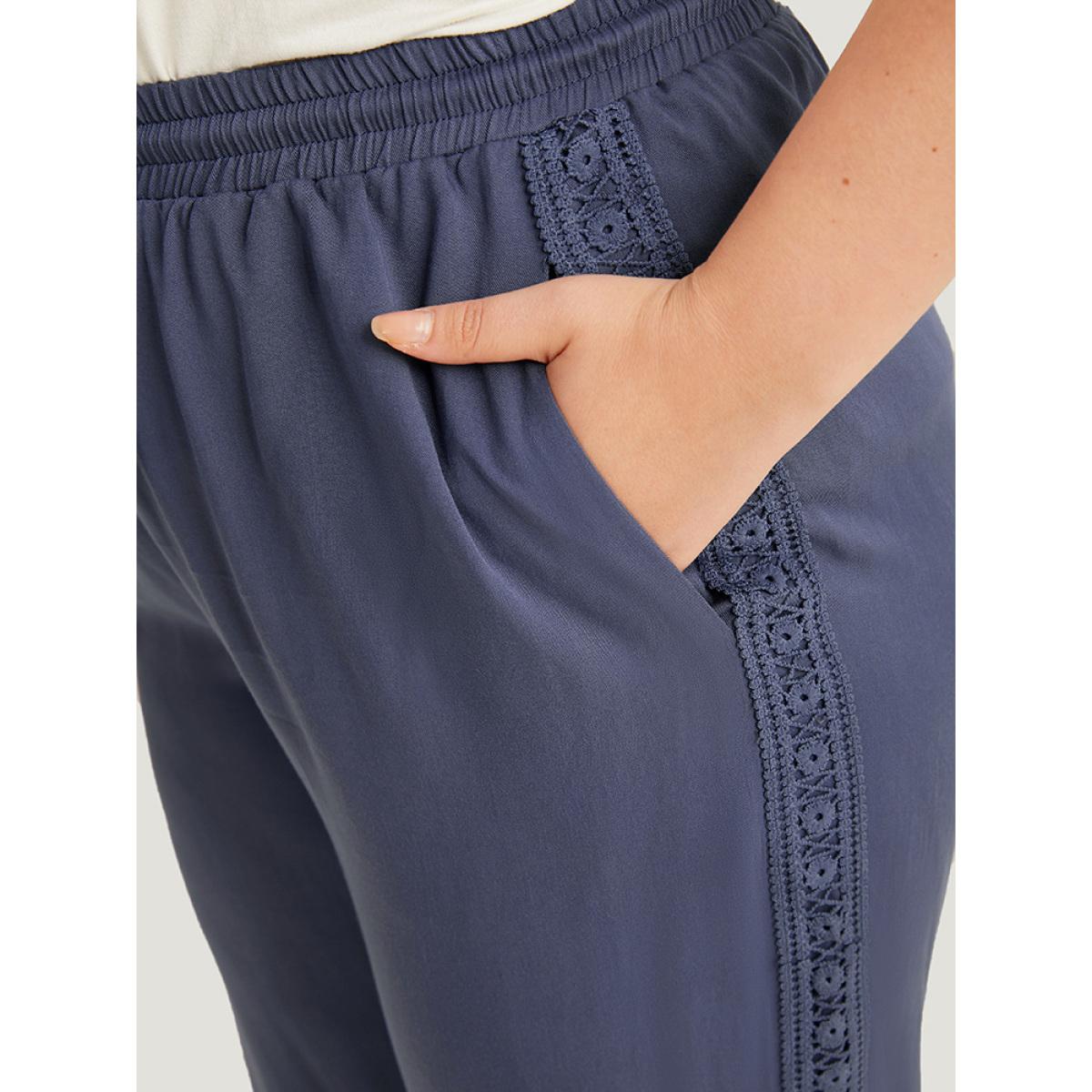 Plus Size Solid Lace Mesh Hem Pocket Elastic Waist Pants Women Black Elegant Loose High Rise Dailywear Pants BloomChic 14-16/1X