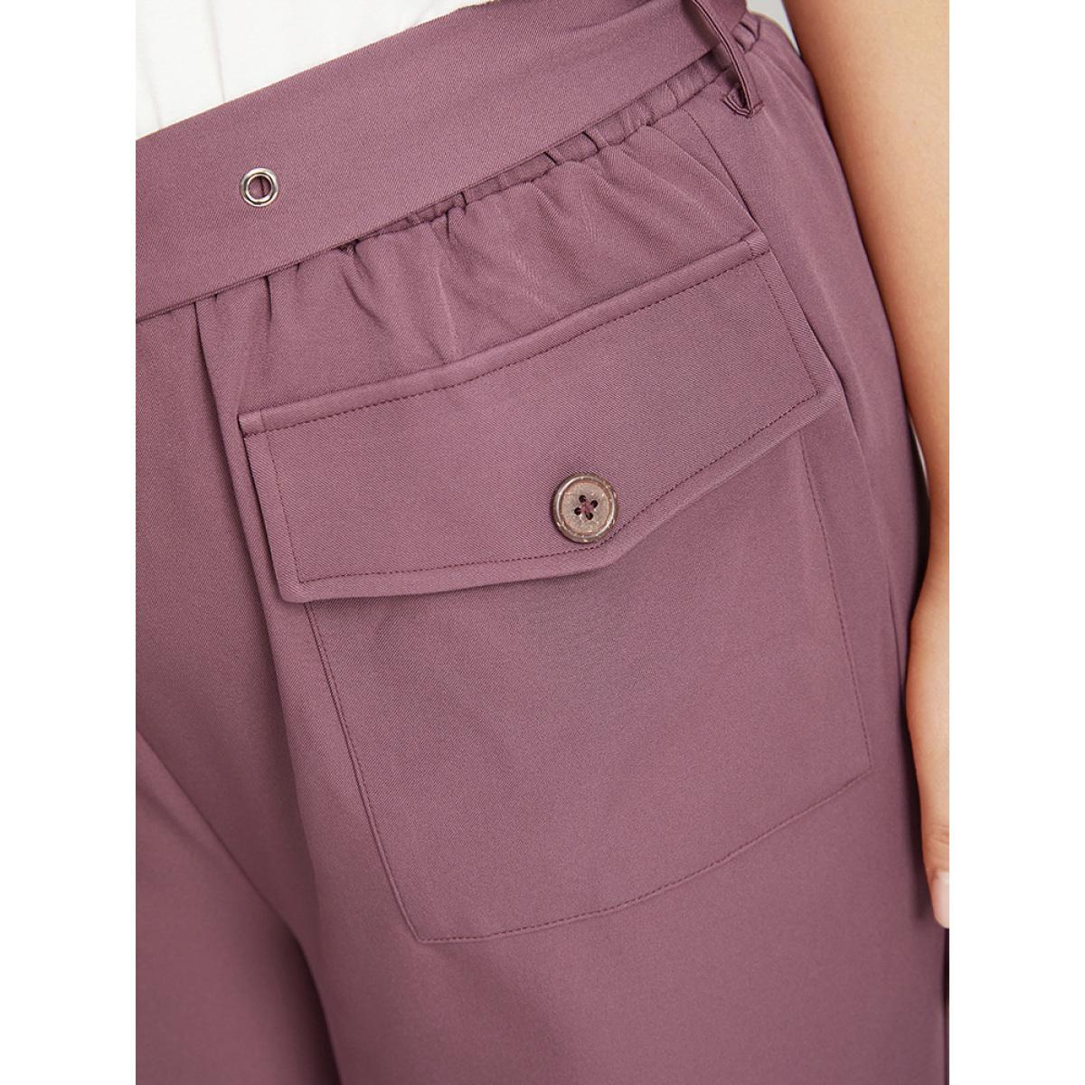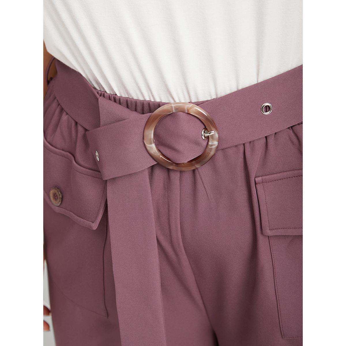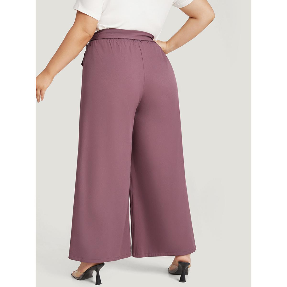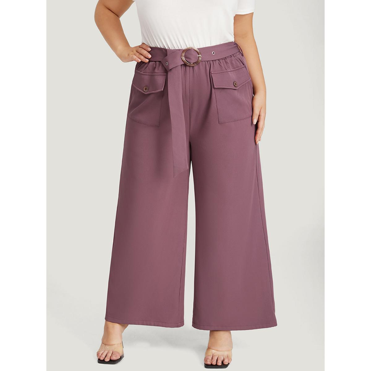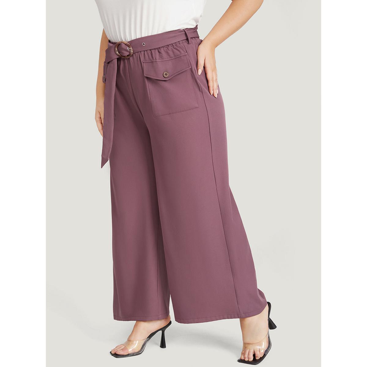 Plus Size Solid Flap Pocket Buckle Belt Wide Leg Pants Women Eggplant Office Straight Leg High Rise Office Pants BloomChic 12/L