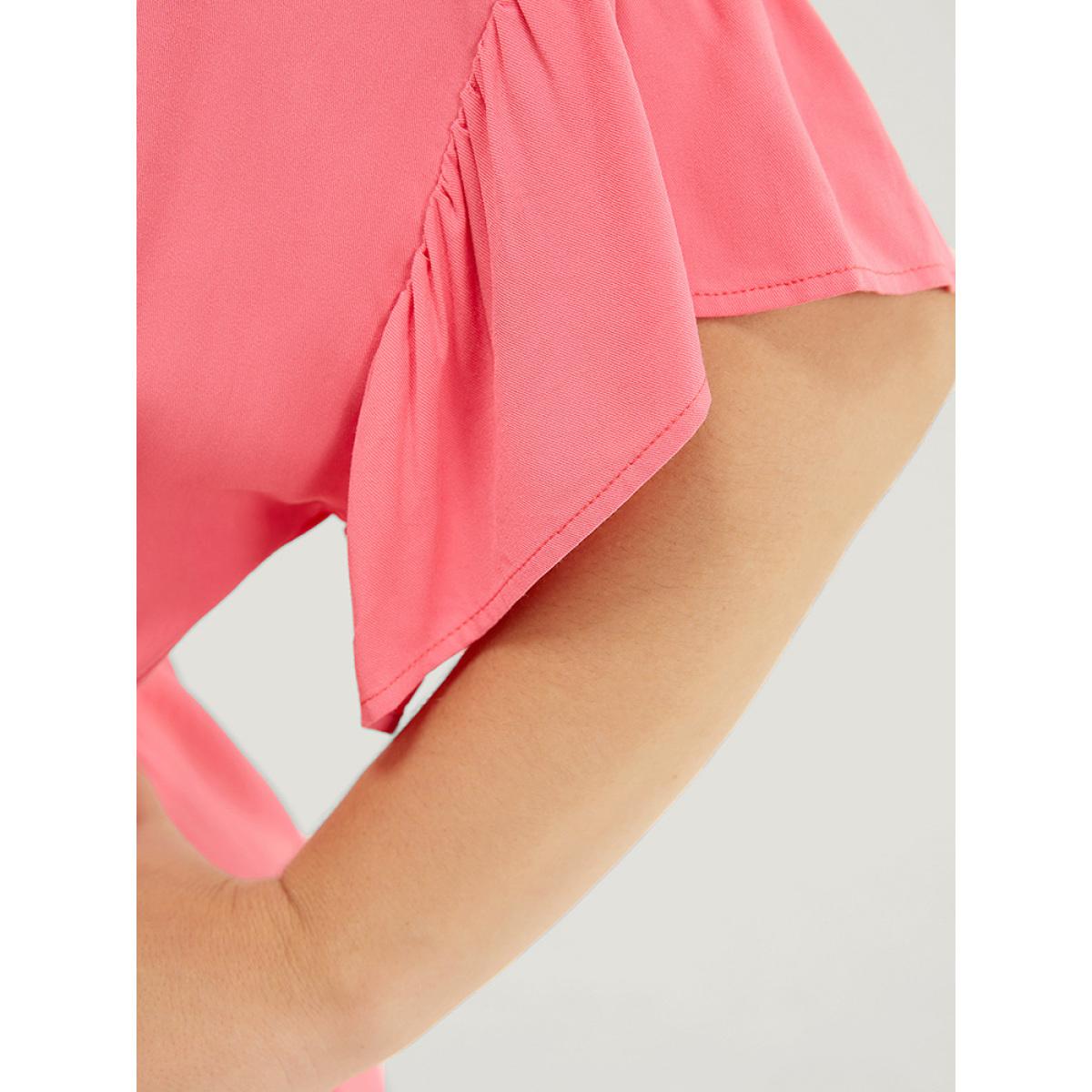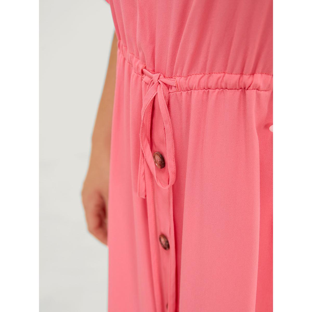 Plus Size Solid Flutter Sleeve Button Detail Pocket Drawstring Dress Watermelon Women Vacation Drawstring V-neck Short sleeve Curvy Midi Dress BloomChic 10/M