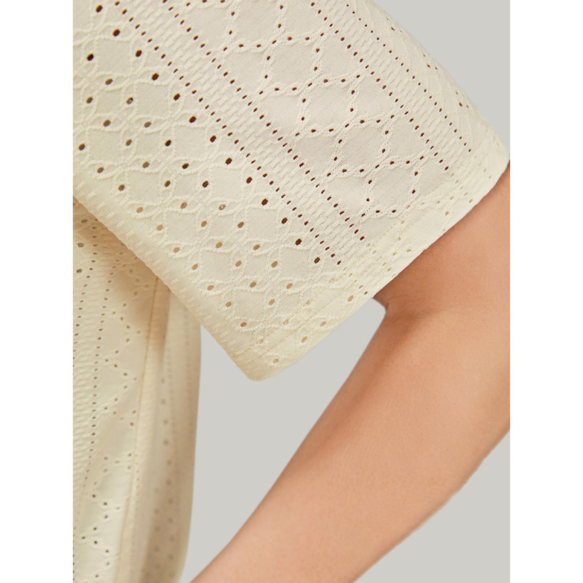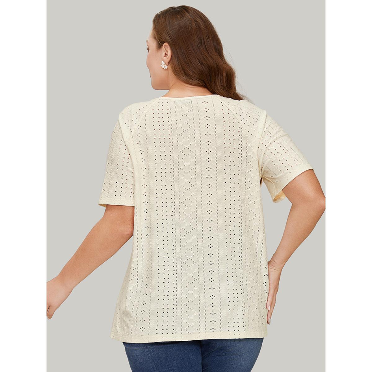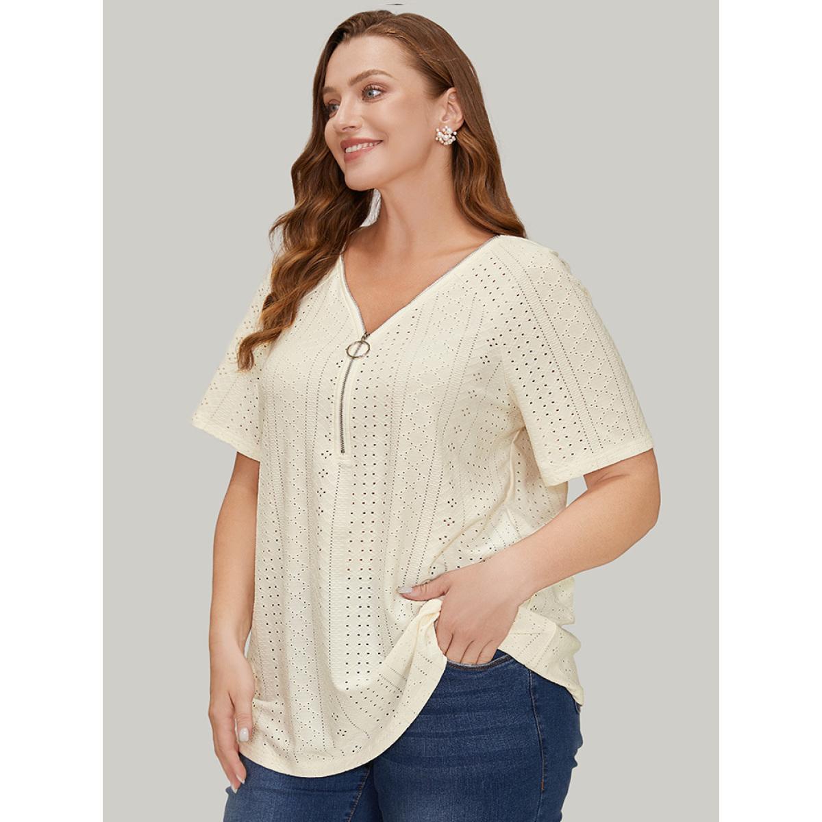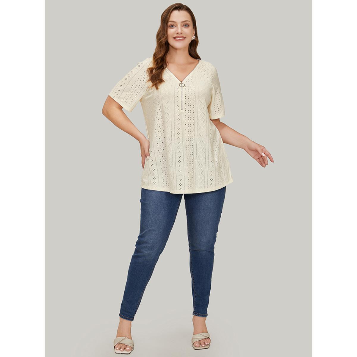 Plus Size Solid Half Zipper Broderie Anglaise T-shirt Ivory Women Elegant Zipper Plain V-neck Dailywear T-shirts BloomChic 10/M