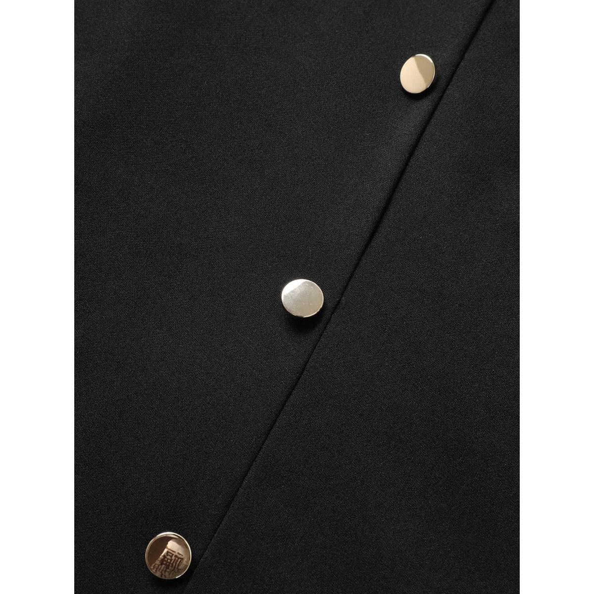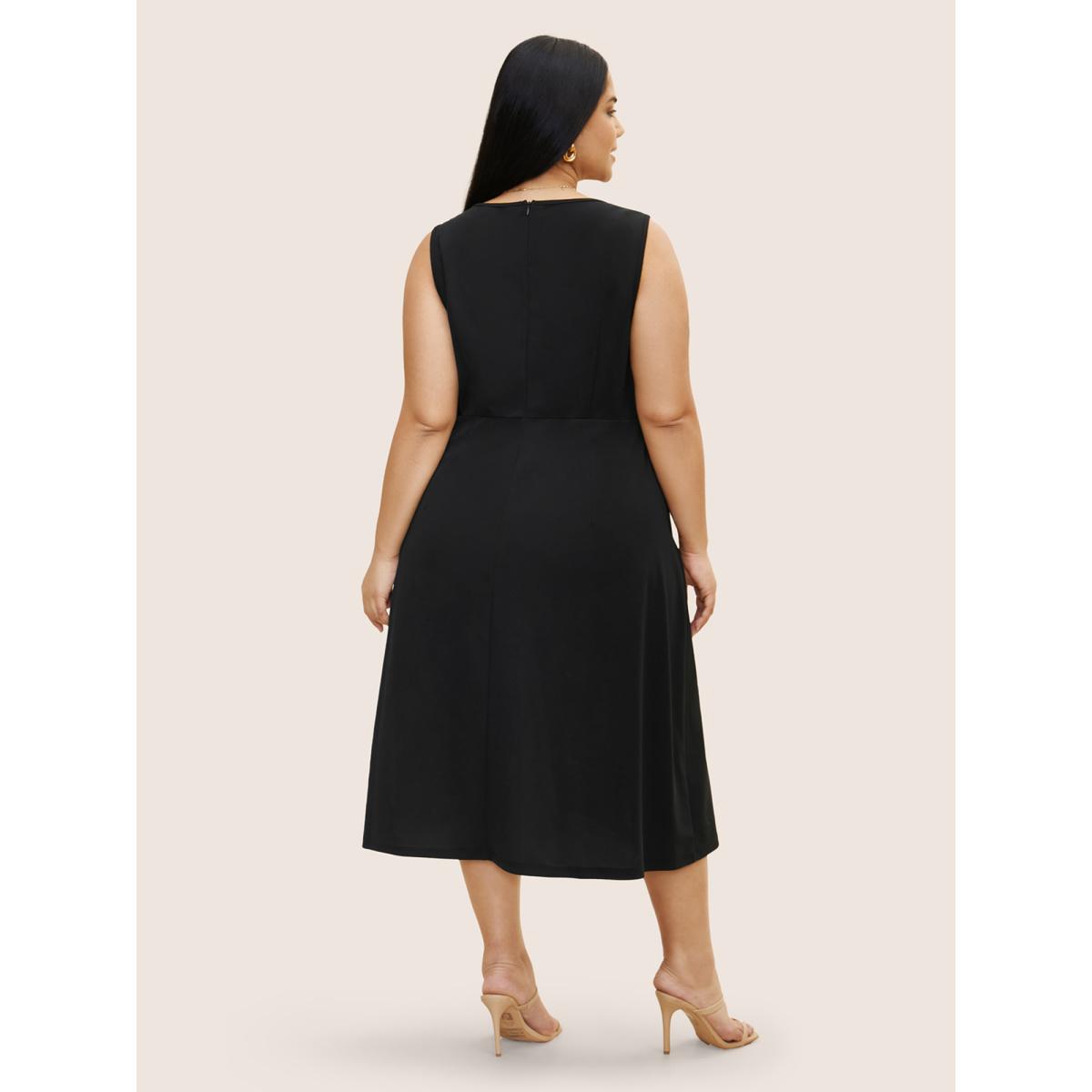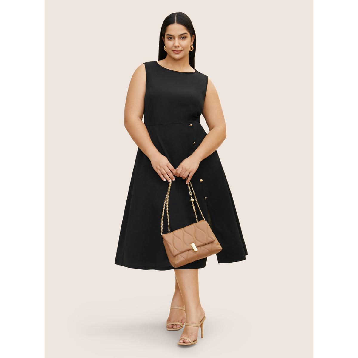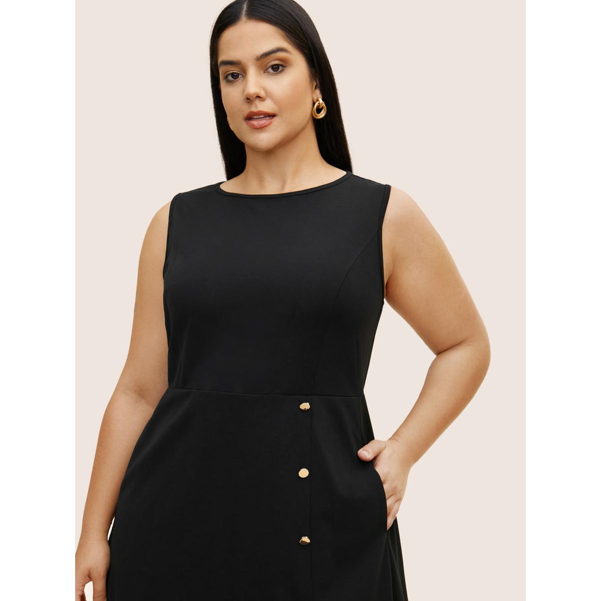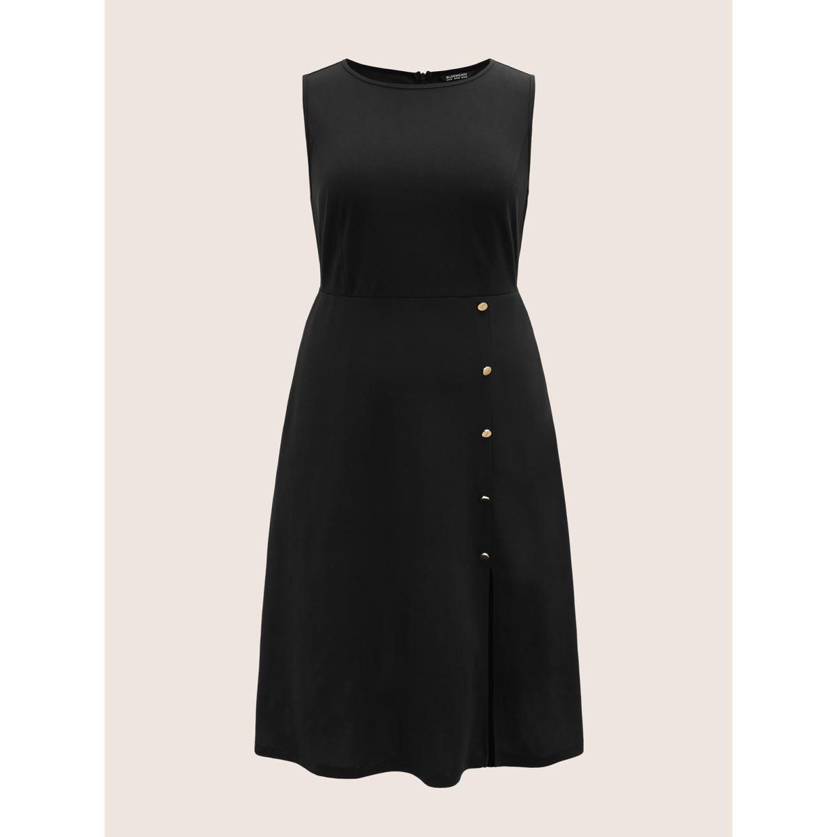 Plus Size Solid Metal Detail Split Hem Sleeveless Dress Black Women At the Office Button Round Neck Sleeveless Curvy BloomChic 22-24/3X