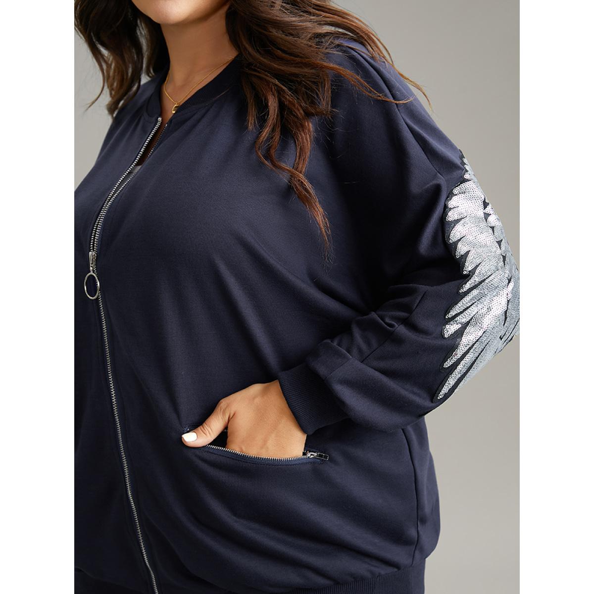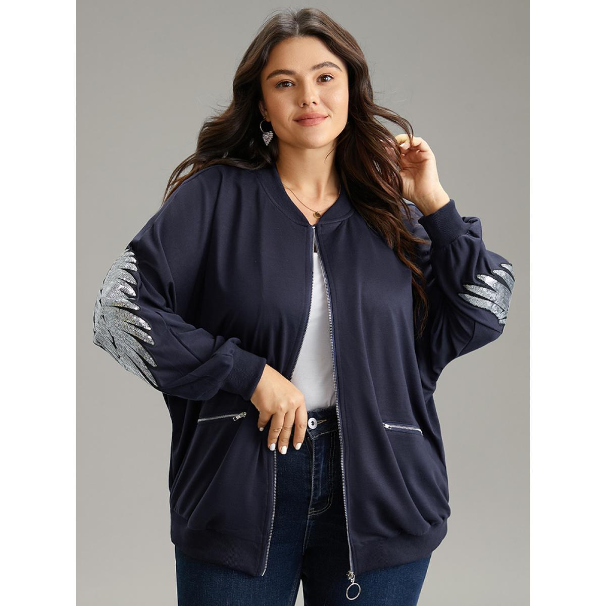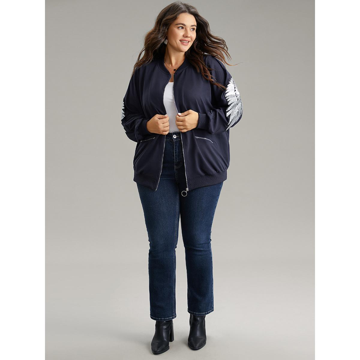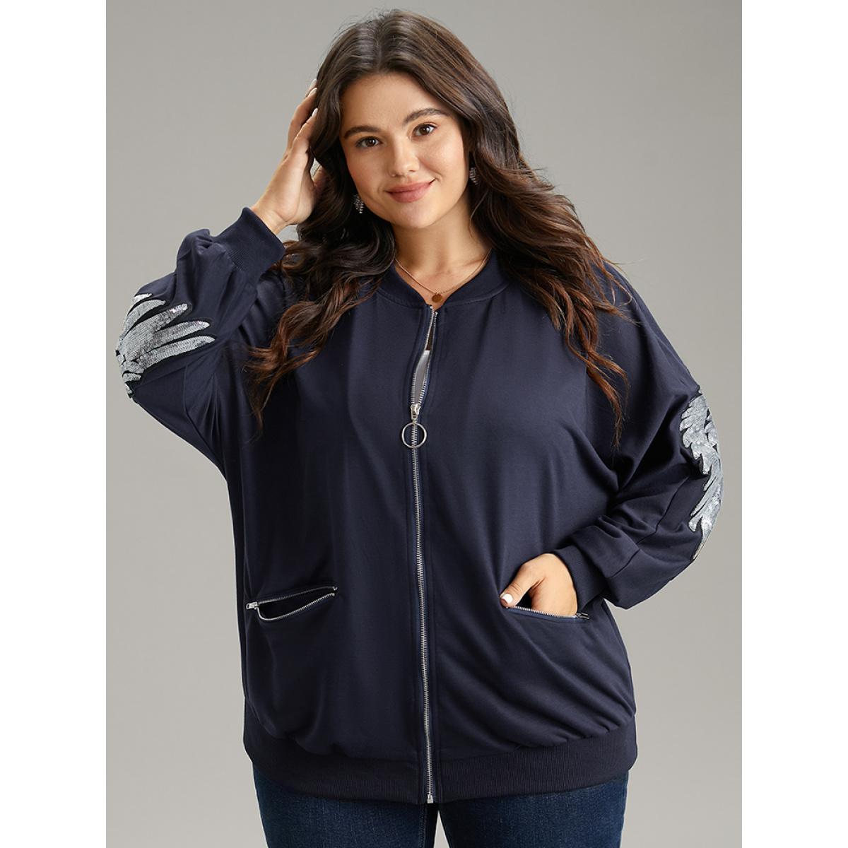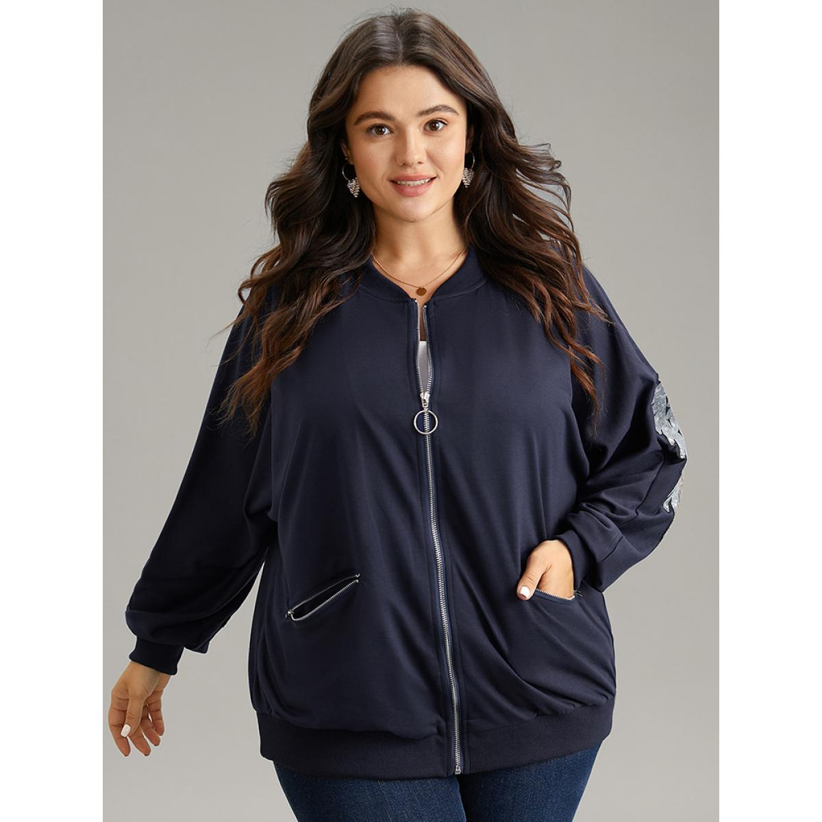 Plus Size Solid O Ring Zipper Pocket Feather Bomber Jacket Women Midnight Elastic cuffs Pocket Everyday Jackets BloomChic 22-24/3X