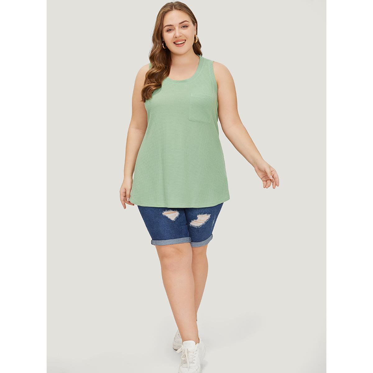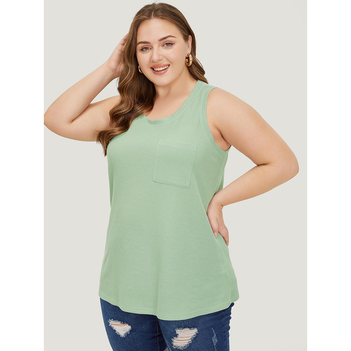 Plus Size Solid Patched Pocket Waffle Knit Tank Top Women Sage Casual Round Neck Dailywear Tank Tops Camis BloomChic 30/6X