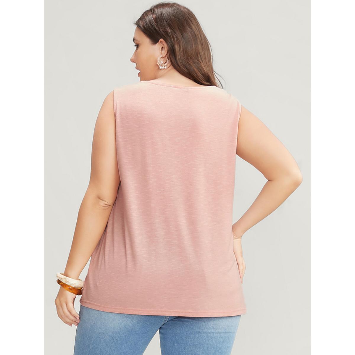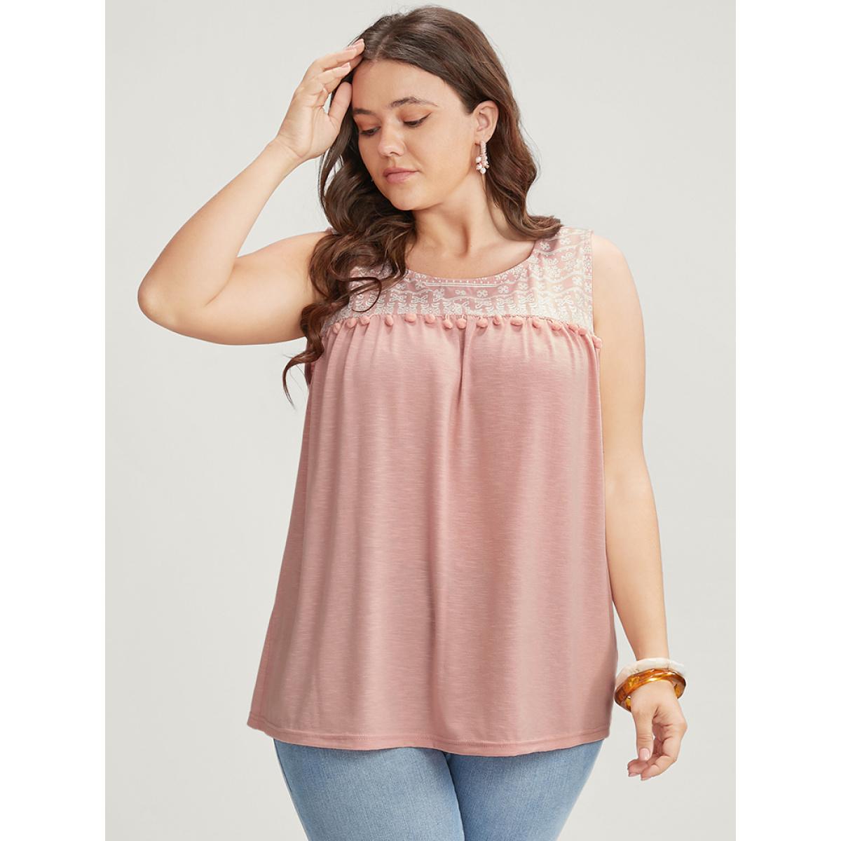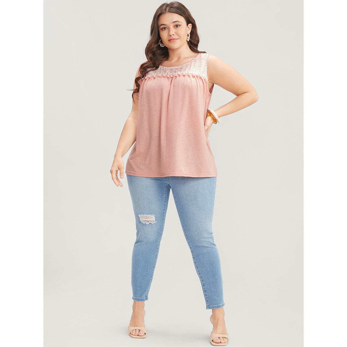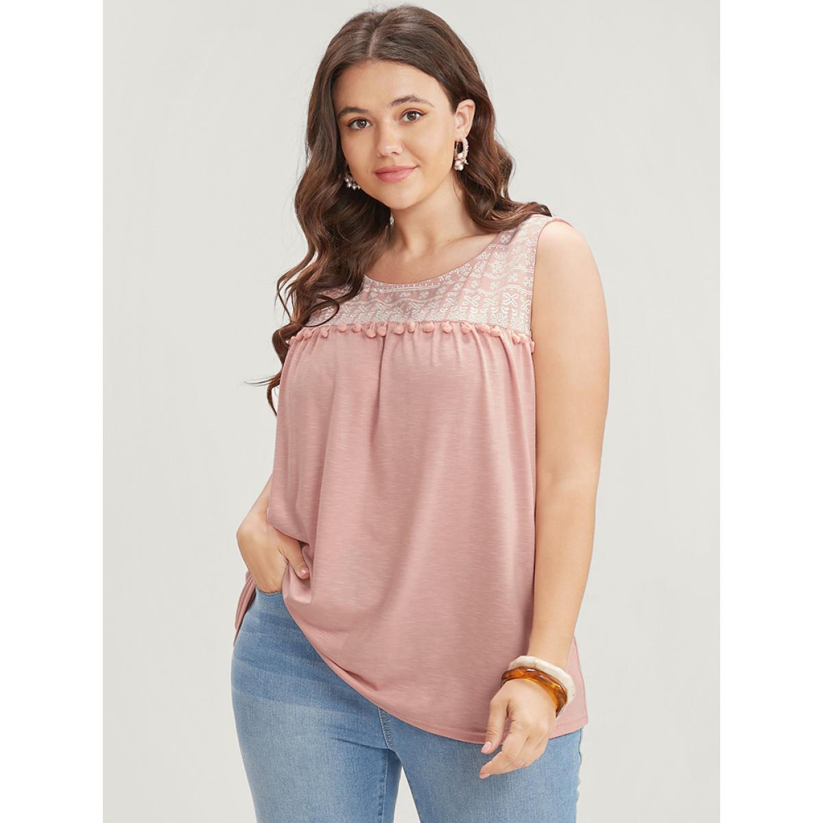 Plus Size Solid Patchwork Sleeveless Pompom Trim Tank Top Women Crepe Vacation Elastic Waist Round Neck Dailywear Tank Tops Camis BloomChic 12/L
