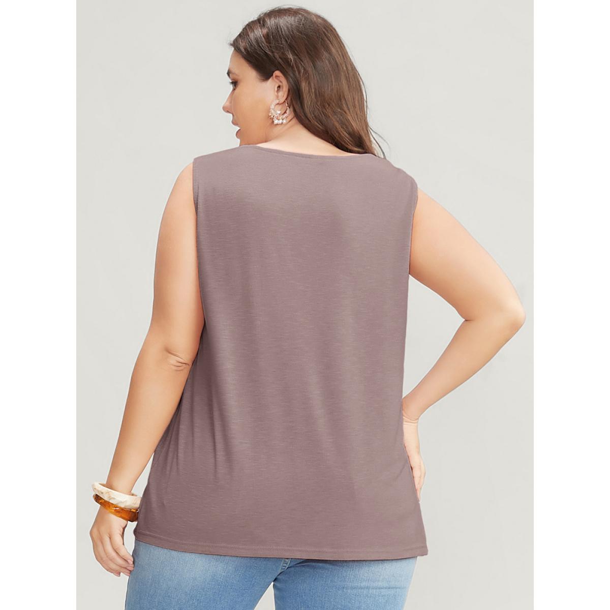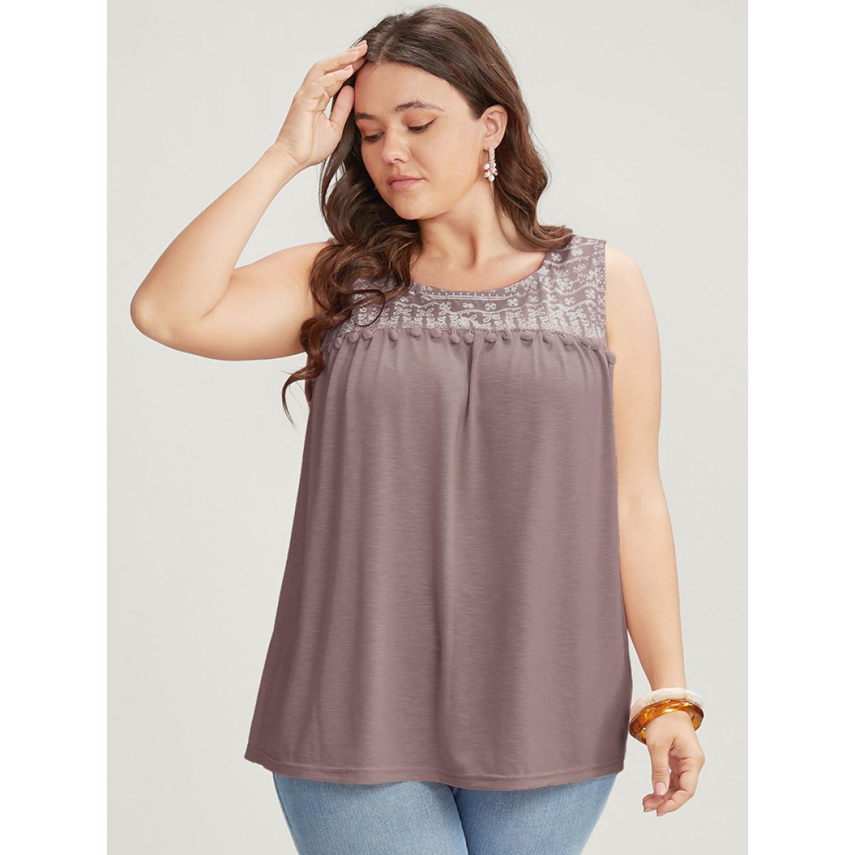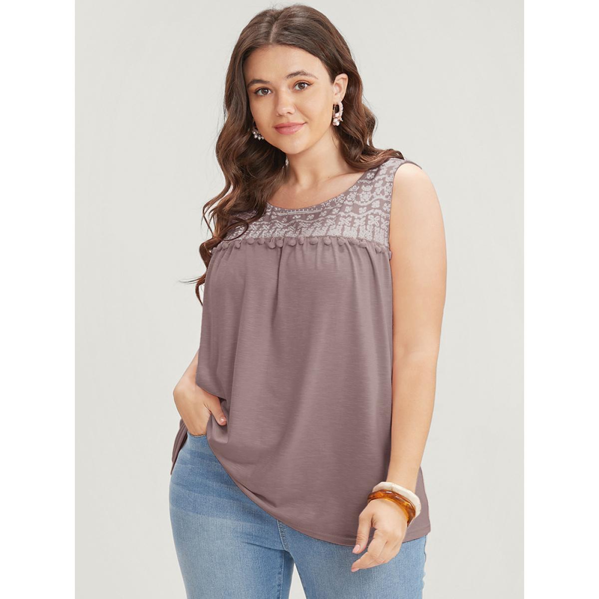 Plus Size Solid Patchwork Sleeveless Pompom Trim Tank Top Women Rouge Vacation Elastic Waist Round Neck Dailywear Tank Tops Camis BloomChic 22-24/3X