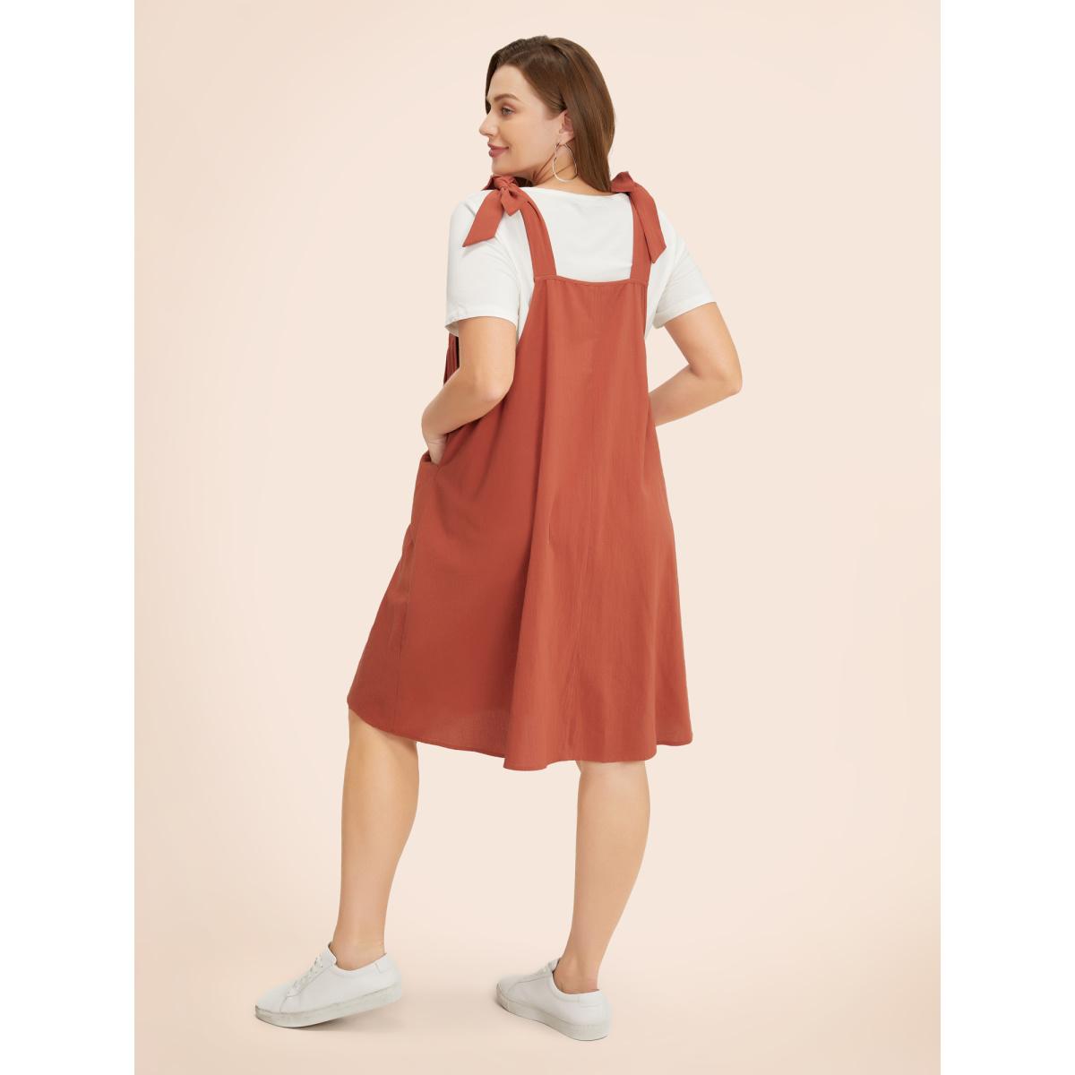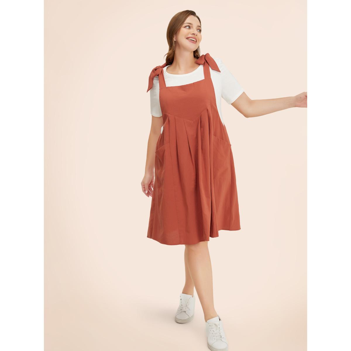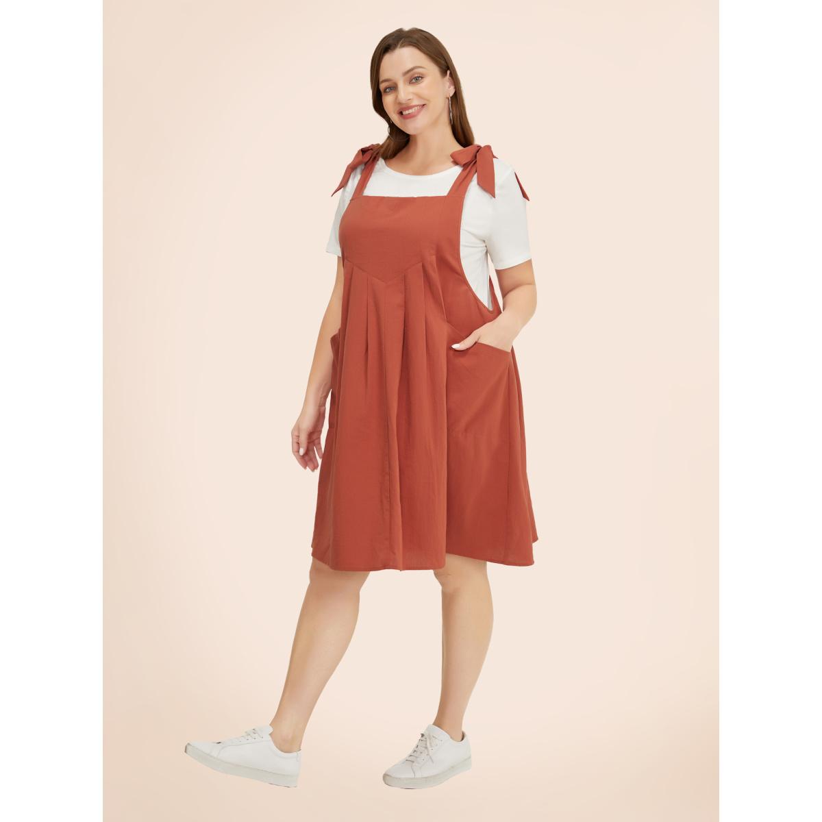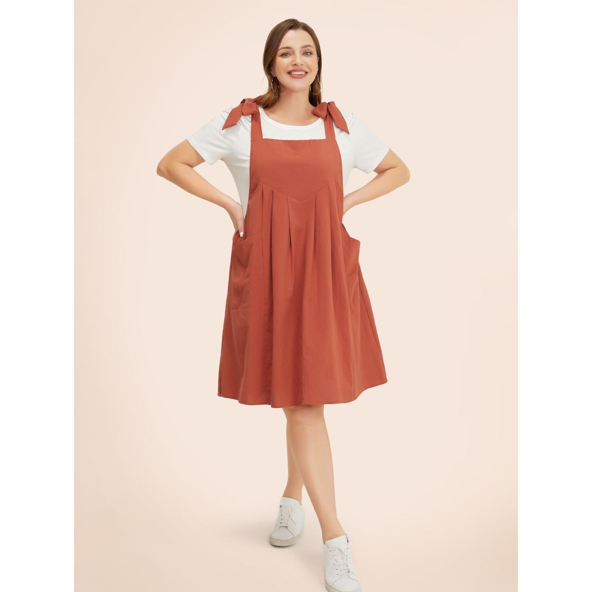 Bloomchic Plus Size Solid Pleated Hem Pocket Tie Shoulder Overall Dress. Shop women's clothing sizes 10-30. Free Shipping Over $69. Free return for the first order. Just shop now. Fit & Sizing: Type: Loose, Stretch: Non-Stretchy, Sleeve Length: Sleeveless, Fit Type: Regular Fit, Dresses Length: Knee Dress. Product Details: Season: Summer, Color: Rust, Black, DarkBrown, Gray, Brown, DarkSlateGray, RedViolet, DustyPink, Stone, ArmyGreen, Cyan, Navy, Style: Casual, Neckline: Spaghetti Strap, Sleeve Type: Sleeveless, Pattern Type: Plain, Details: Pocket, Knotted, Pleated, Pocket: It is perfectly sized to carry a phone., Belt: No-belt. Materials & Care: Fabric Composition: 100%Cotton, Care: Machine wash cold gentle cycle, Do not bleach, Do not tumble dry, Iron on low heat, Wash with like colors.