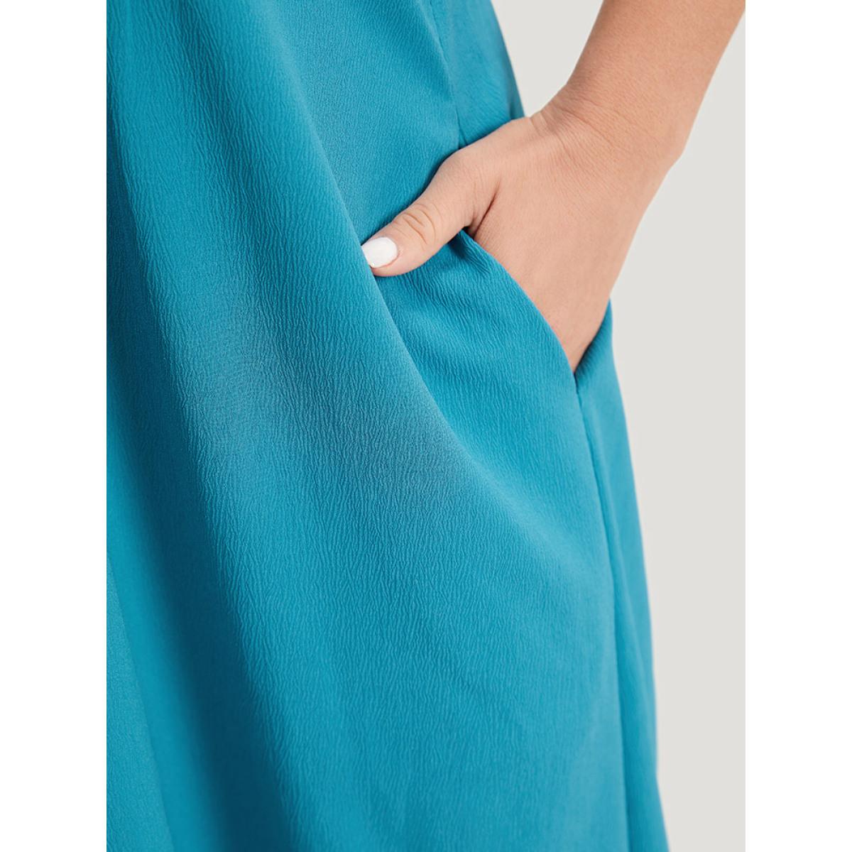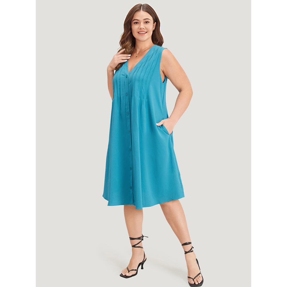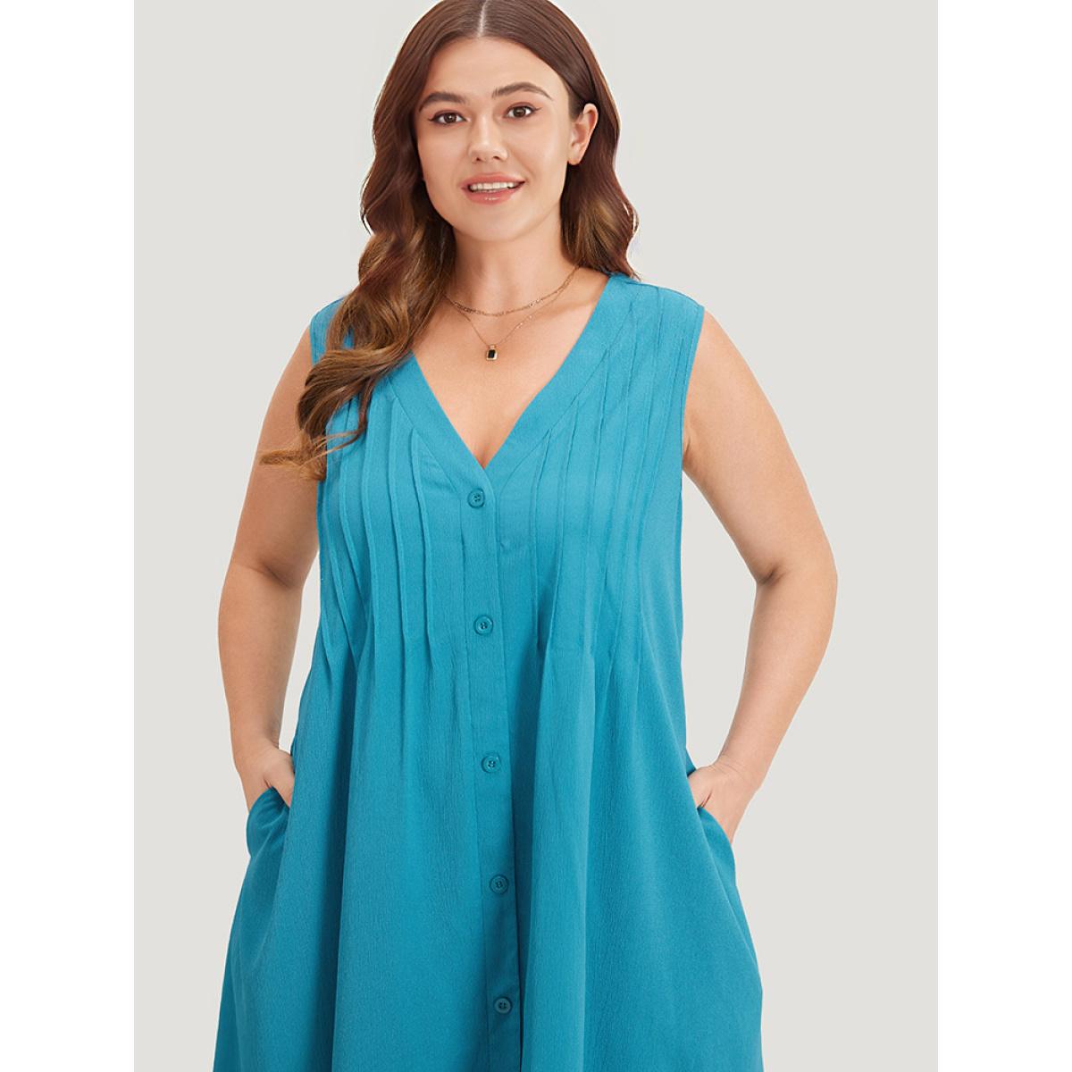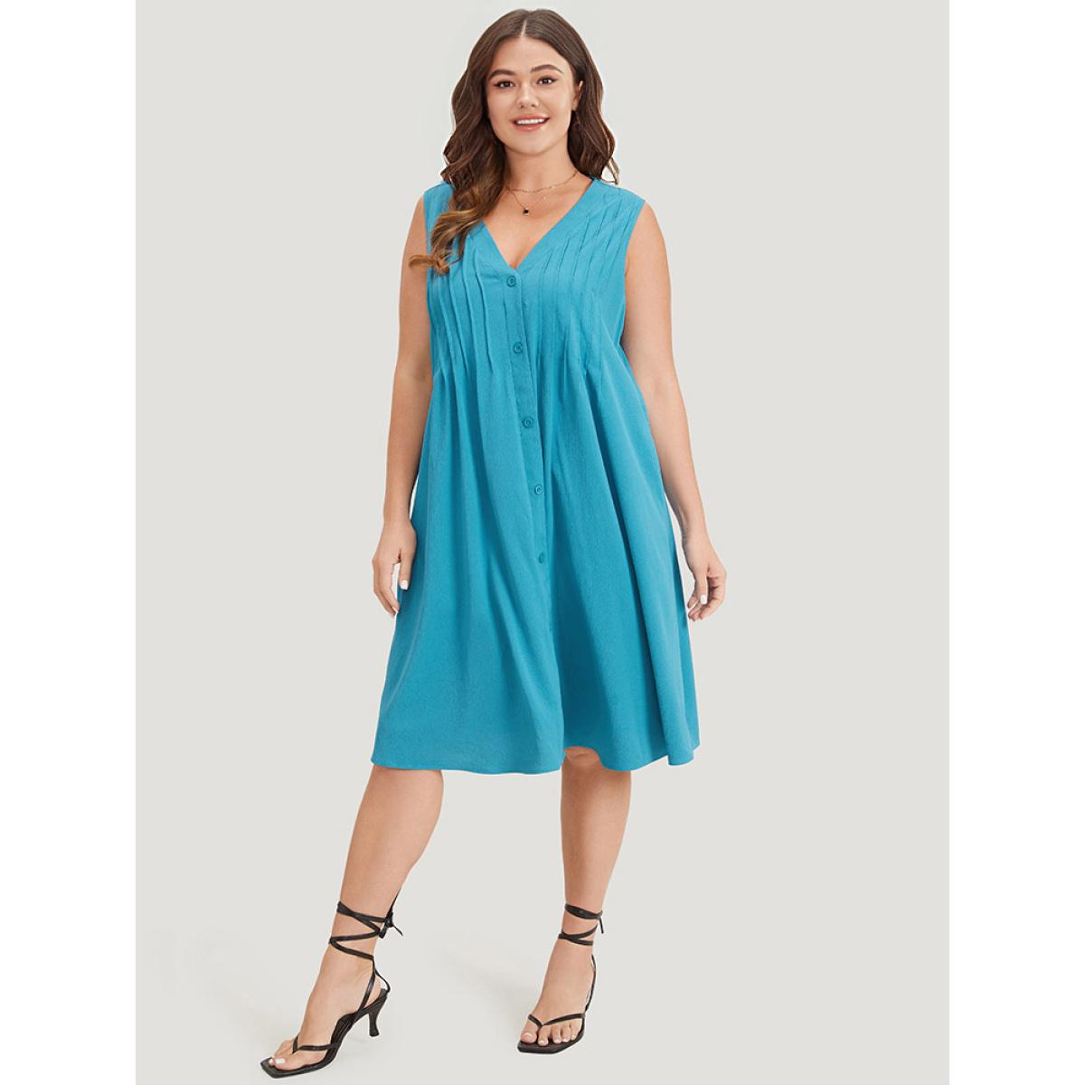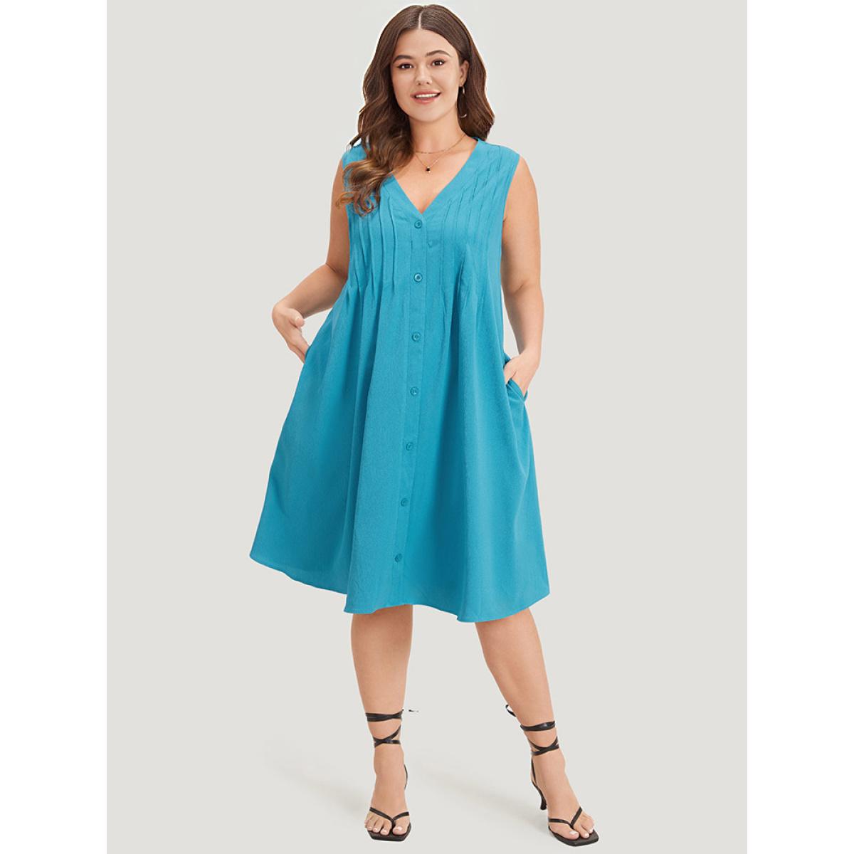 Plus Size Solid Plicated Detail Button Through Tank Dress Cerulean Women Vacation Button V-neck Sleeveless Curvy Knee Dress BloomChic 12/L