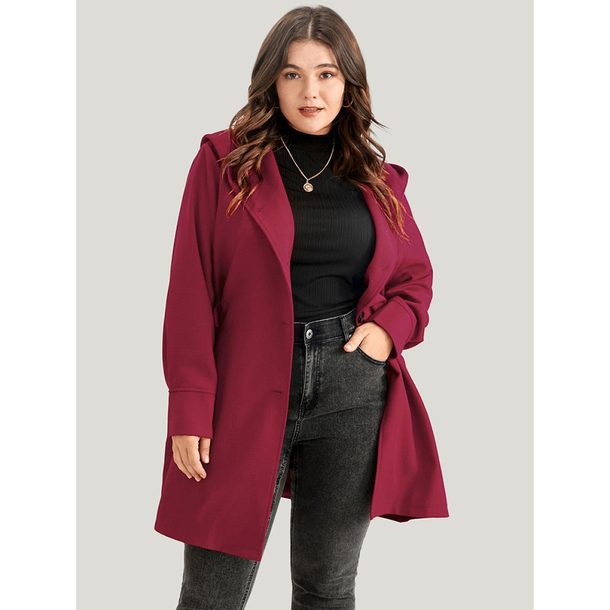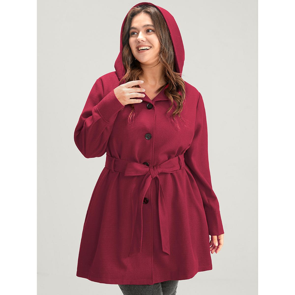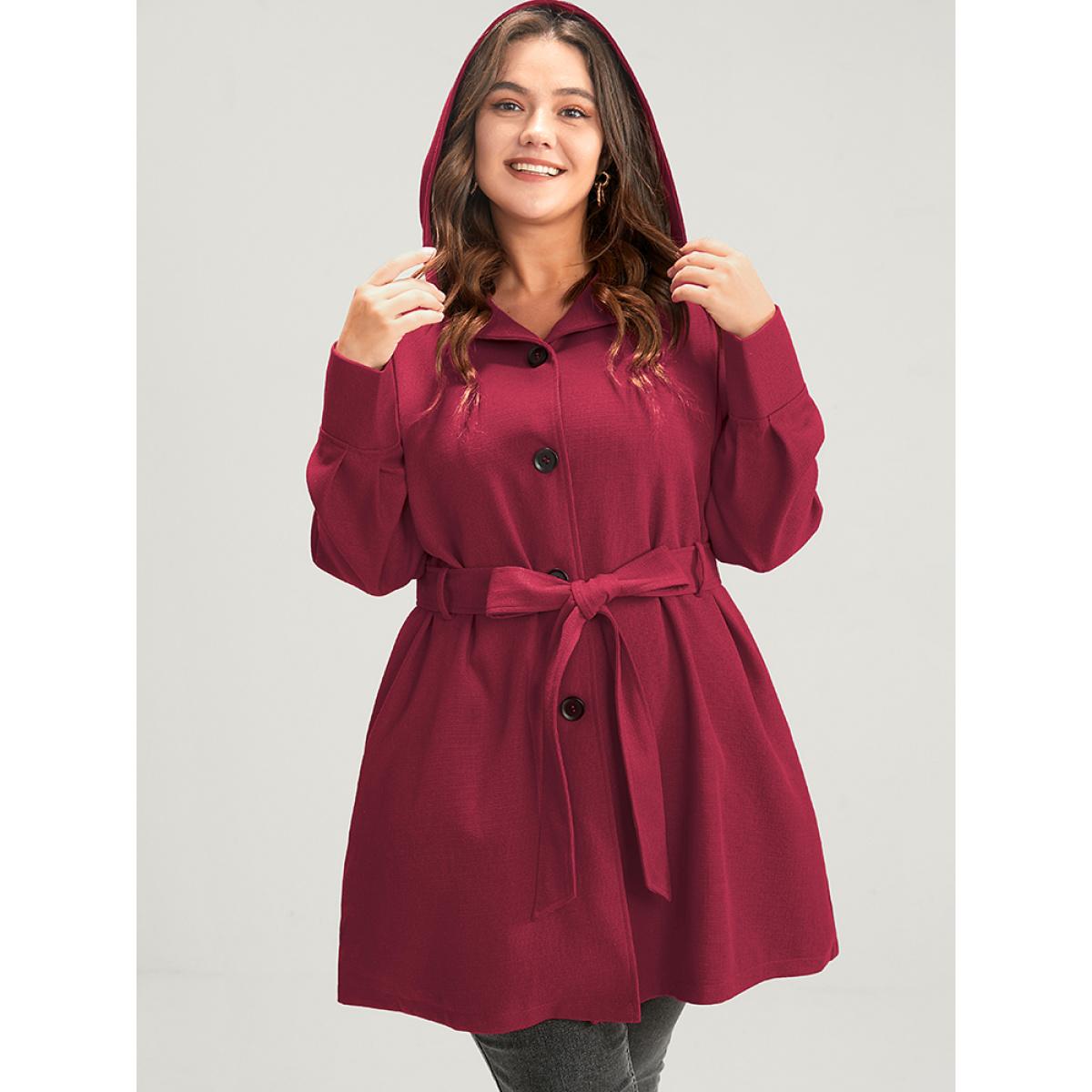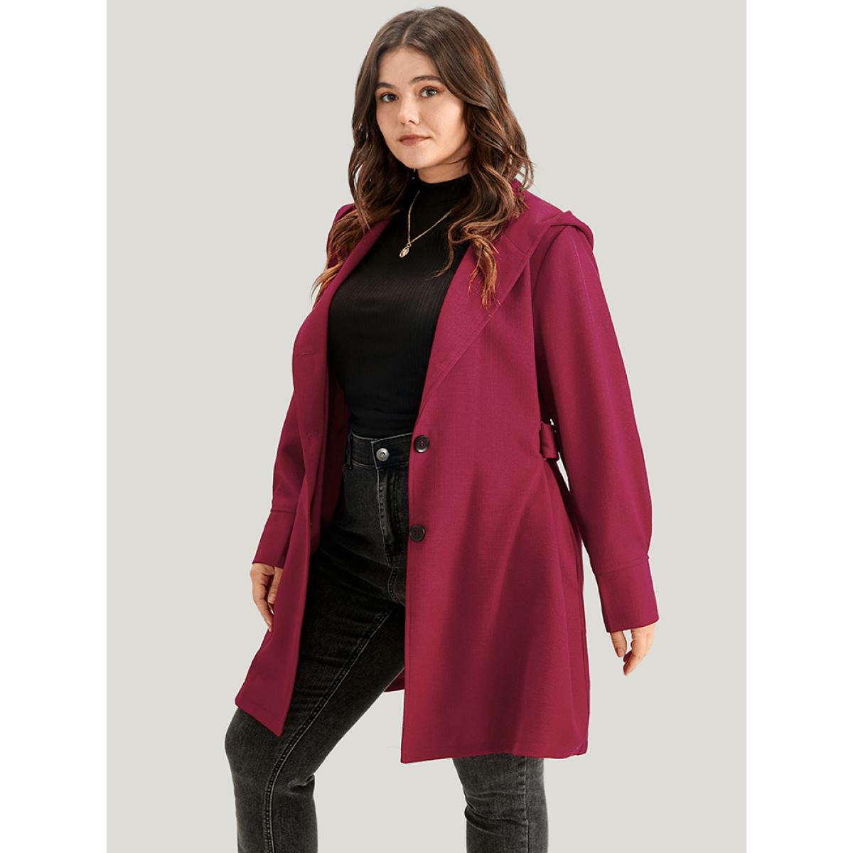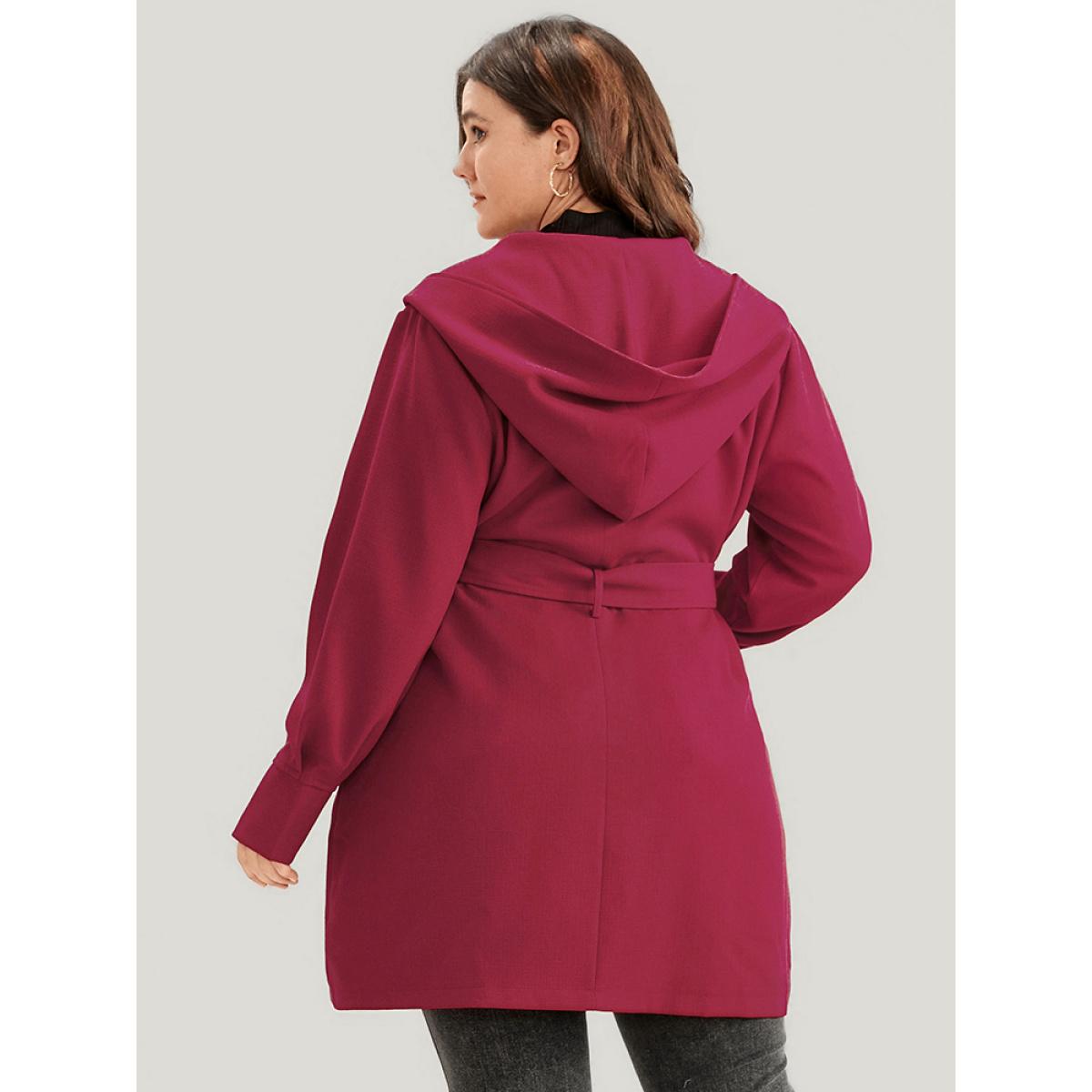 Plus Size Solid Pocket Button Up Belted Hooded Coat Women Raspberry Casual Button Ladies Dailywear Winter Coats BloomChic 22-24/3X