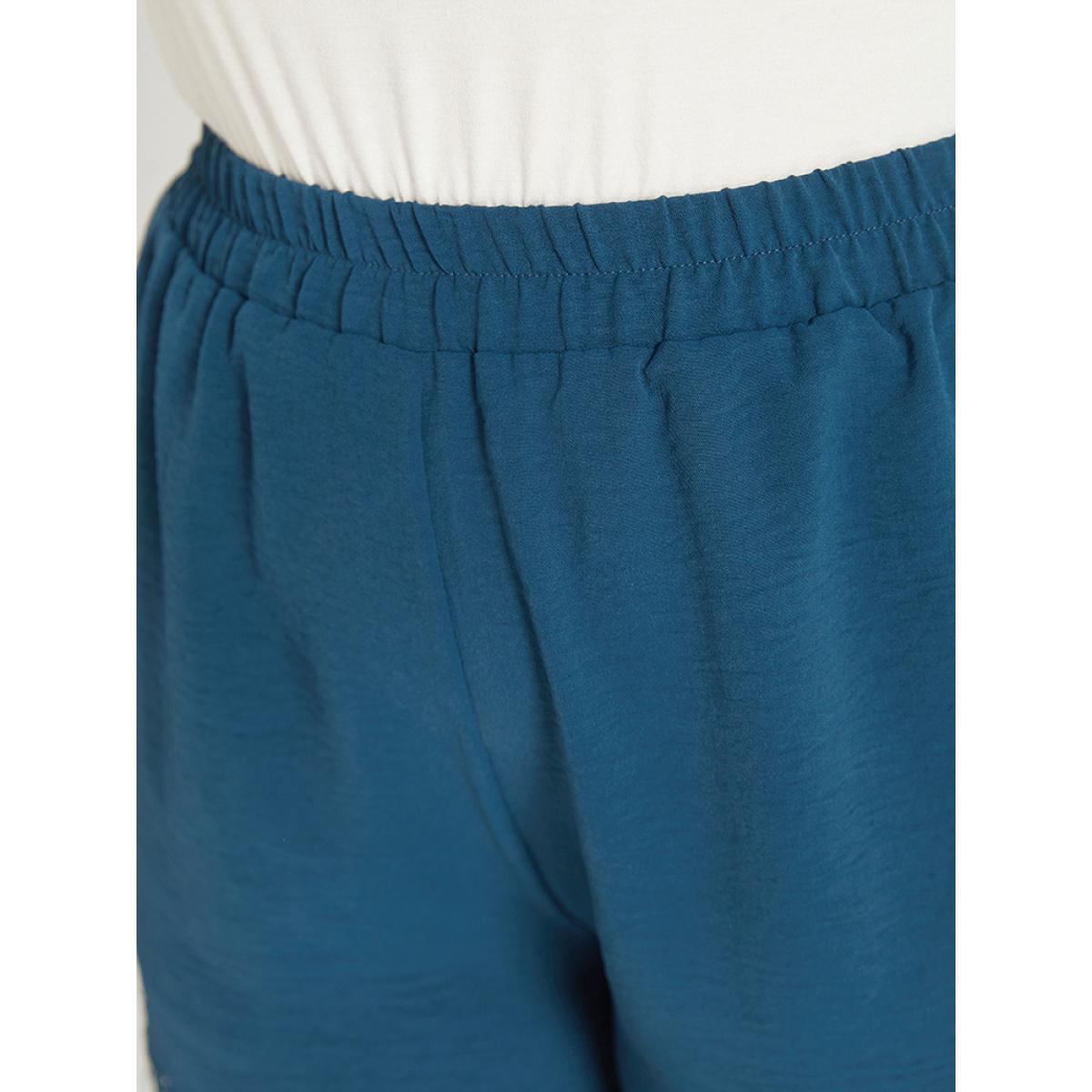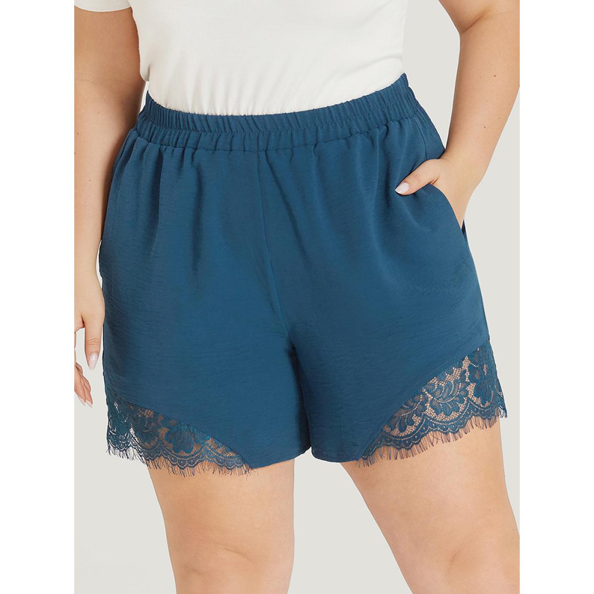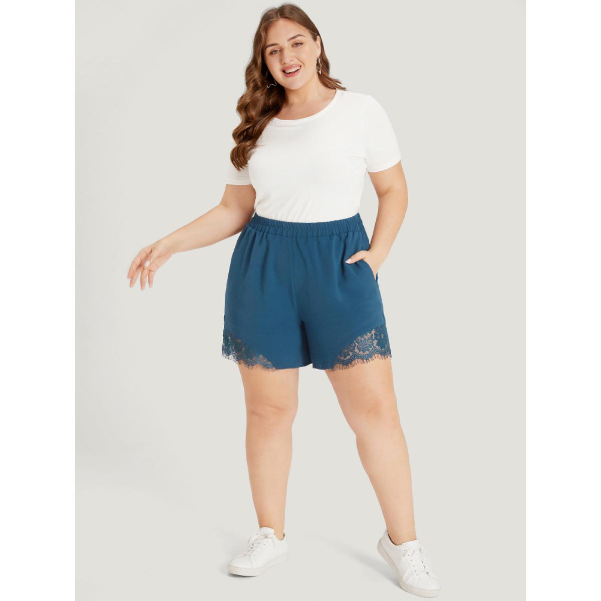 Plus Size Solid Pocket Lace Insert Elastic Waist Shorts Women Aegean Casual Patchwork Dailywear Shorts BloomChic 12/L