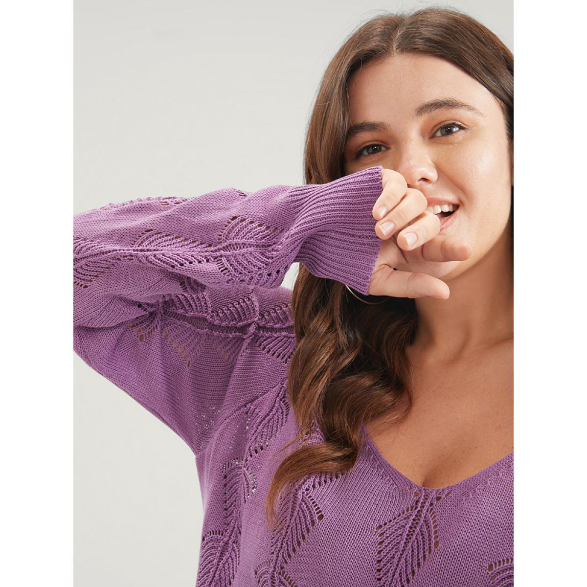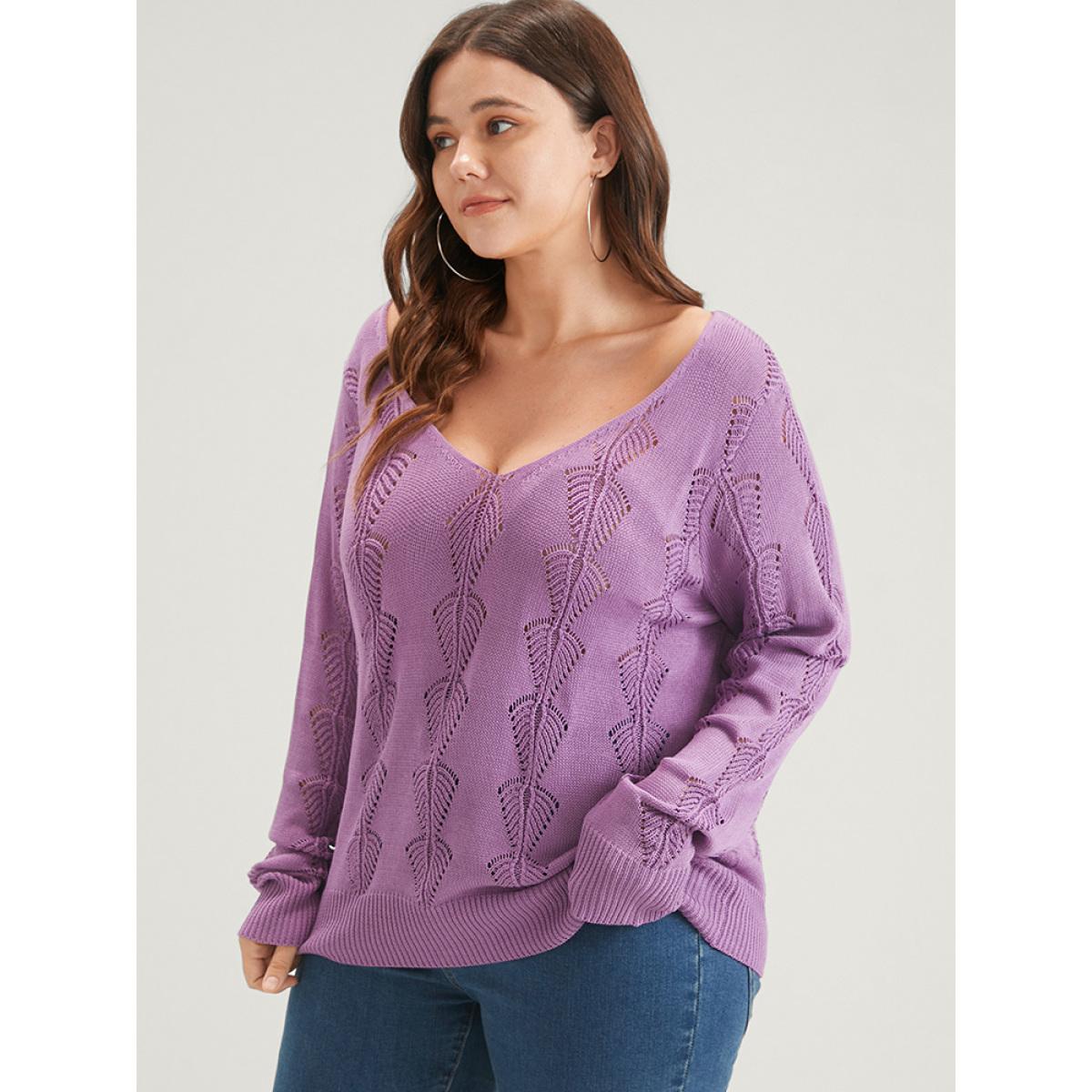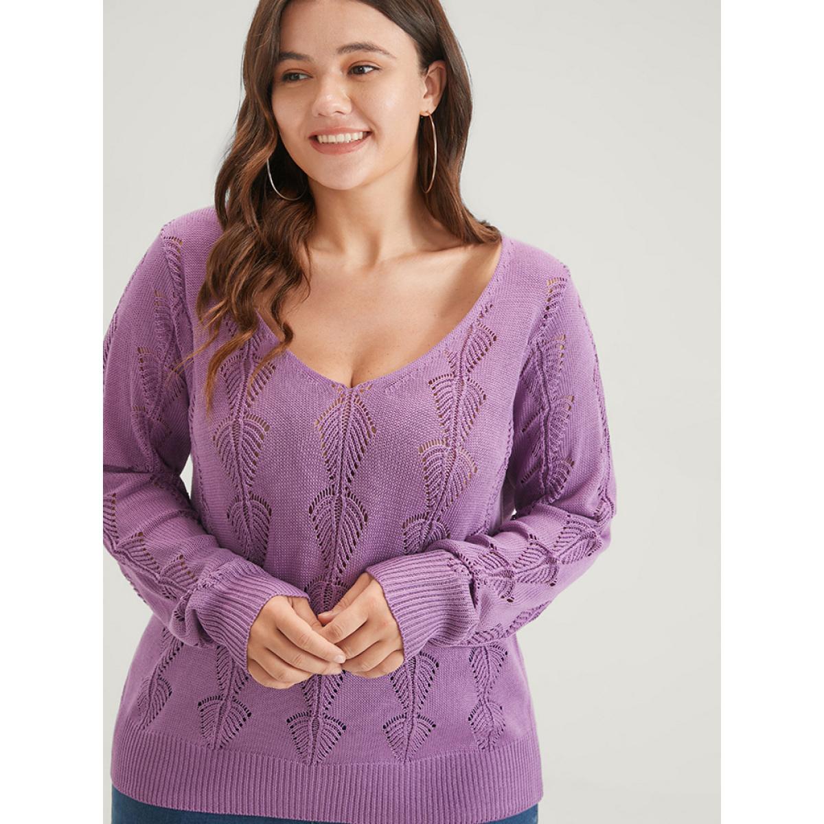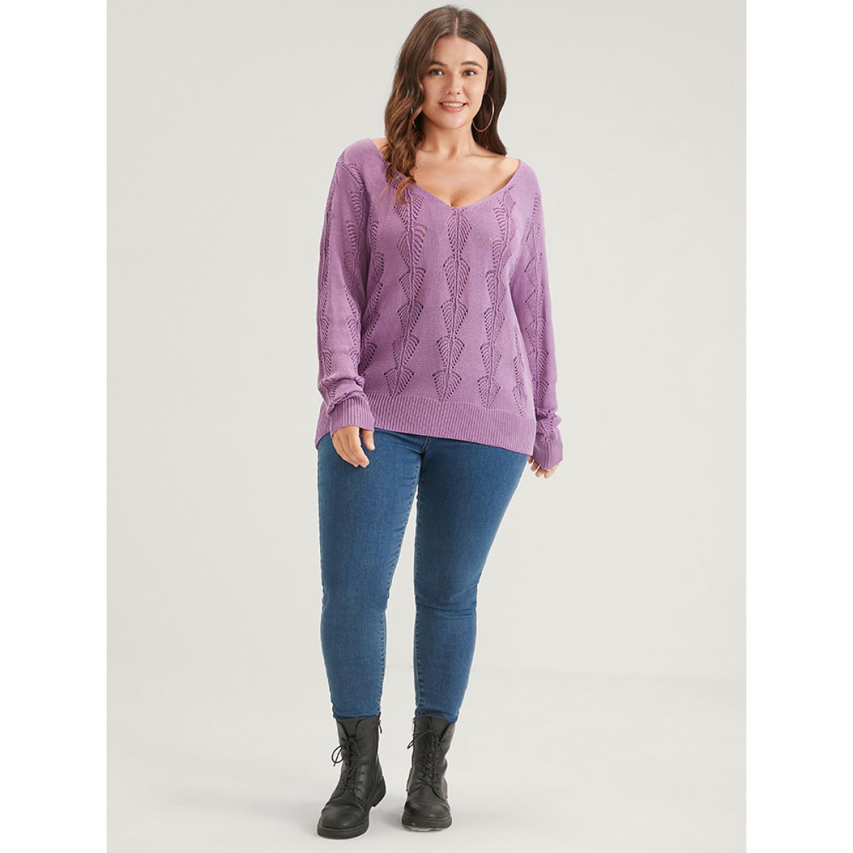 Plus Size Solid Pointelle Knit Deep V Neck Crochet Sweater RedViolet Women Elegant Long Sleeve Deep V-neck Dailywear Pullovers BloomChic 28/5X