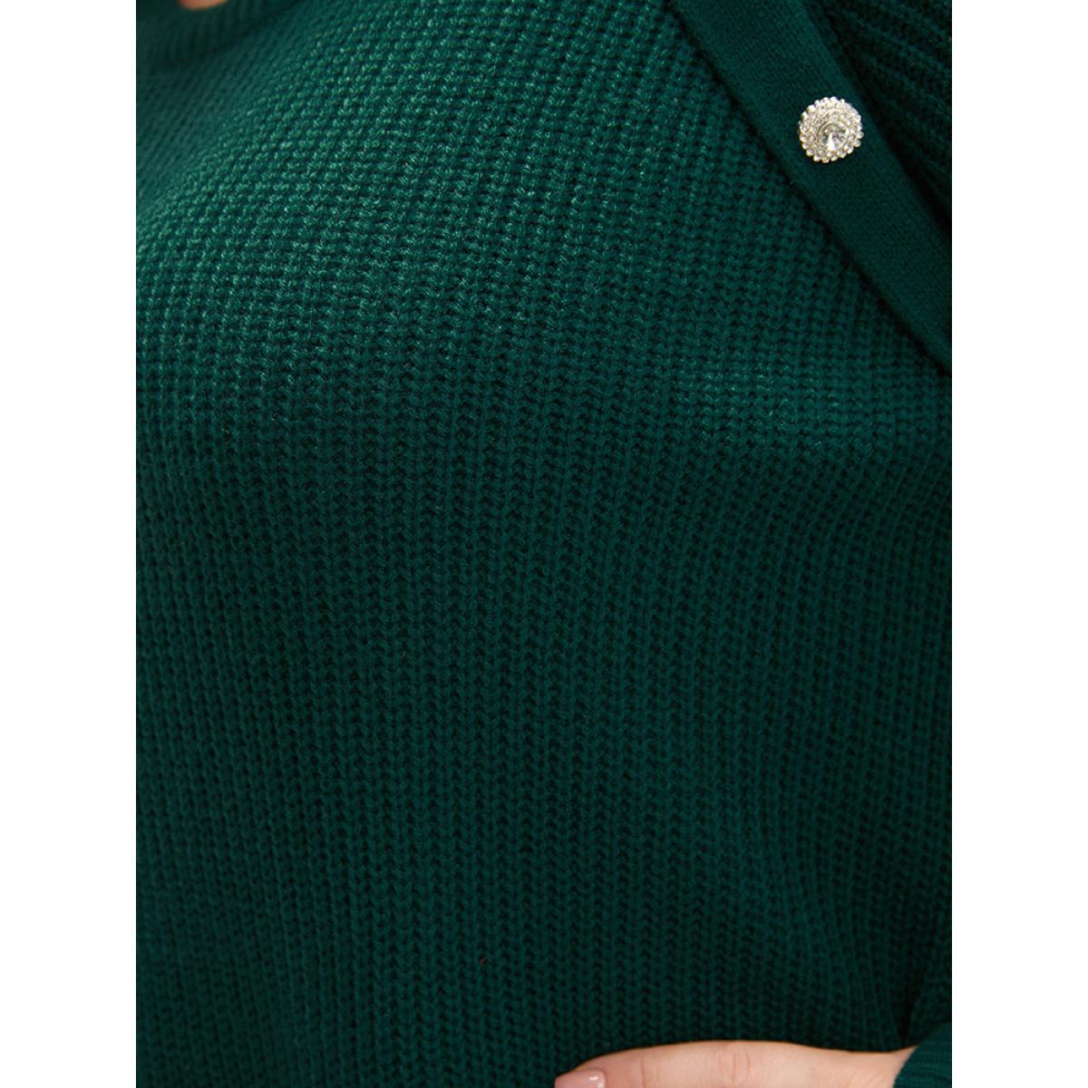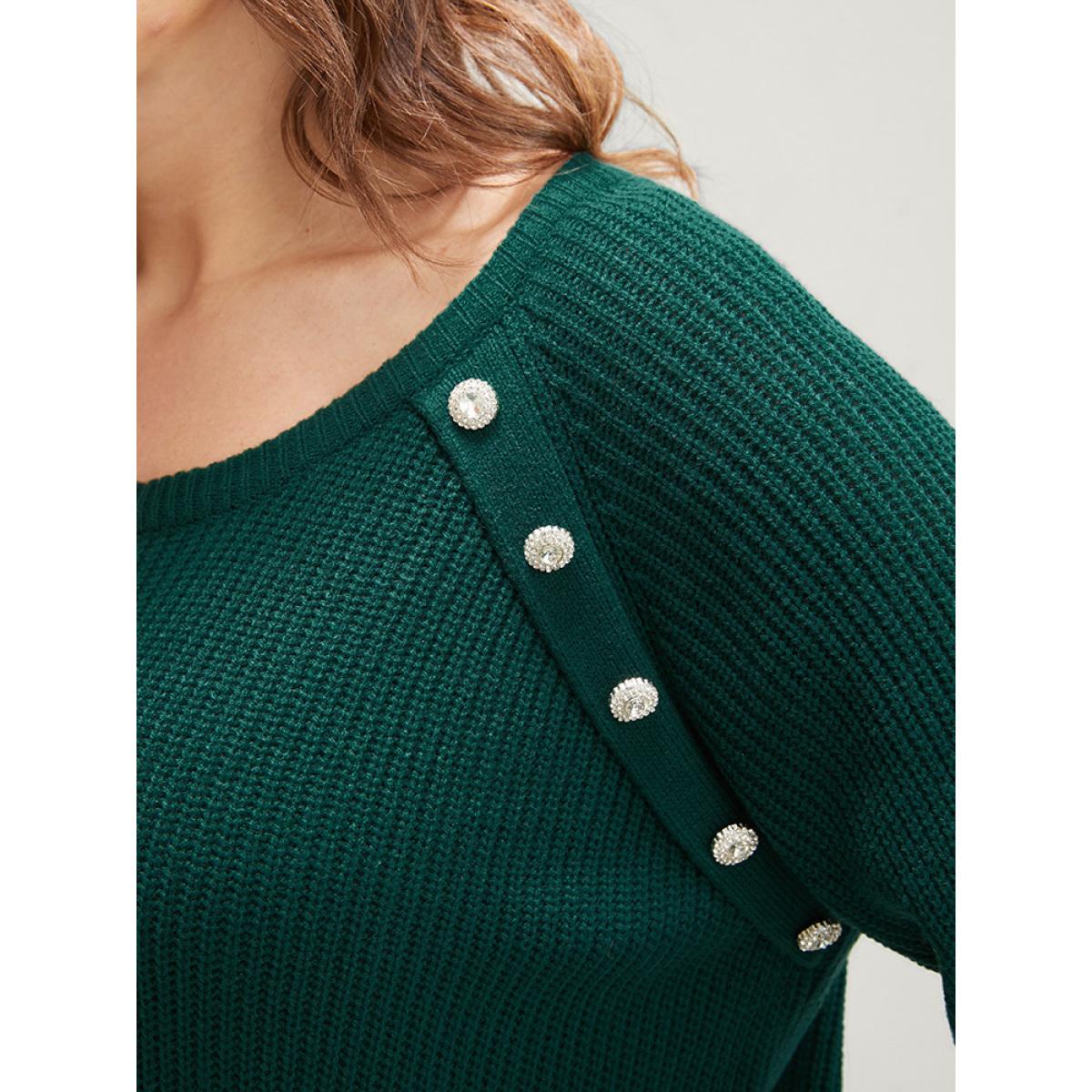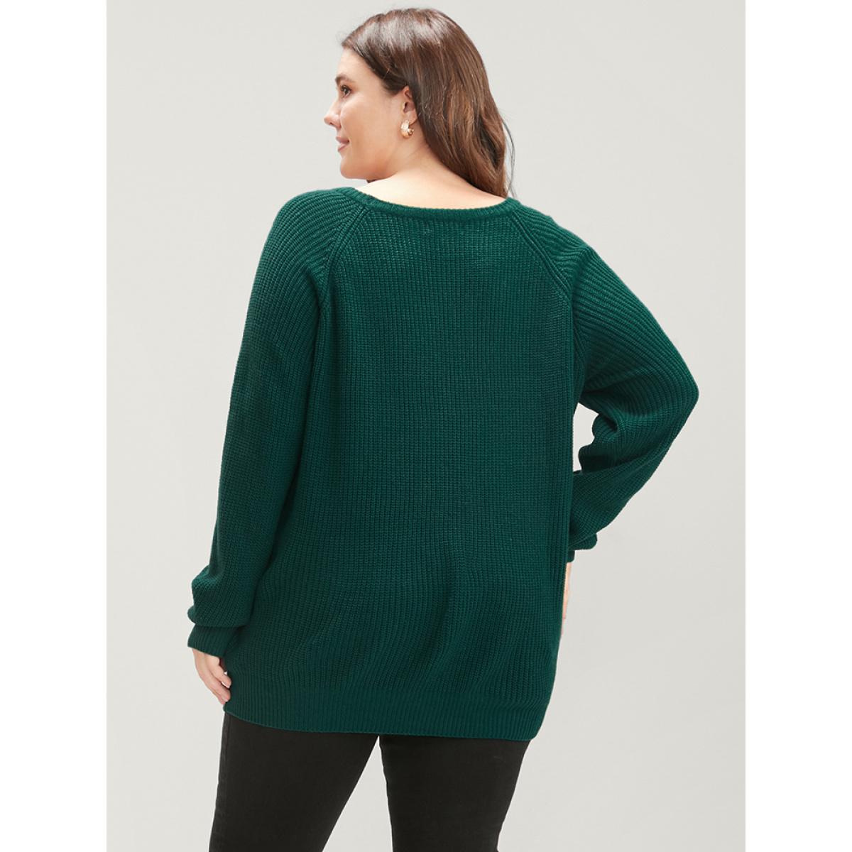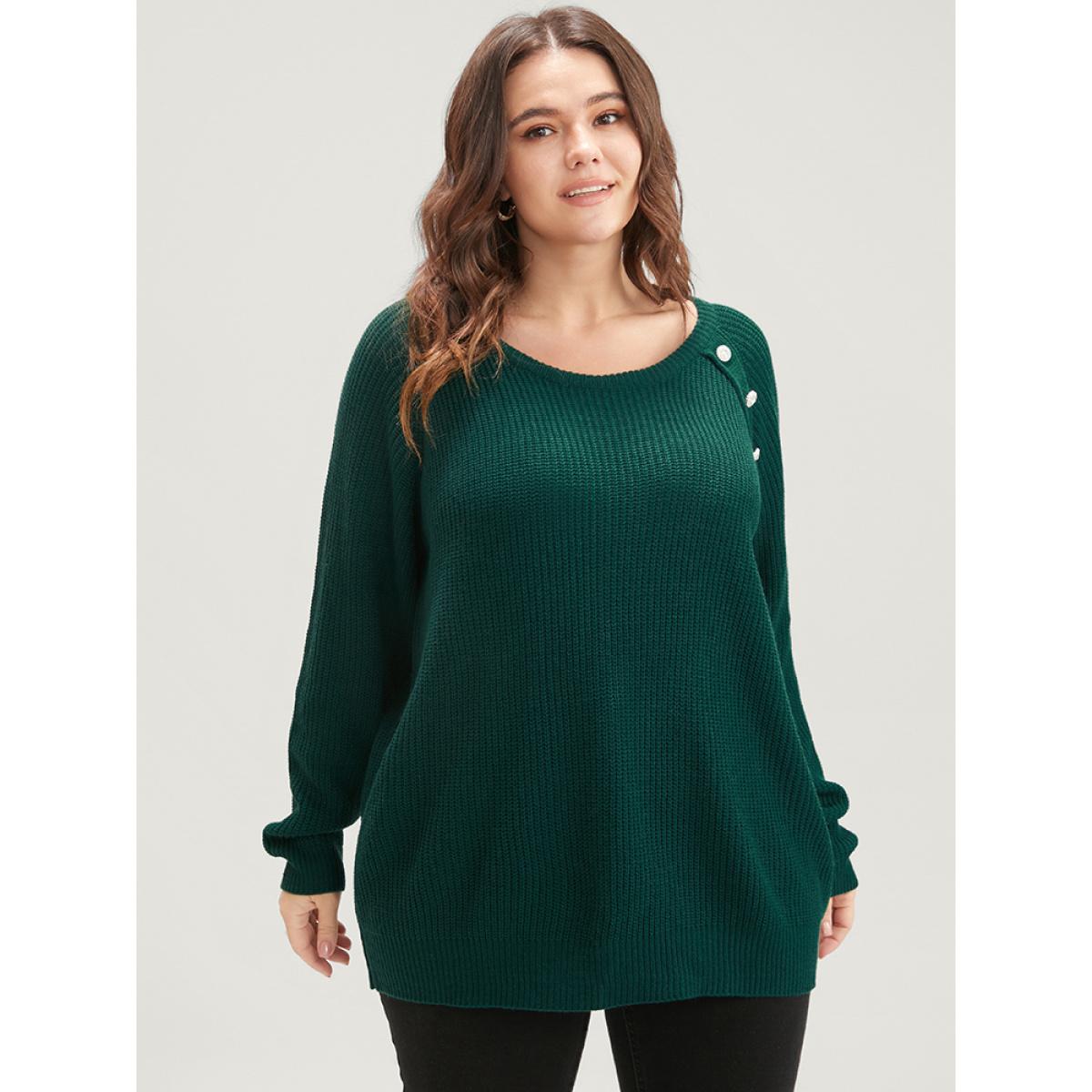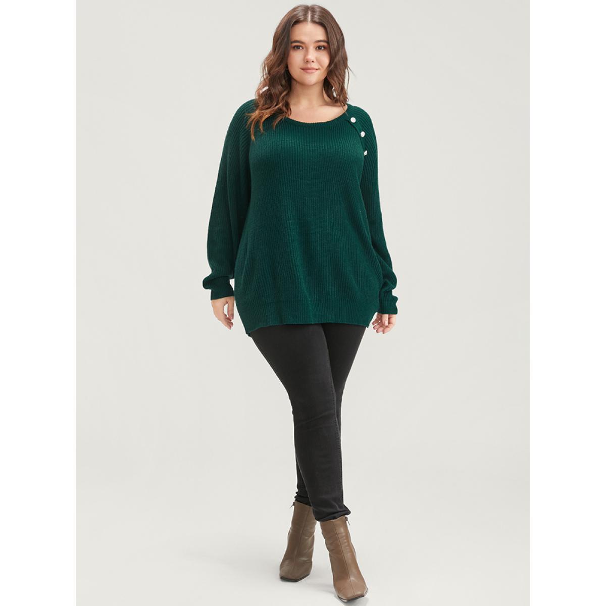 Plus Size Solid Pointelle Knit Raglan Sleeve Button Detail Knit Top Emerald Women Casual Loose Long Sleeve Round Neck Dailywear Pullovers BloomChic 18-20/2X